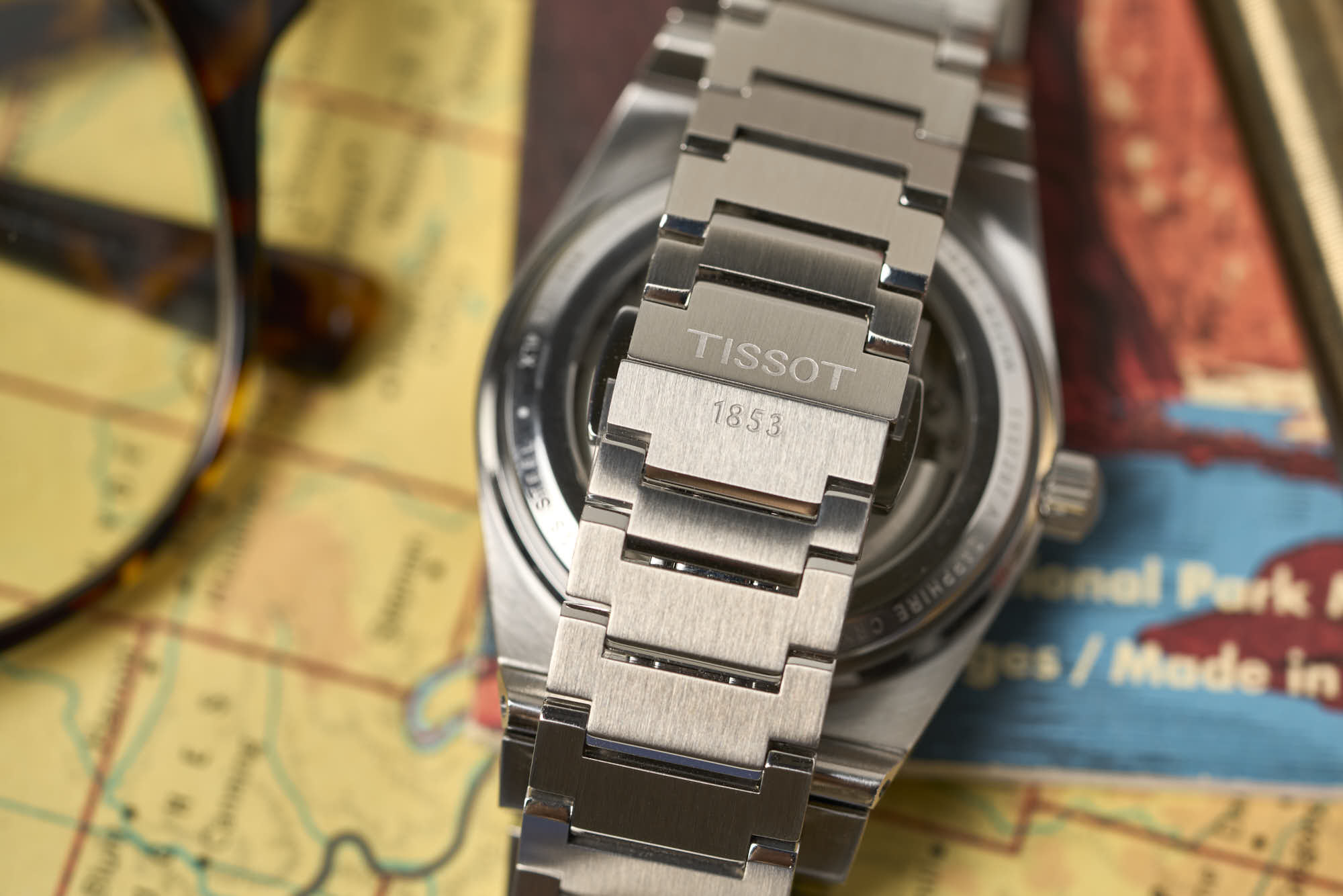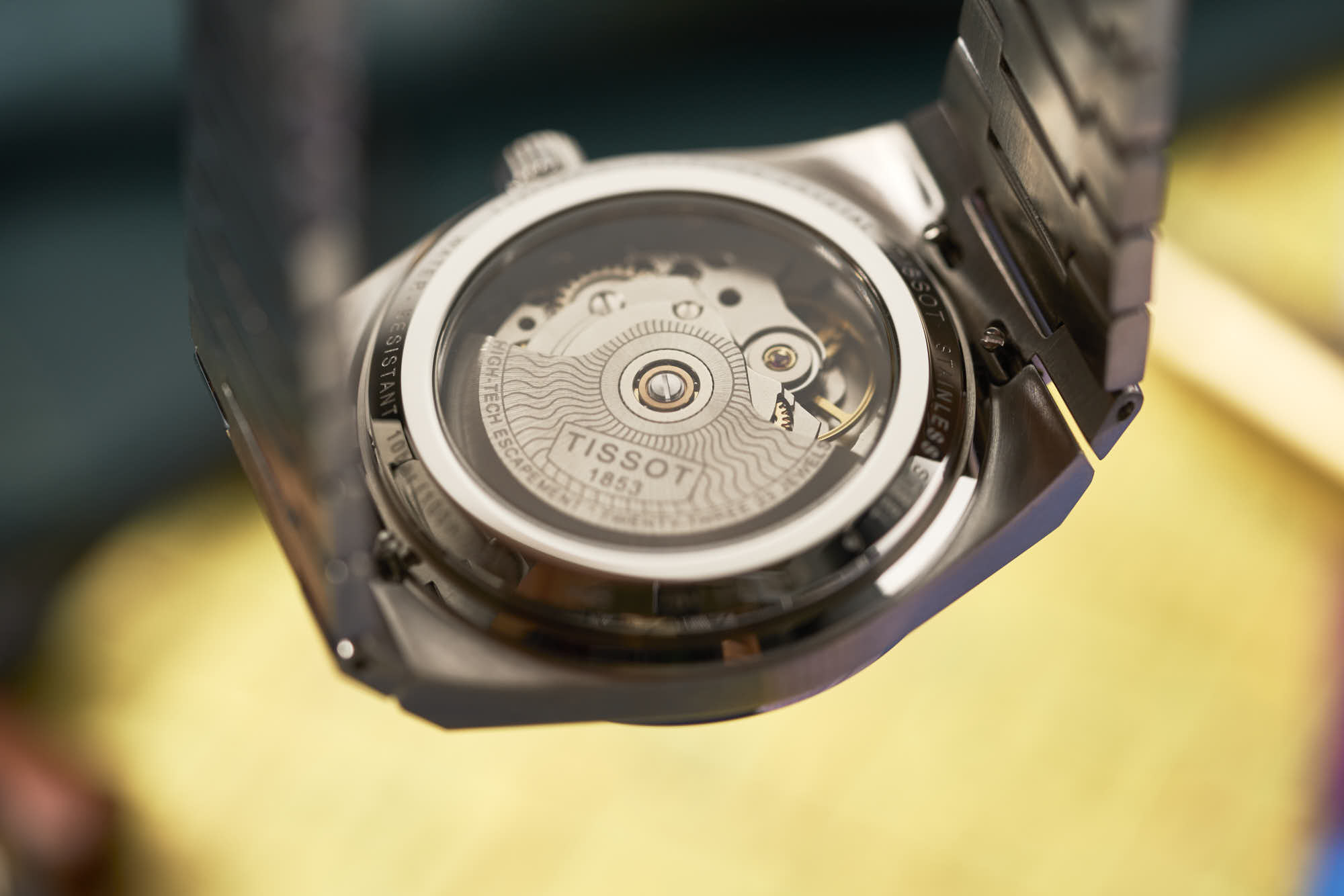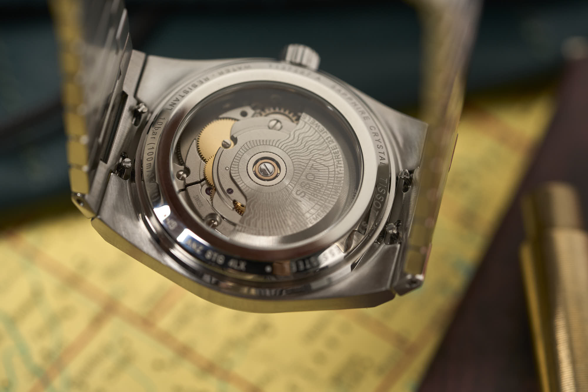 Powering the Tissot PRX is the Powermatic 80.111 Swiss-made automatic movement. Featuring an impressive 80-hour power reserve, the Powermatic 80.111 is a 23-jewel movement with hacking seconds, date, Nivachron balance spring, and a frequency of 21,600 bph. Visible through the display case back, the Powermatic 80.111 has a nicely decorated rotor.