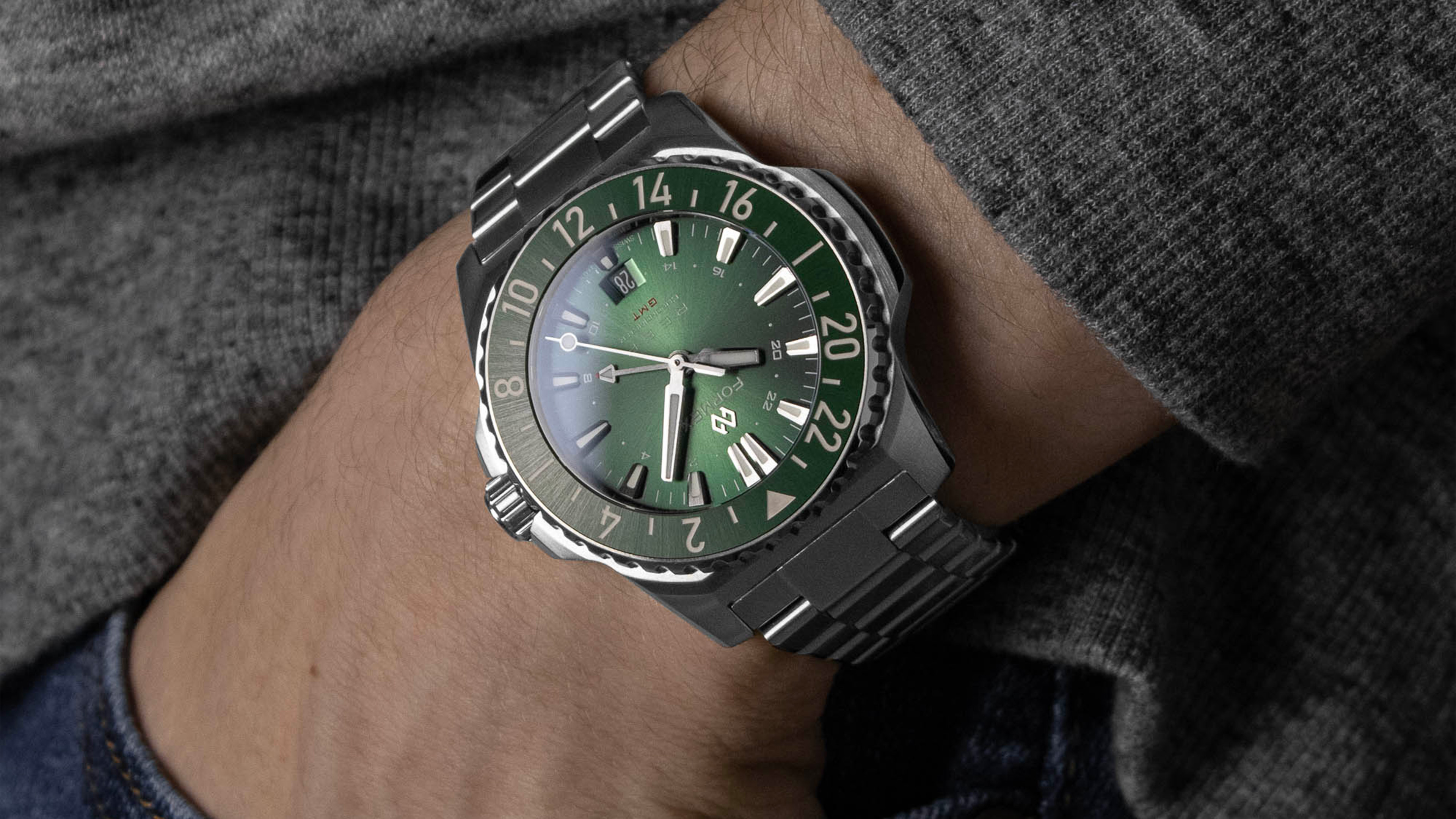 Powering the Reef GMT is a COSC-certified Sellita SW330-2 automatic movement, delivering chronometer-grade accuracy and a power reserve of approximately 56 hours. A fourth GMT hand allows you to track an additional time zone via the 24-hour scale on the bezel, with independent setting functionality. It’s a reliable, Swiss-made engine tailored for precision whether you're flying, diving, or commuting across continents.
