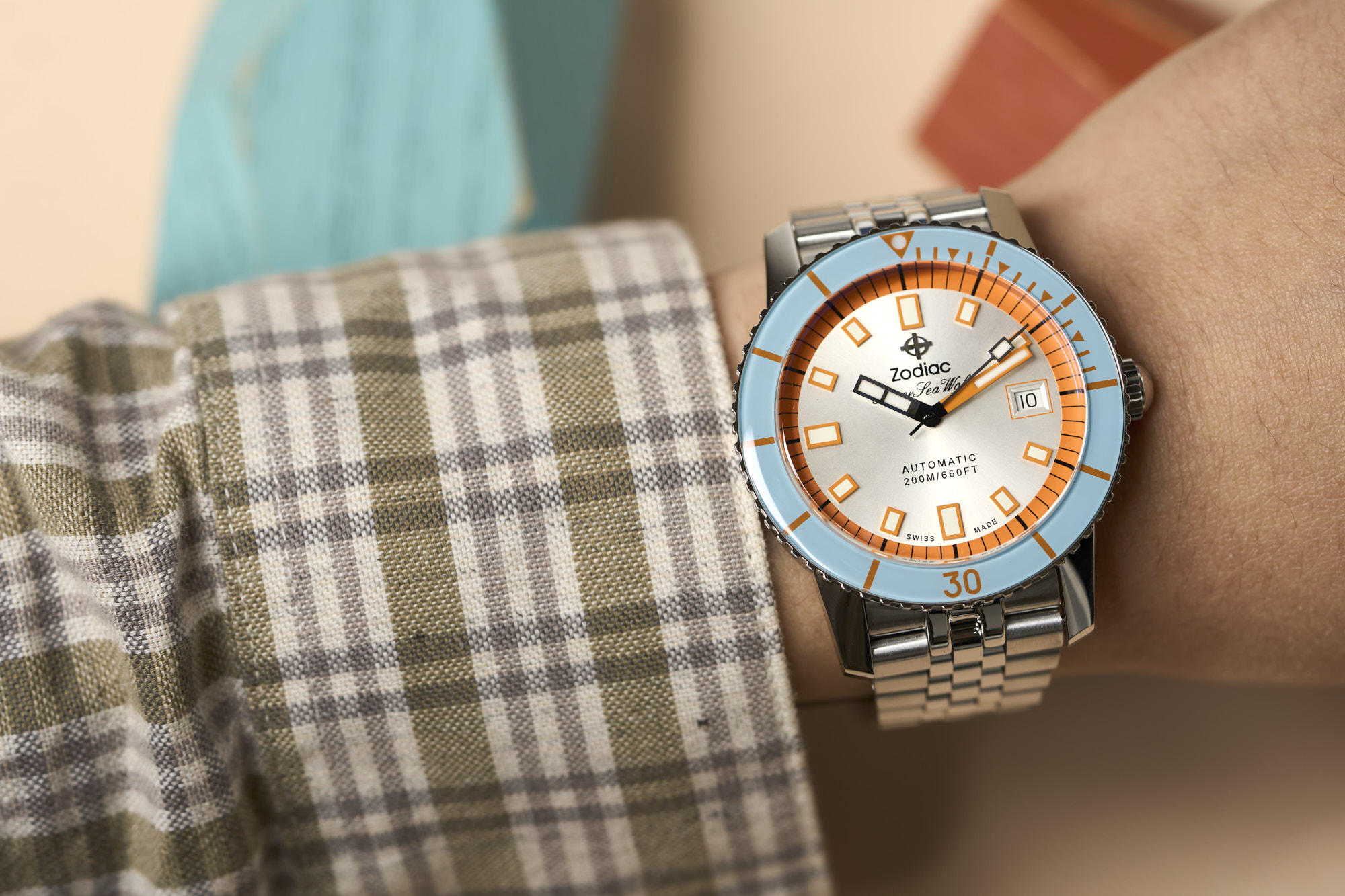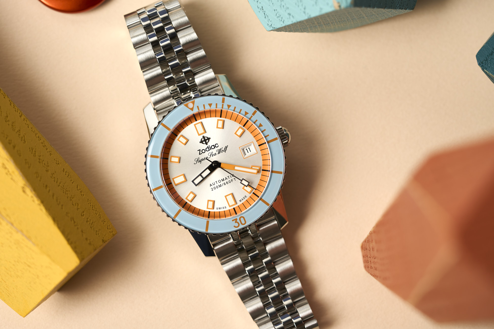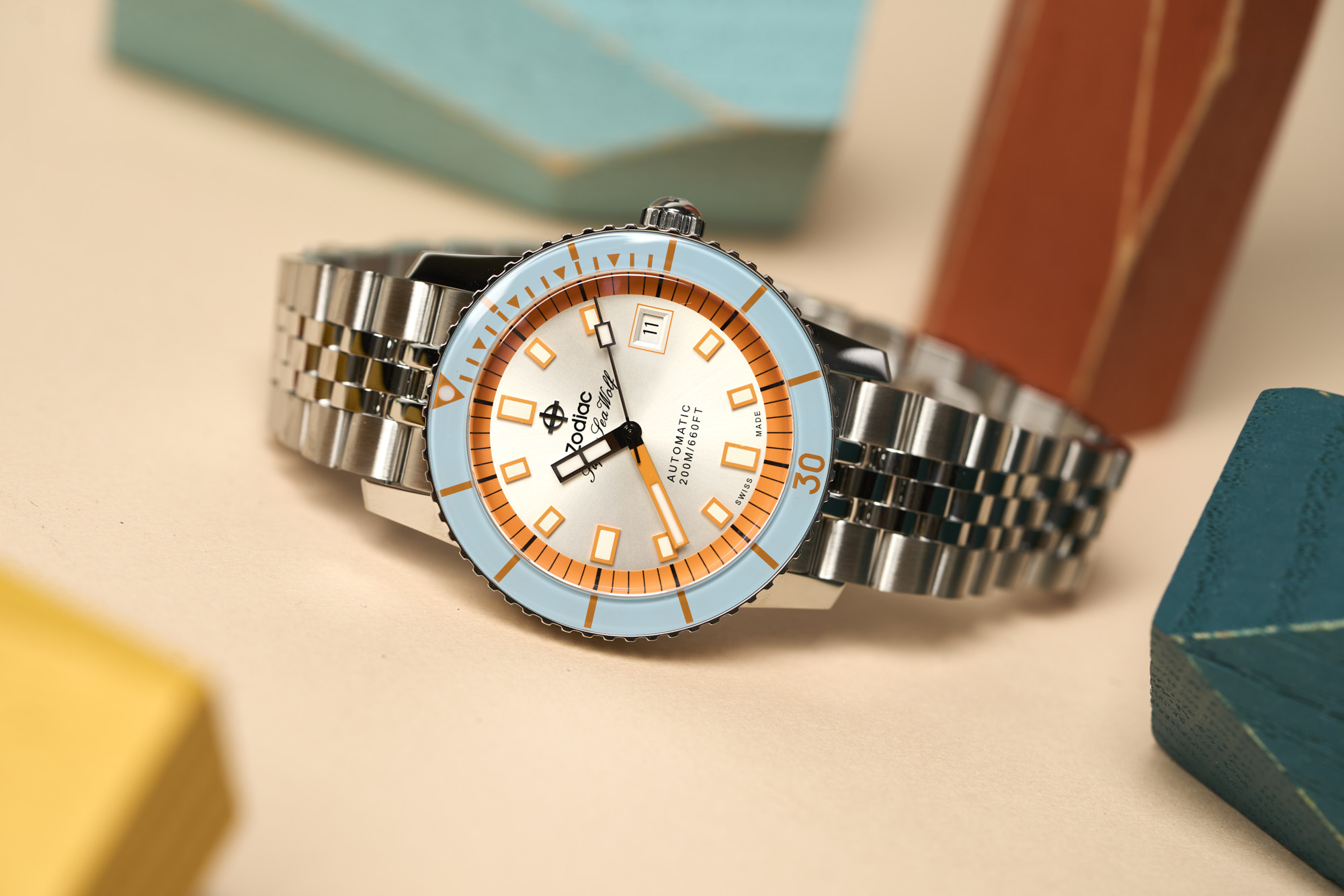 The Sea Wolf is Zodiac's most important and iconic watch design. First released in 1953, it is one of the watches that has defined the modern dive watch. Featuring a rotating bezel, large lumed markers and hands, and a steel bracelet, it had all of the elements needed for a diver. It was also the first watch marketed to consumers rather than specialists, with dive specific features. The modern Super Sea Wolfs draw directly from the original, but with updated sizes, specs and an eye for color and style.