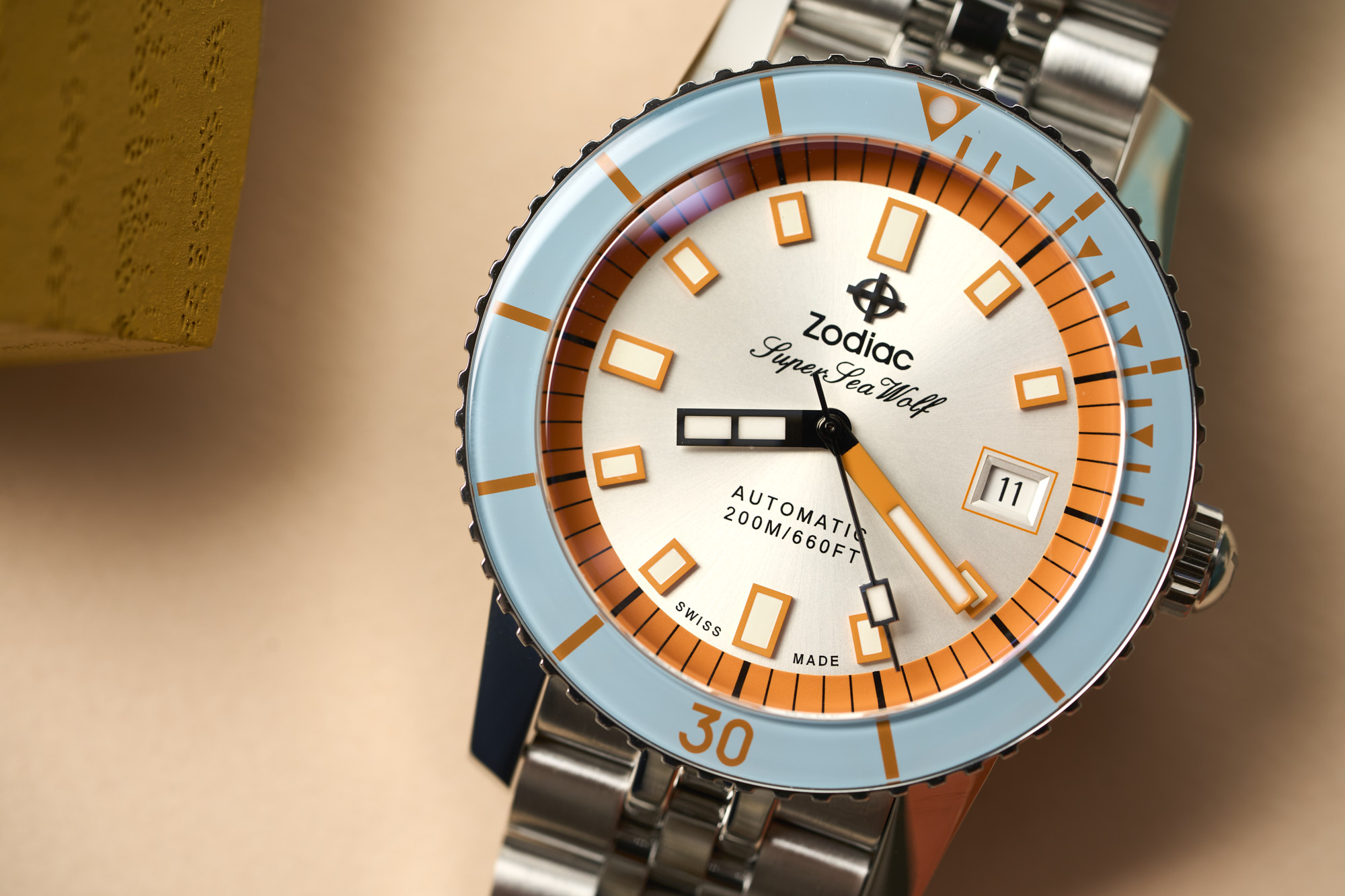 Powering the Super Sea Wolf is the STP 1-11 caliber. This Swiss-made automatic movement features 26-jewels, date (if used), swan-neck regulator, hand-winding, hacking seconds, a power reserve of 44hr and a frequency of 28,800bph for a smooth sweeping seconds hand.