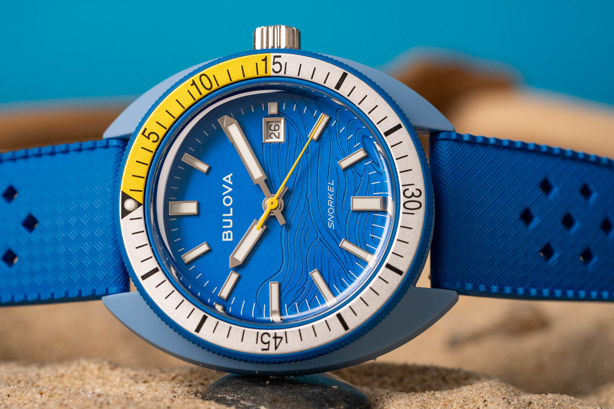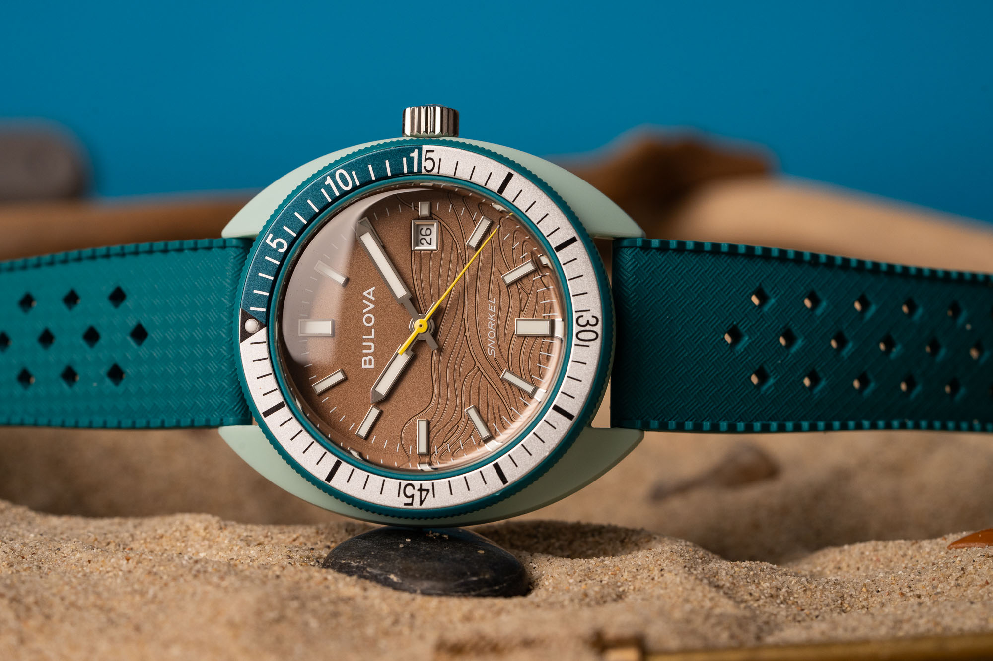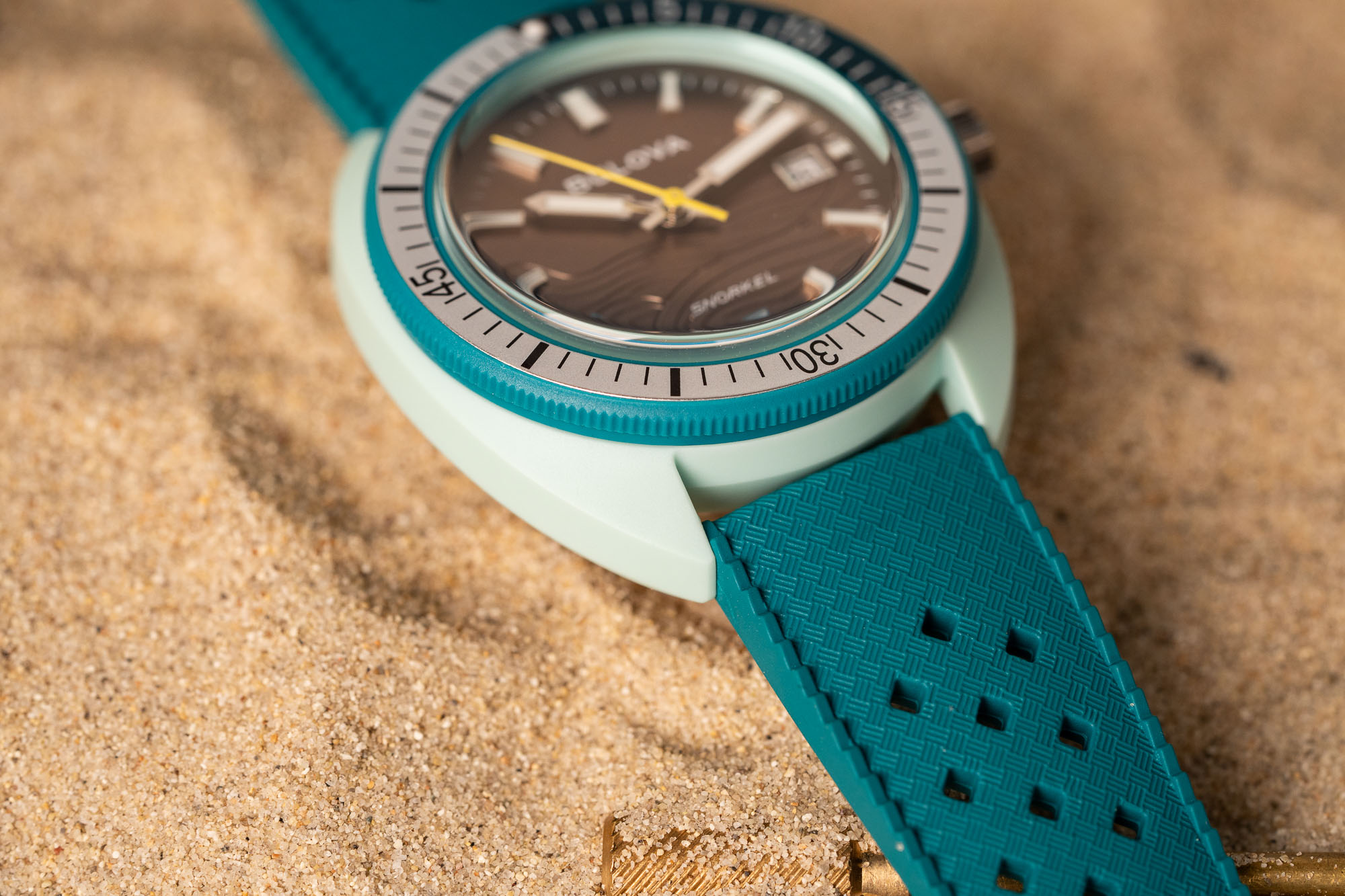 Powering the Bulova Snorkel is the Japanese-made Miyota 2115. A quartz movement, it features hour, minute, seconds, and date. Accurate to approximately +/- 20 seconds per month, it should last approximately three years on a single battery.