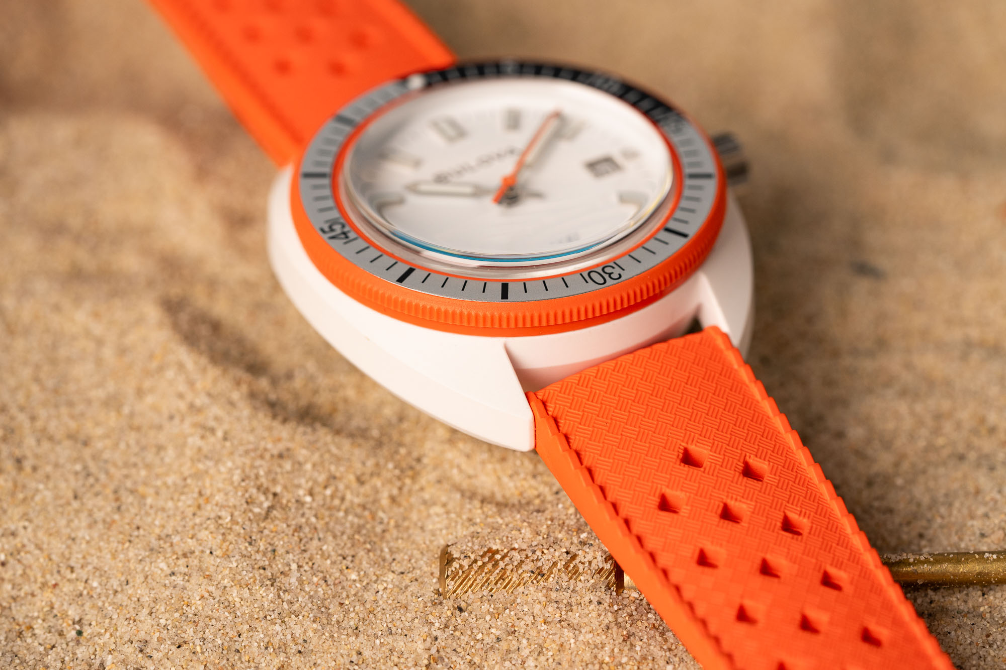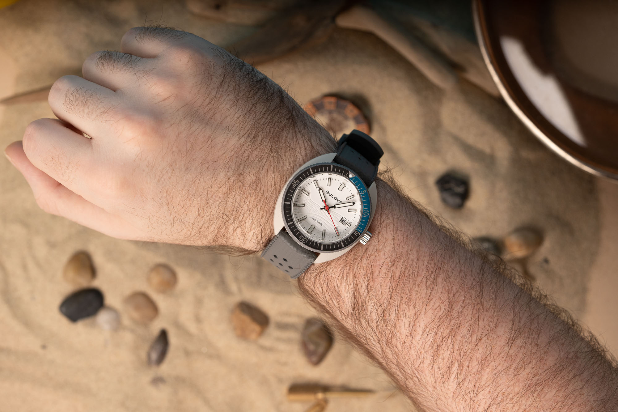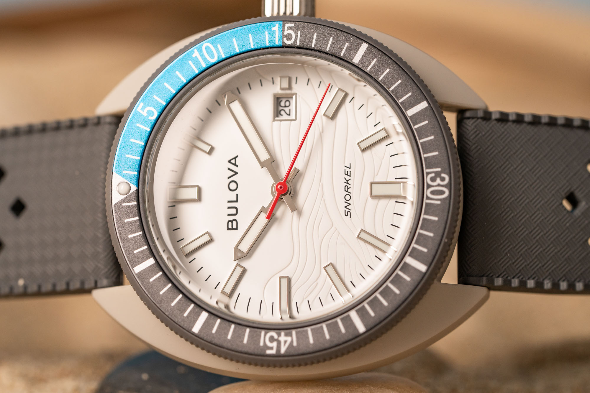 Powering the Bulova Snorkel is the Japanese-made Miyota 2115. A quartz movement, it features hour, minute, seconds, and date. Accurate to approximately +/- 20 seconds per month, it should last approximately three years on a single battery.