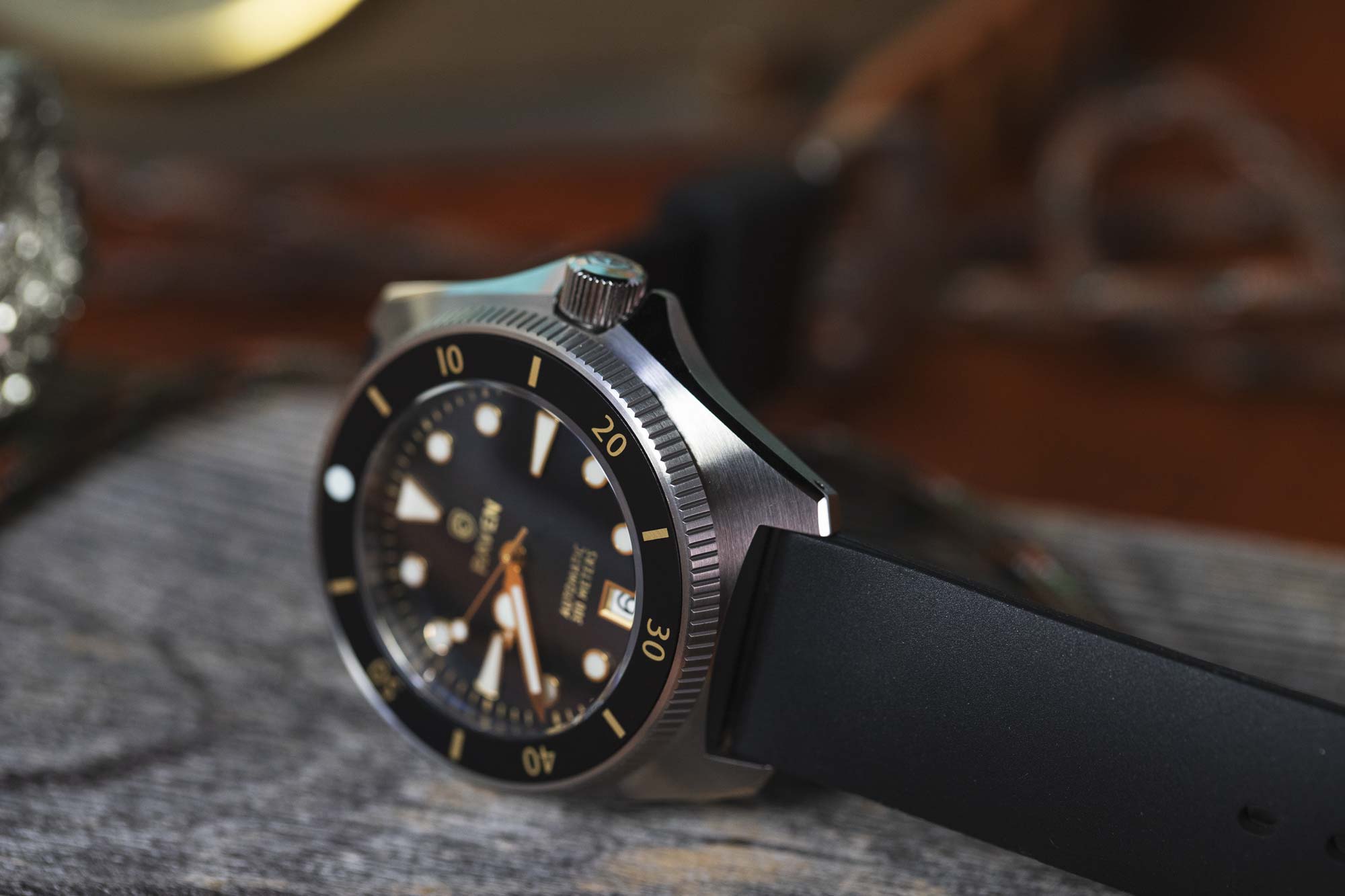 The Raven Solitude retains the brand's core DNA of making tough, dive ready tool watches, while adding more sculptural lines and elegant finishing into the mix. Based on an obscure vintage dive case from the 70's, the Solitude features swooping curves and razor-sharp lines that are stunning in the metal. Upscaled slightly to 40mm, it has the charm of something a bit older, but the fit and finish of something completely new.