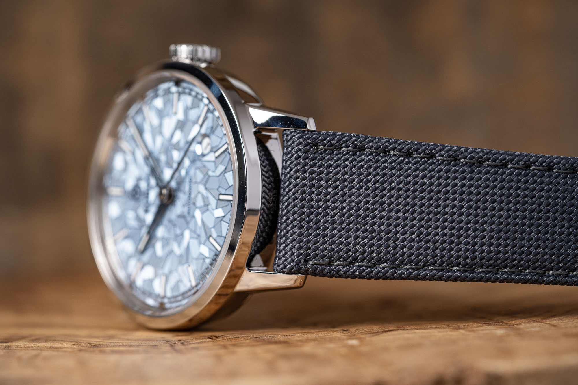 Sized at 39mm in diameter and just over 10mm thick, the watch is balanced and versatile, equally suited to men and women. The sapphire crystal with anti-reflective coating preserves clarity and protects against wear, while a soft textile strap adds everyday comfort with a modern, understated aesthetic.