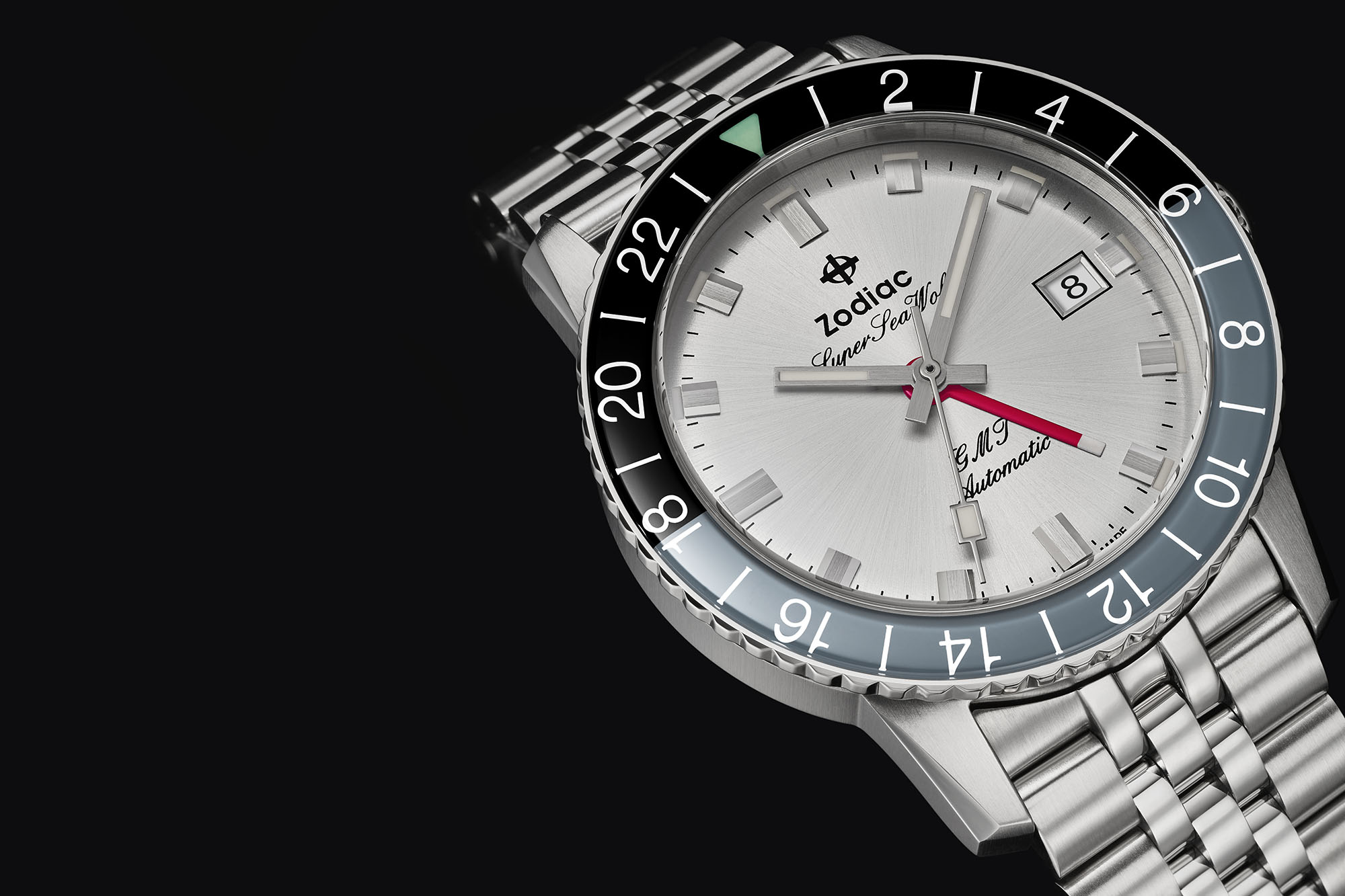 In the 1960s the Aerospace GMT was Zodiac’s entry into a new genre of watches for travellers, commercial pilots and the otherwise jet set. Built off of the Sea Wolf format, the Aerospace featured a 24-hour bakelite bezel with a split dial, a more formal dial design, and, of course, a fourth hand on the dial for tracking a second time zone (three with the bezel). In the Spring of 2019 Zodiac brought the design back in a series of limited editions that sold out in a flash, becoming a modern cult hit. Now, the Super Sea Wolf GMT is available in two new editions with a new movement.