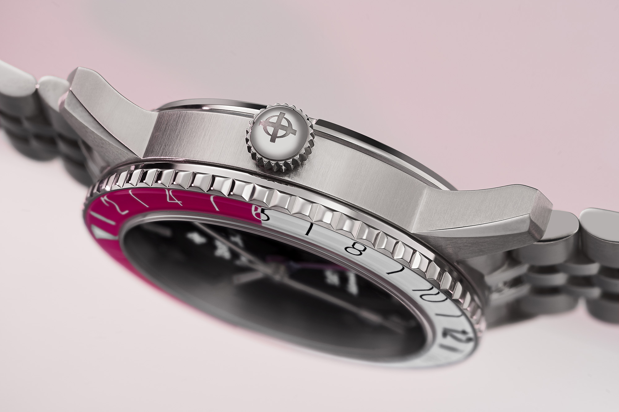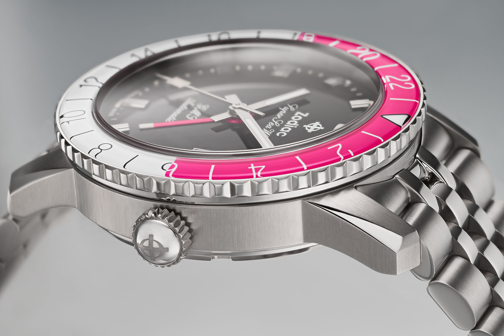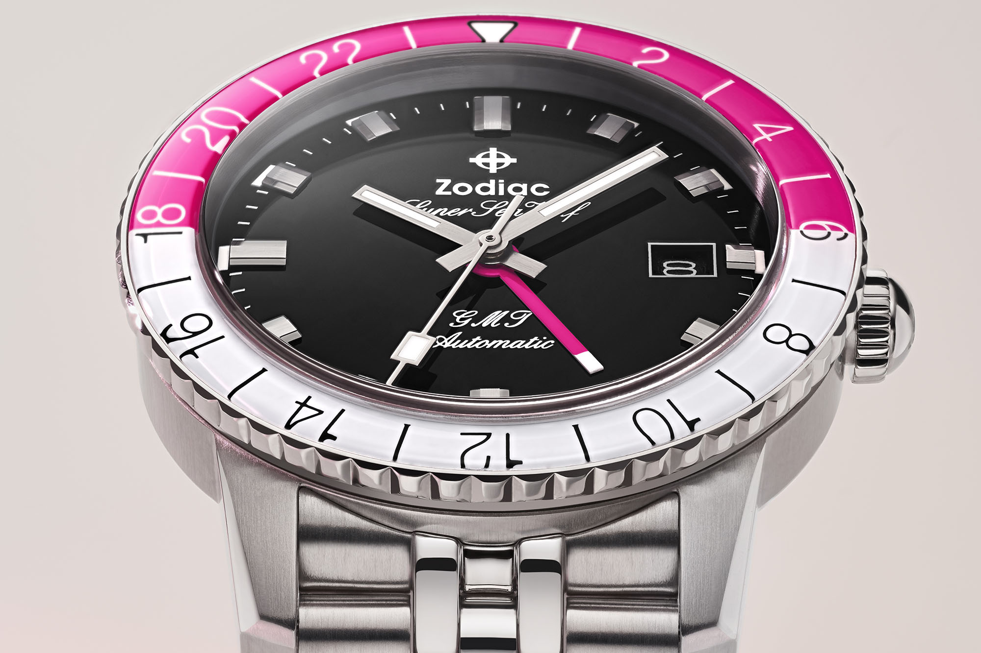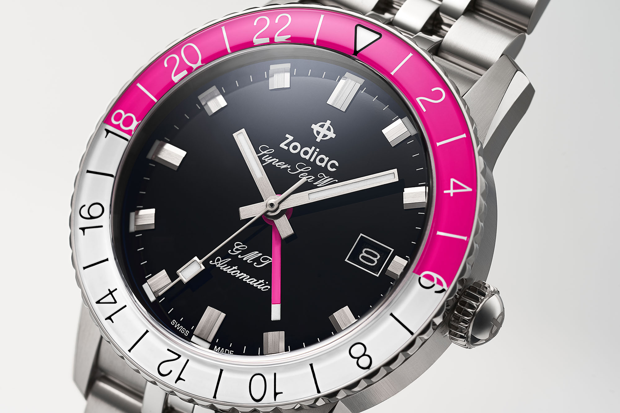 The Zodiac Super Sea Wolf GMT, like the original, is built off of a diver format, featuring a 40mm case with a sapphire crystal and 200m water resistance. A slight change is present in the brushed lugs which feature a sharp, polished bevel for a more formal and elegant look. Additionally, the bezel has been switched to a bi-directional mechanism with 24-clicks with a Pink/White bezel and a black dial. The dial speaks to that of the original Aerospace, with applied markers and blocky hands for a mix of dress and sport.