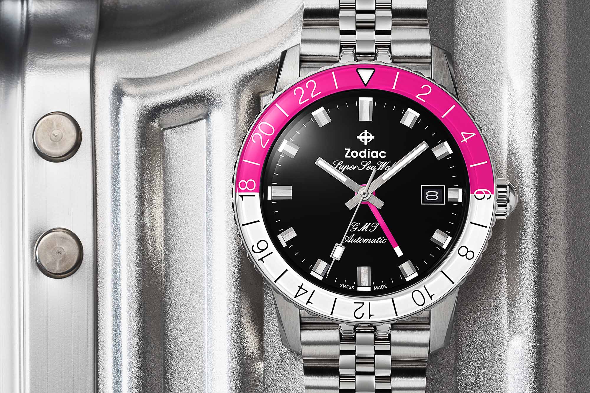 In the 1960s the Aerospace GMT was Zodiac’s entry into a new genre of watches for travelers, commercial pilots and the otherwise jet set. Built off of the Sea Wolf format, the Aerospace featured a 24-hour bakelite bezel with a split dial, a more formal dial design, and, of course, a fourth hand on the dial for tracking a second time zone (three with the bezel). In the Spring of 2019 Zodiac brought the design back in a series of limited editions that sold out in a flash, becoming a modern cult hit. Now, the Super Sea Wolf GMT is available in new editions with a new movement.