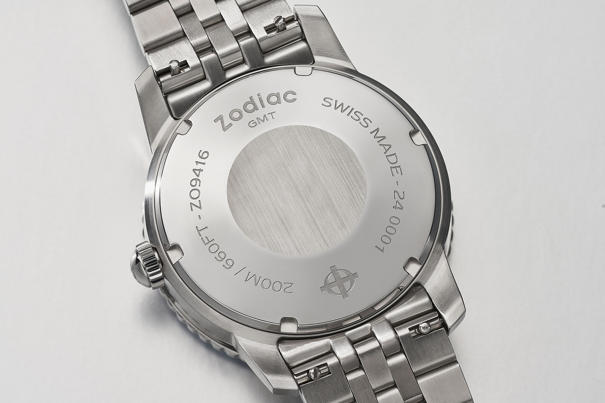 Inside of the Zodiac Super Sea Wolf GMT (2024) is the new STP 7-20. This Swiss-made movement is a 26-jewel automatic with date, independent 24-hour hand, hand-winding, 40-hour power reserve, a frequency of 28,880 bph (beats per hour) and hacking seconds (the second-hand stops when the crown is pulled out).