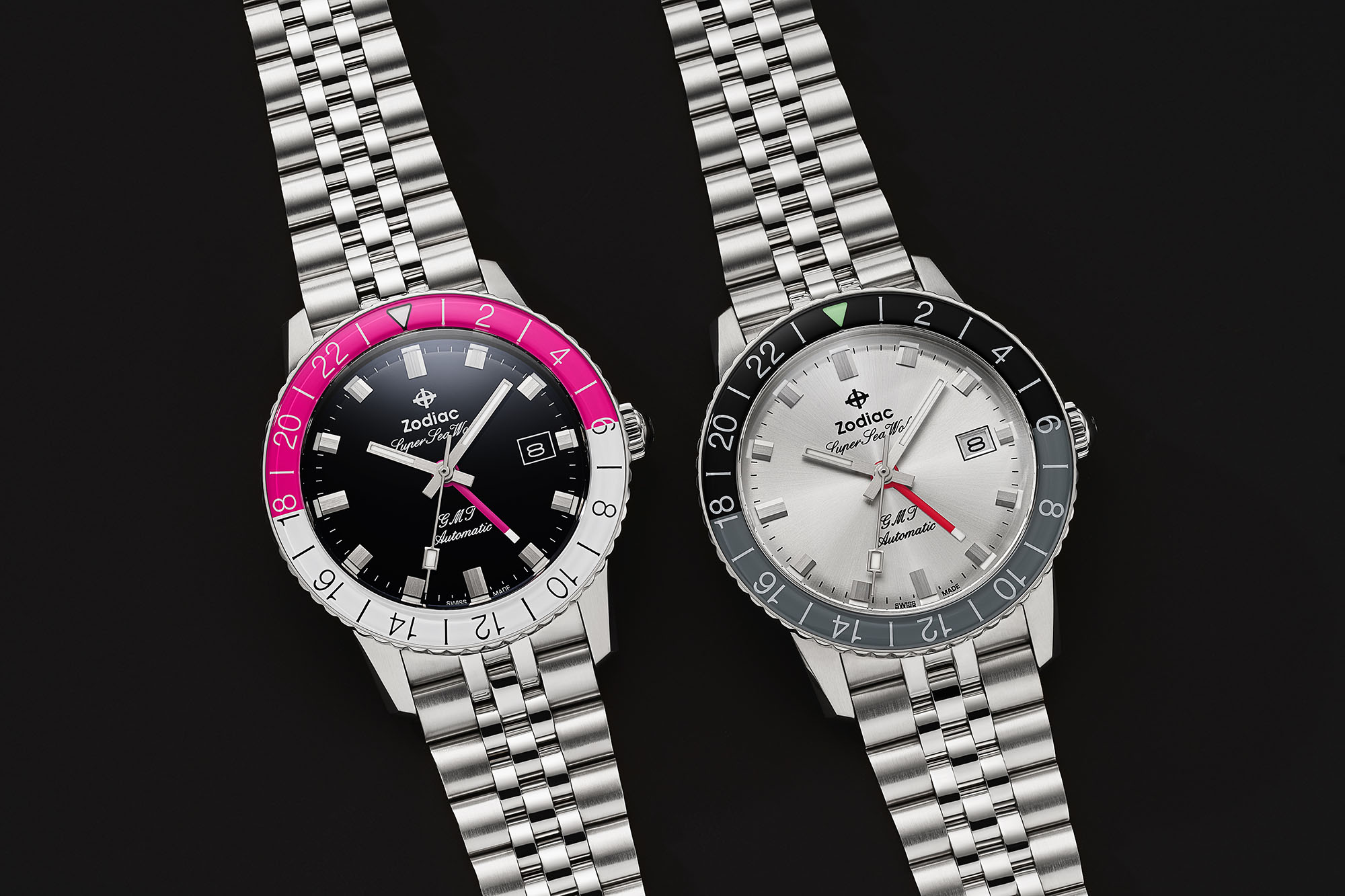 In the 1960s the Aerospace GMT was Zodiac’s entry into a new genre of watches for travelers, commercial pilots and the otherwise jet set. Built off of the Sea Wolf format, the Aerospace featured a 24-hour bakelite bezel with a split dial, a more formal dial design, and, of course, a fourth hand on the dial for tracking a second time zone (three with the bezel). In the Spring of 2019 Zodiac brought the design back in a series of limited editions that sold out in a flash, becoming a modern cult hit. Now, the Super Sea Wolf GMT is available in new editions with a new movement.