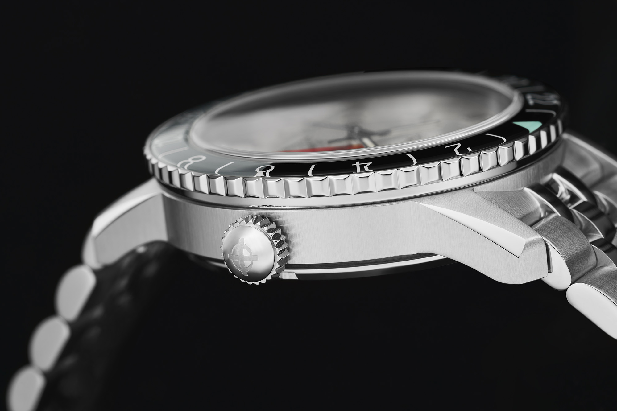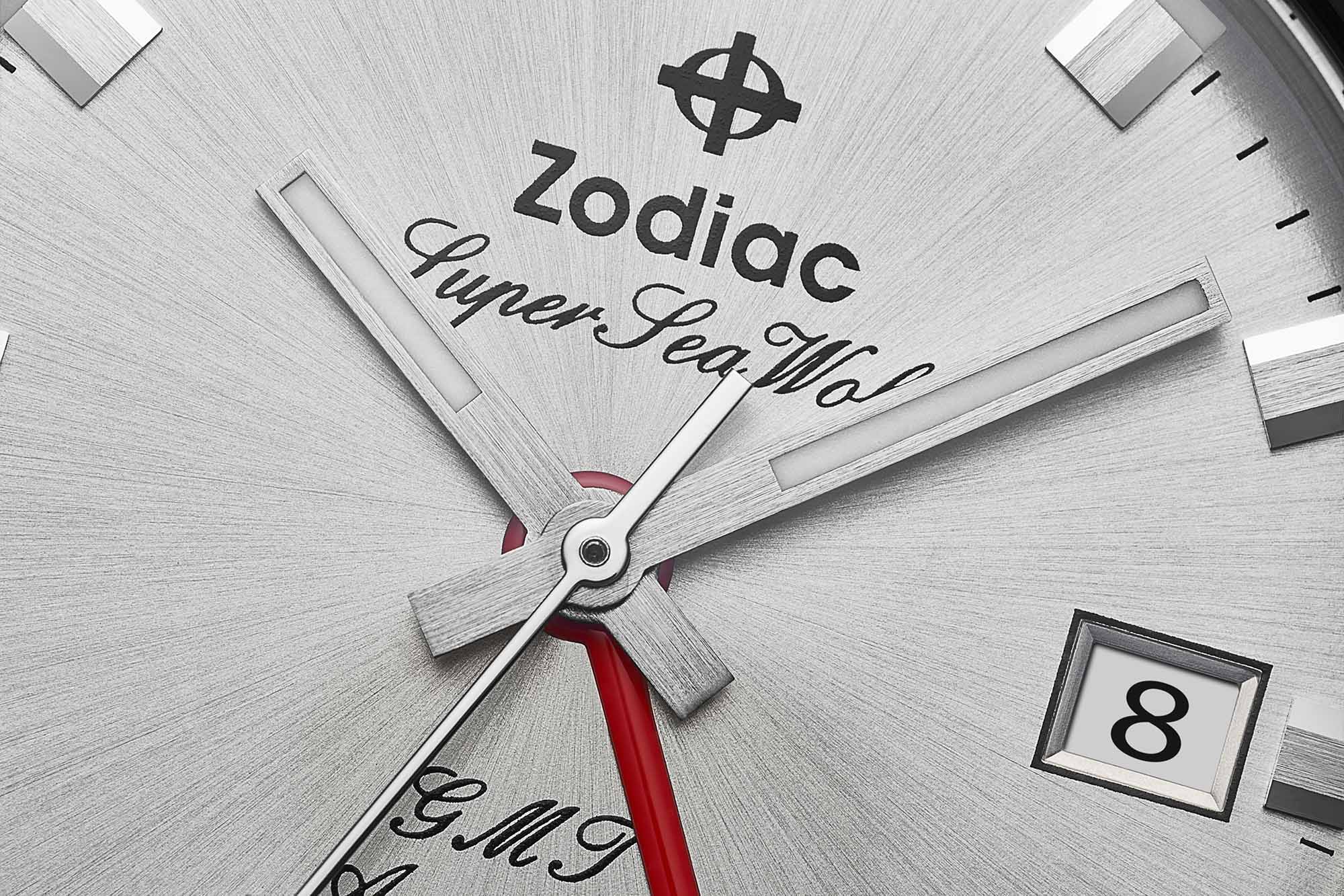 Inside of the Zodiac Super Sea Wolf GMT (2024) is the new STP 7-20. This Swiss-made movement is a 26-jewel automatic with date, independent 24-hour hand, hand-winding, 40-hour power reserve, a frequency of 28,880 bph (beats per hour) and hacking seconds (the second-hand stops when the crown is pulled out).