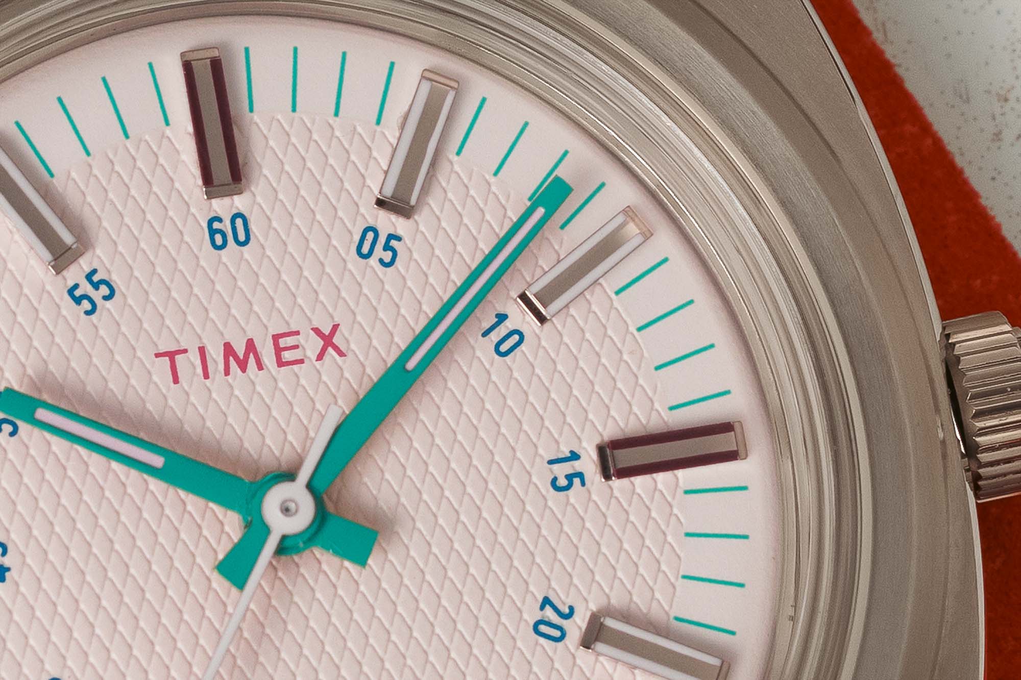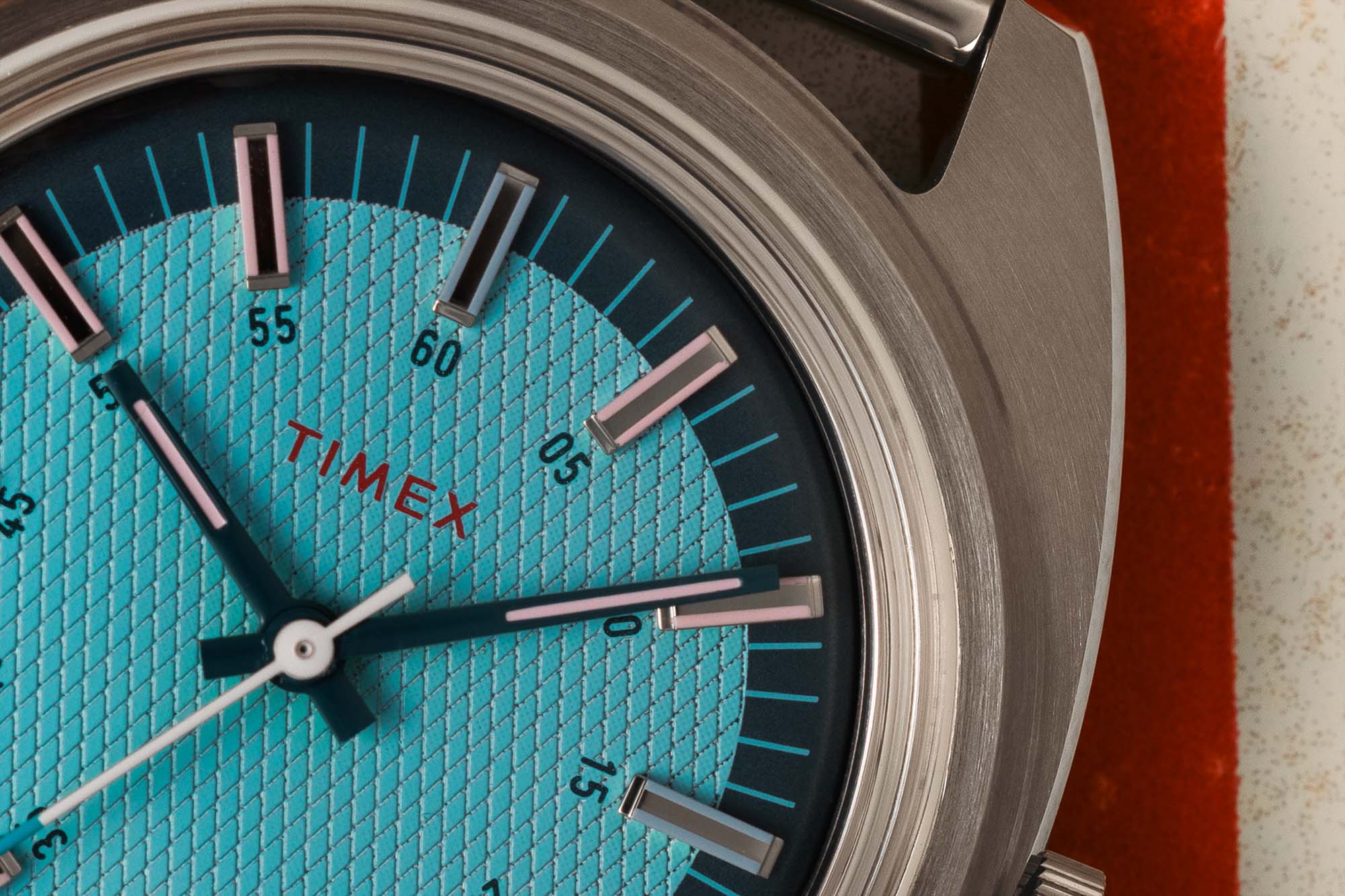 For the Timex x Worn & Wound WW75 V2 we used the same 37mm x 43mm case. It’s 12.7mm tall, including a domed acrylic crystal, and has 20mm lugs. It wears beautifully and is sized to fit a wide variety of wrists. The dials feature a combination of colors and textures in a concentric array. At center is a region with a waffle texture, encircled by a ring in a contrasting color for a vibrant pop. Applied indices cross from one to the other, creating a visual flow, and adding an element of classic elegance. A rotating set of numerals for the minutes/seconds brings it back to the casual.