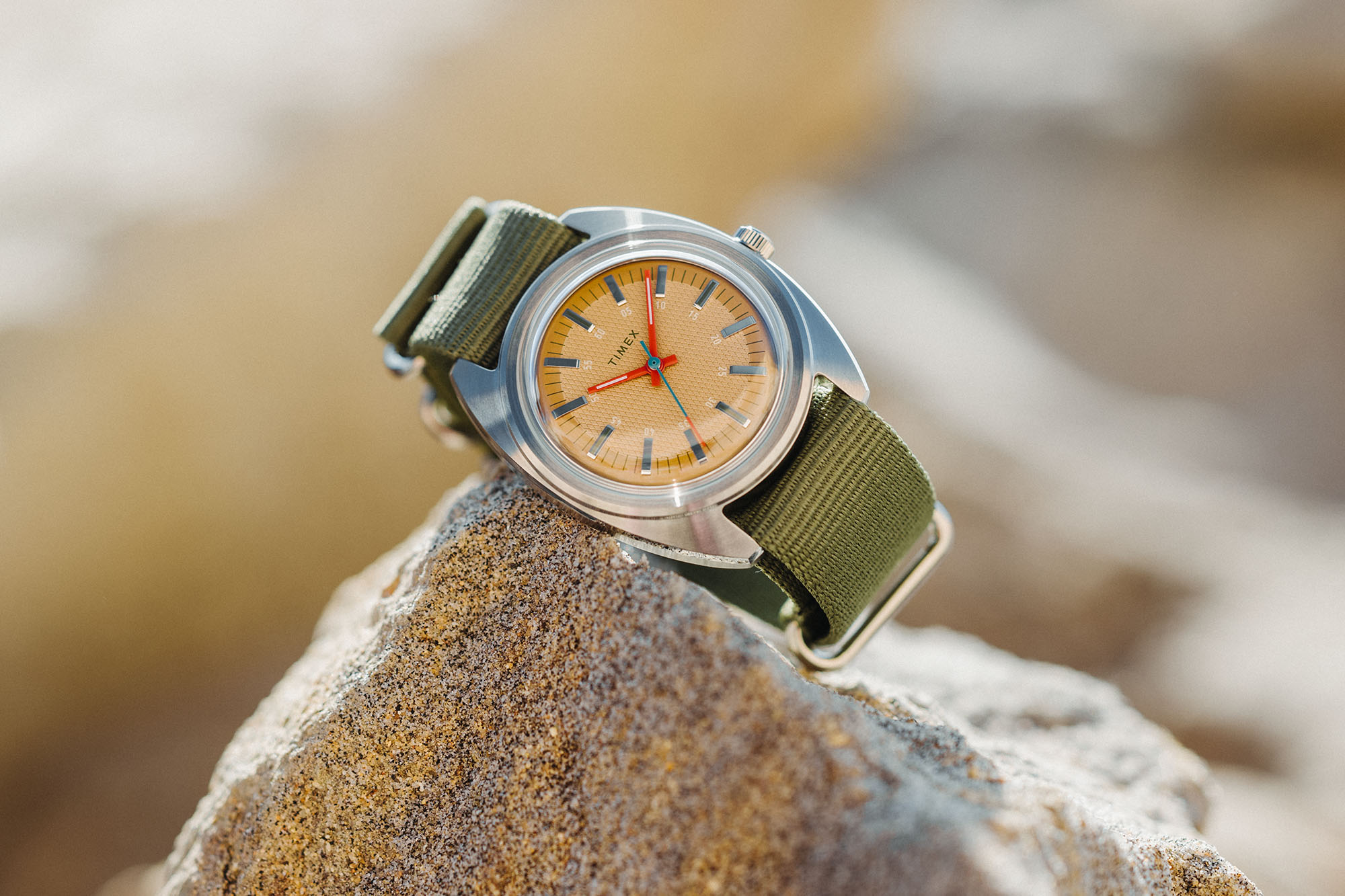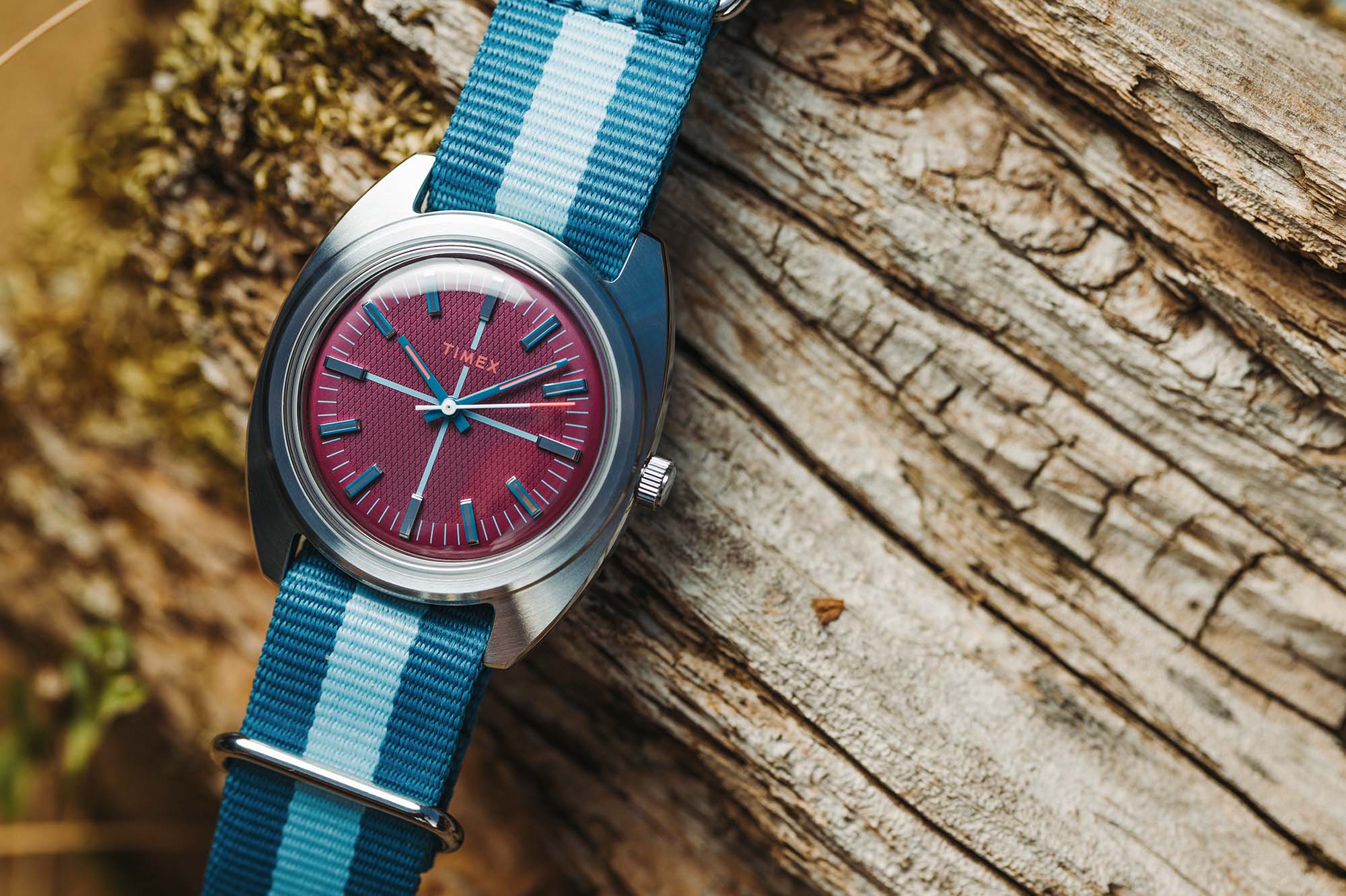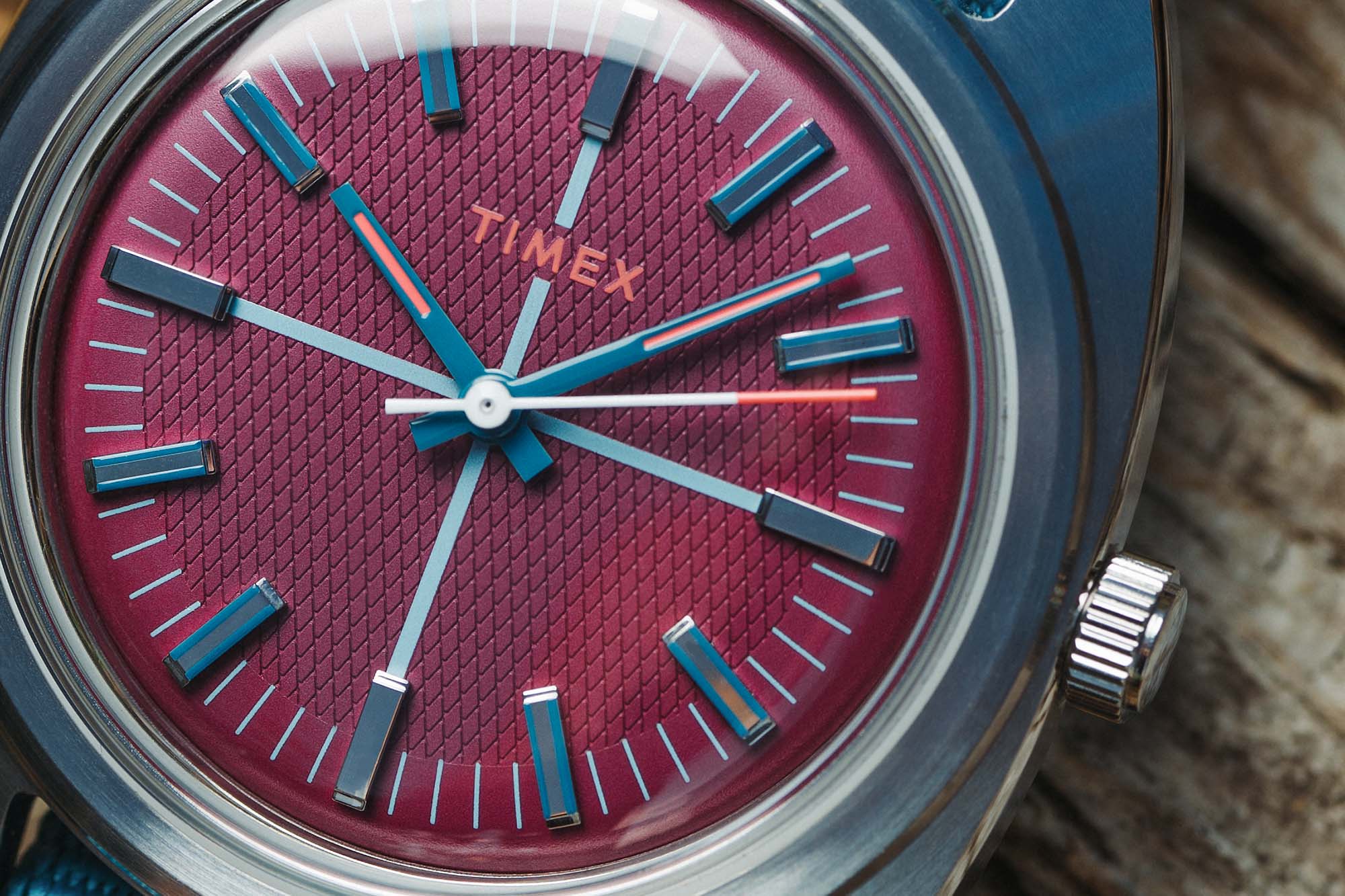 For the Timex x Worn & Wound WW75 V3 we used the same 37mm x 43mm case. It’s 12.7mm tall, including a domed acrylic crystal, and has 20mm lugs. It wears beautifully and is sized to fit a wide variety of wrists. The dials feature a combination of colors and textures in a concentric array. At center is a region with a waffle texture, encircled by a ring in a contrasting color for a vibrant pop. Applied indices cross from one to the other, creating a visual flow, and adding an element of classic elegance. A rotating set of numerals for the minutes/seconds brings it back to the casual.