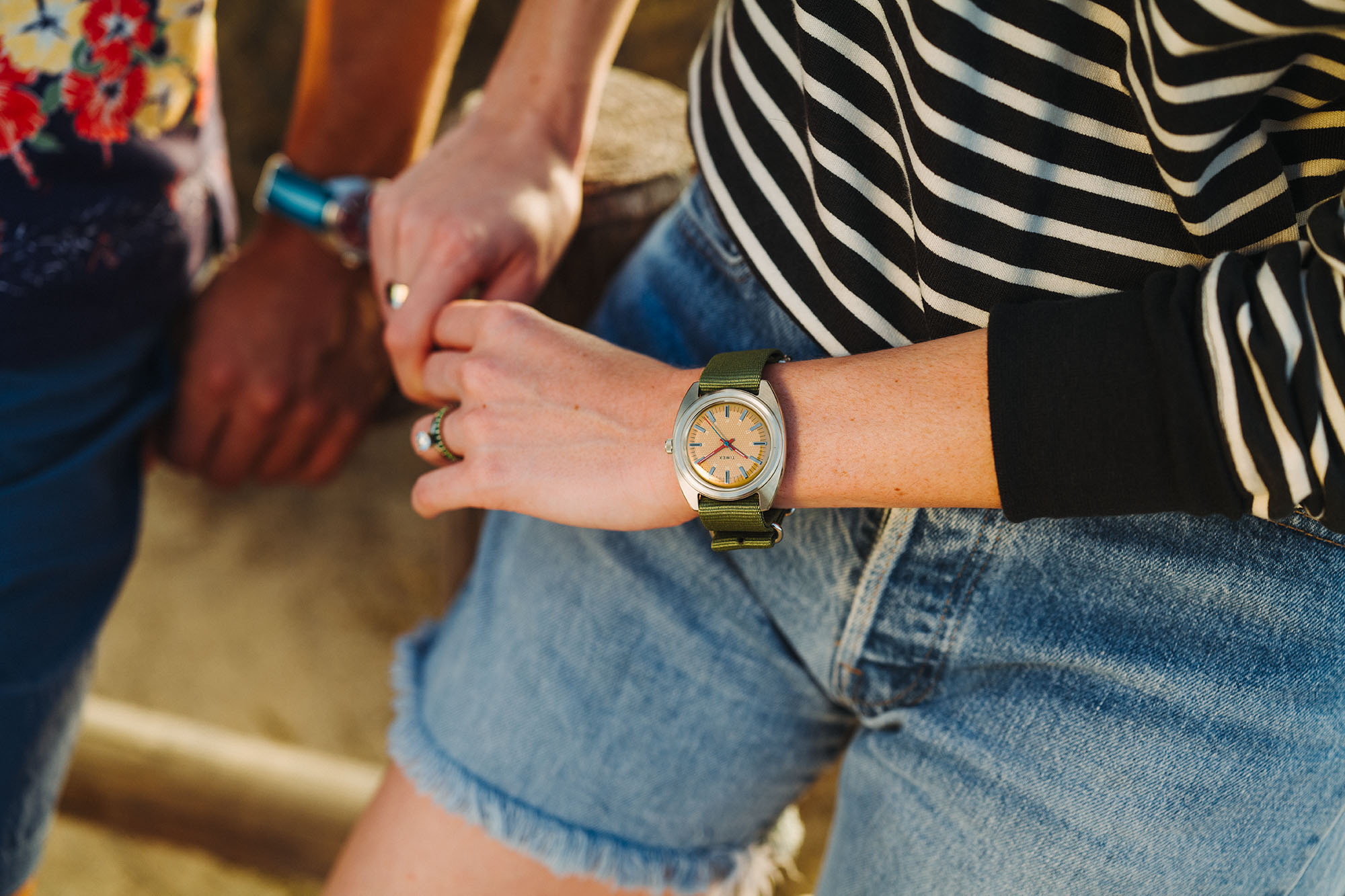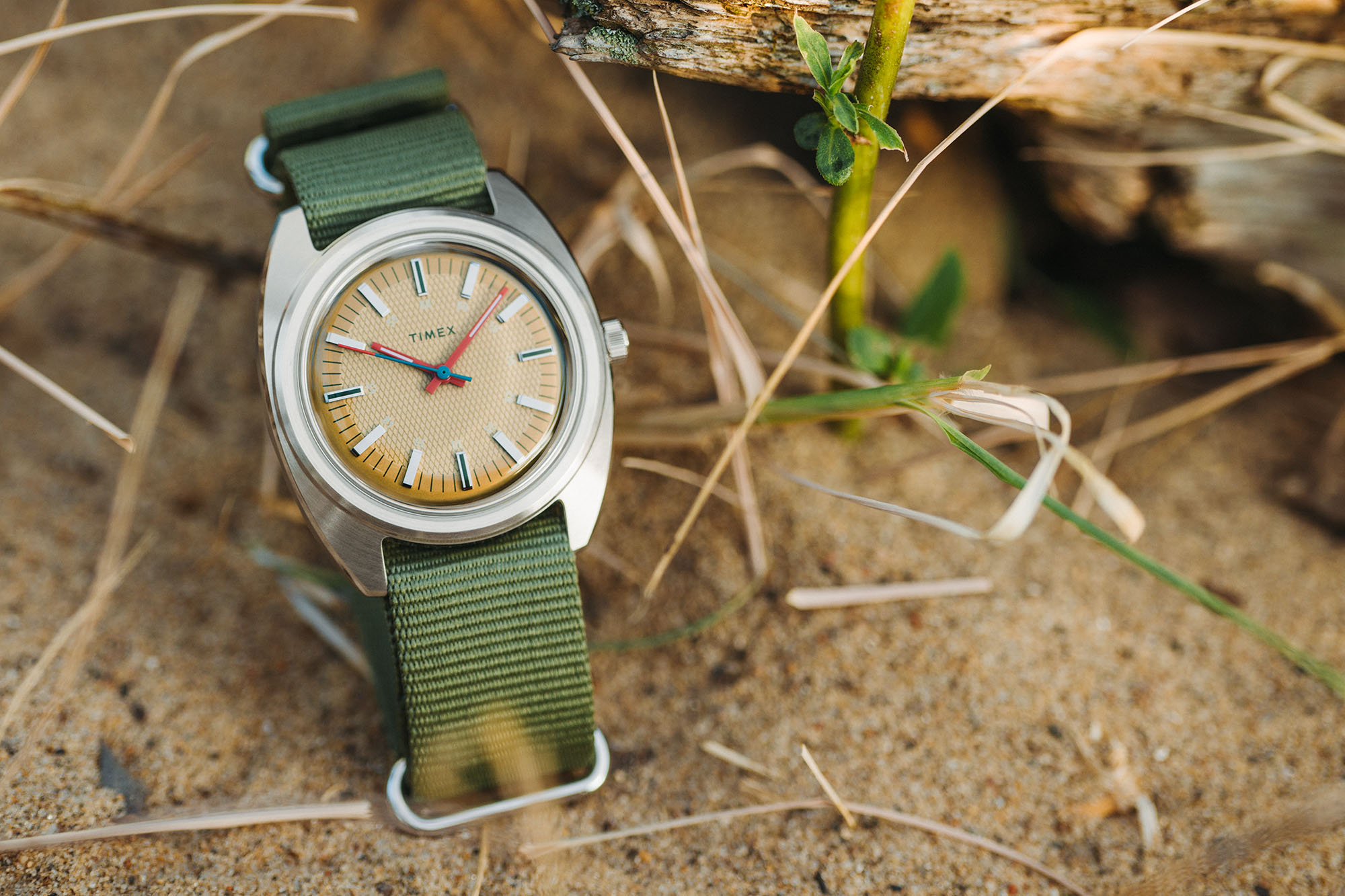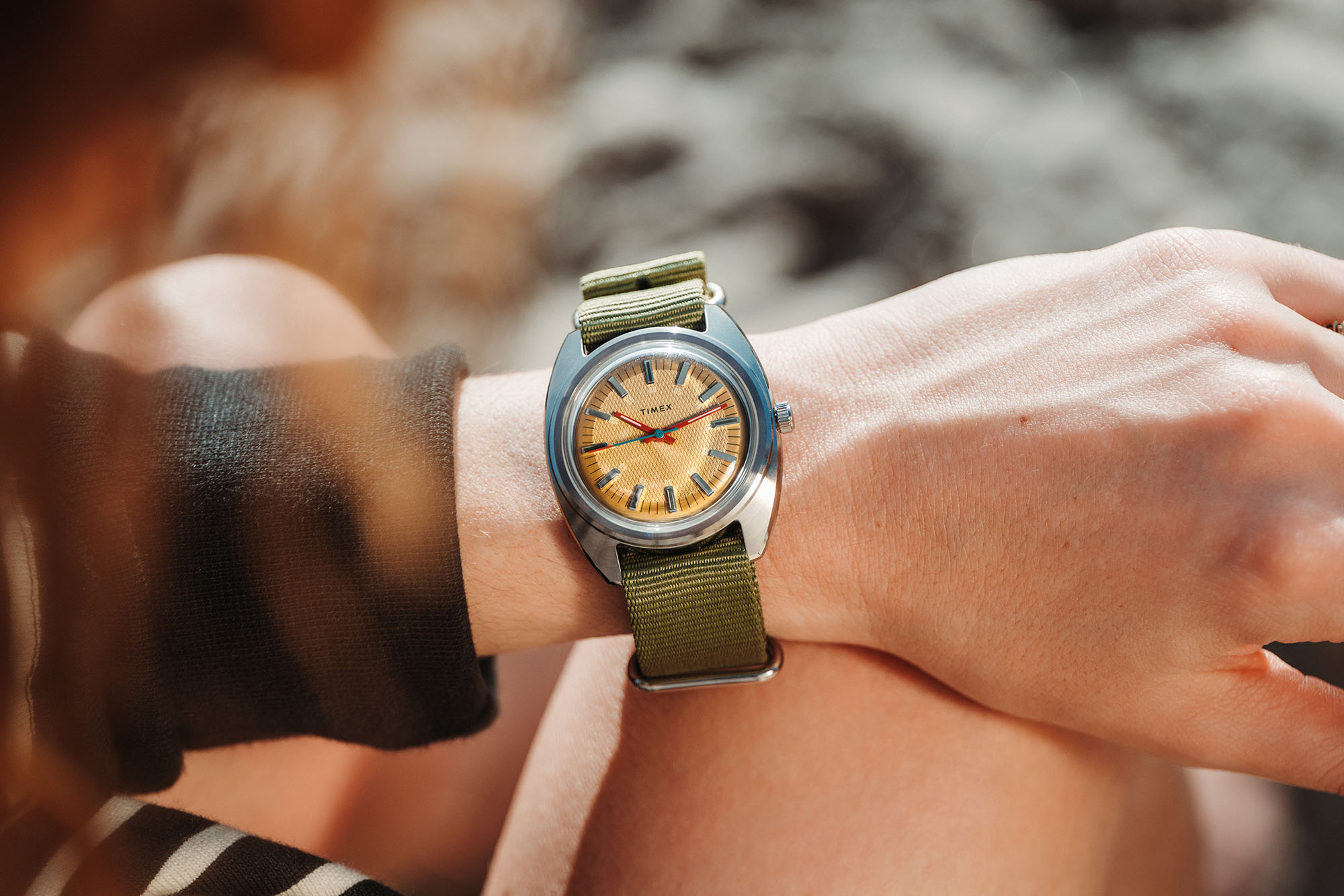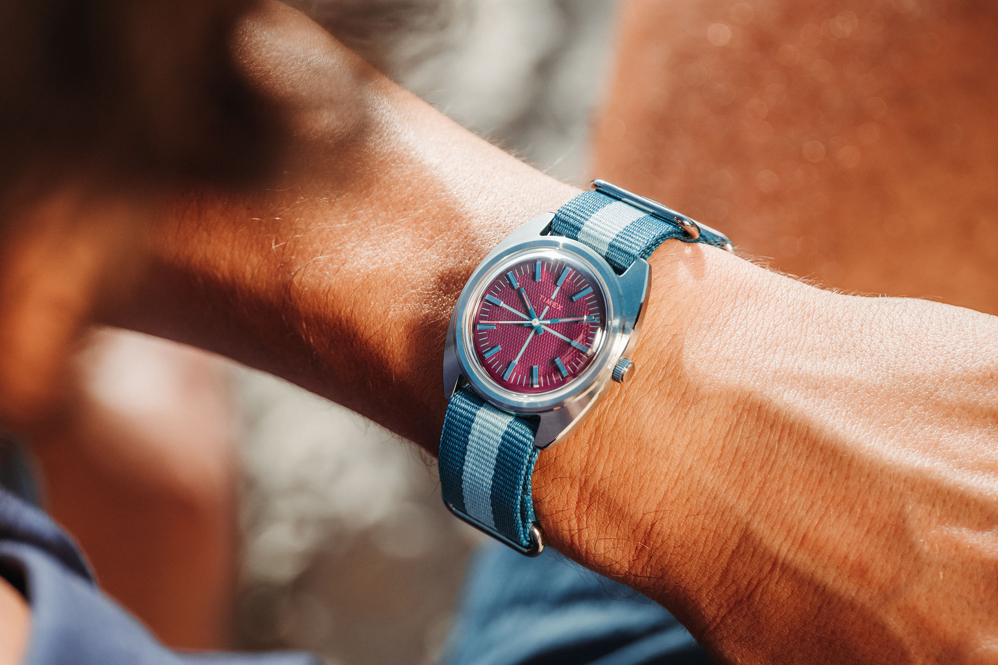 For the Timex x Worn & Wound WW75 V3 we used the same 37mm x 43mm case. It’s 12.7mm tall, including a domed acrylic crystal, and has 20mm lugs. It wears beautifully and is sized to fit a wide variety of wrists. The dials feature a combination of colors and textures in a concentric array. At center is a region with a waffle texture, encircled by a ring in a contrasting color for a vibrant pop. Applied indices cross from one to the other, creating a visual flow, and adding an element of classic elegance. A rotating set of numerals for the minutes/seconds brings it back to the casual.