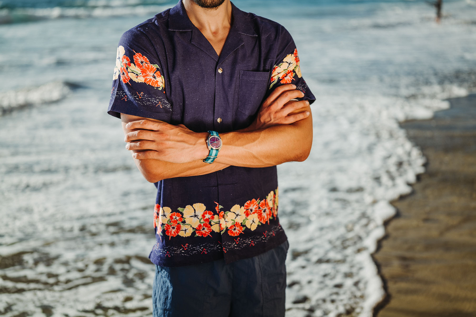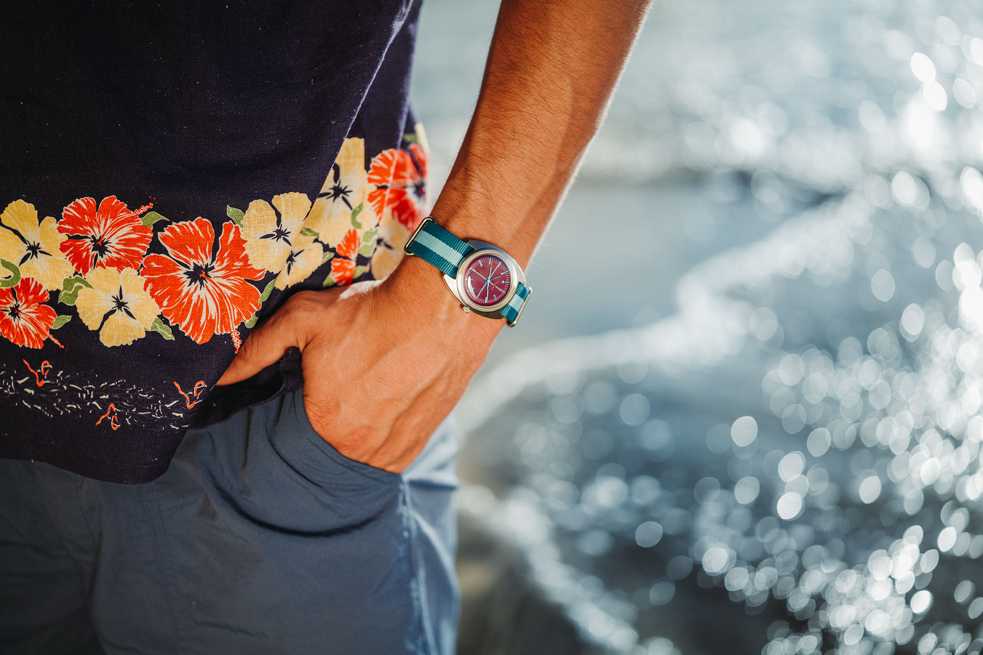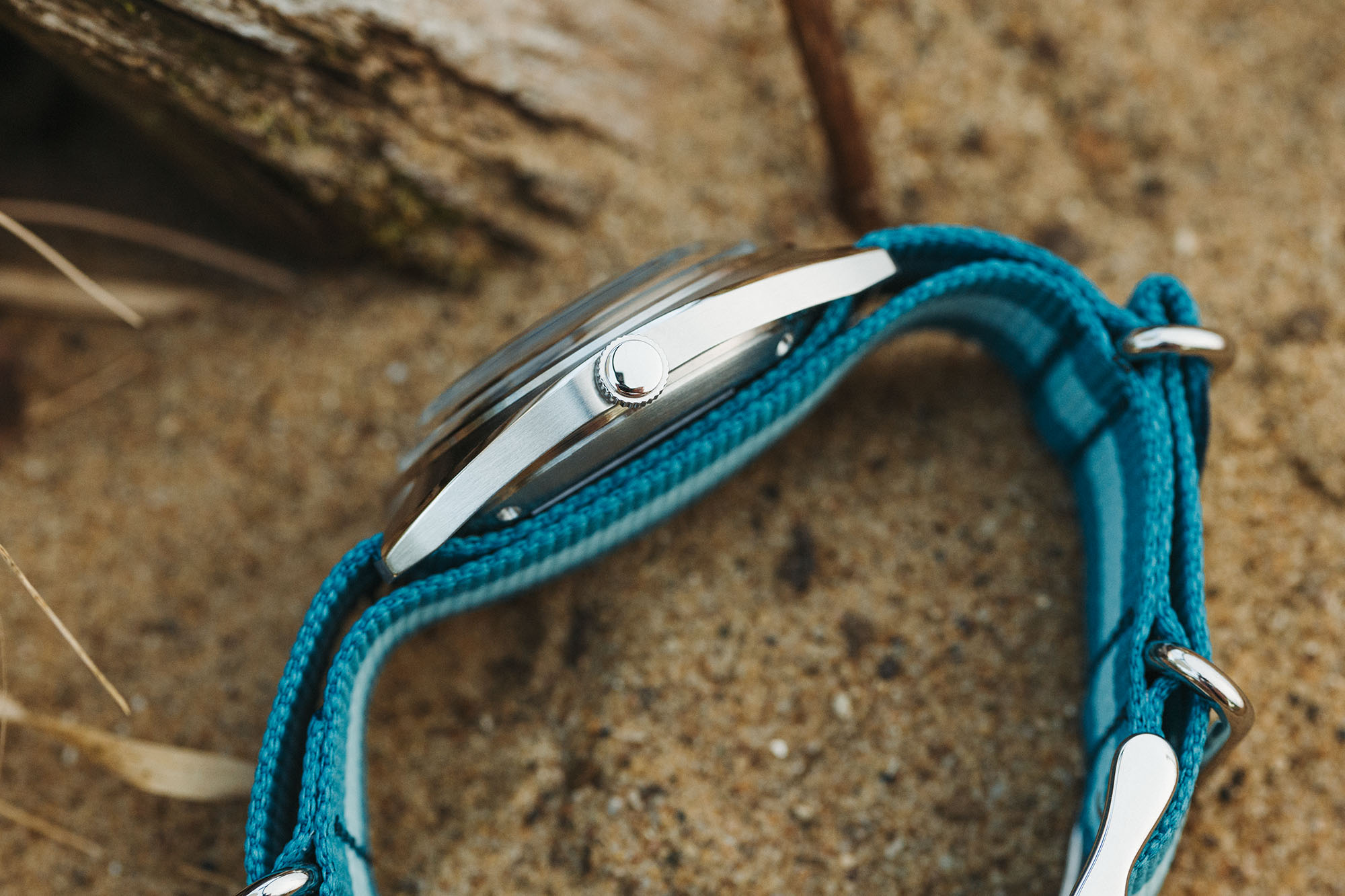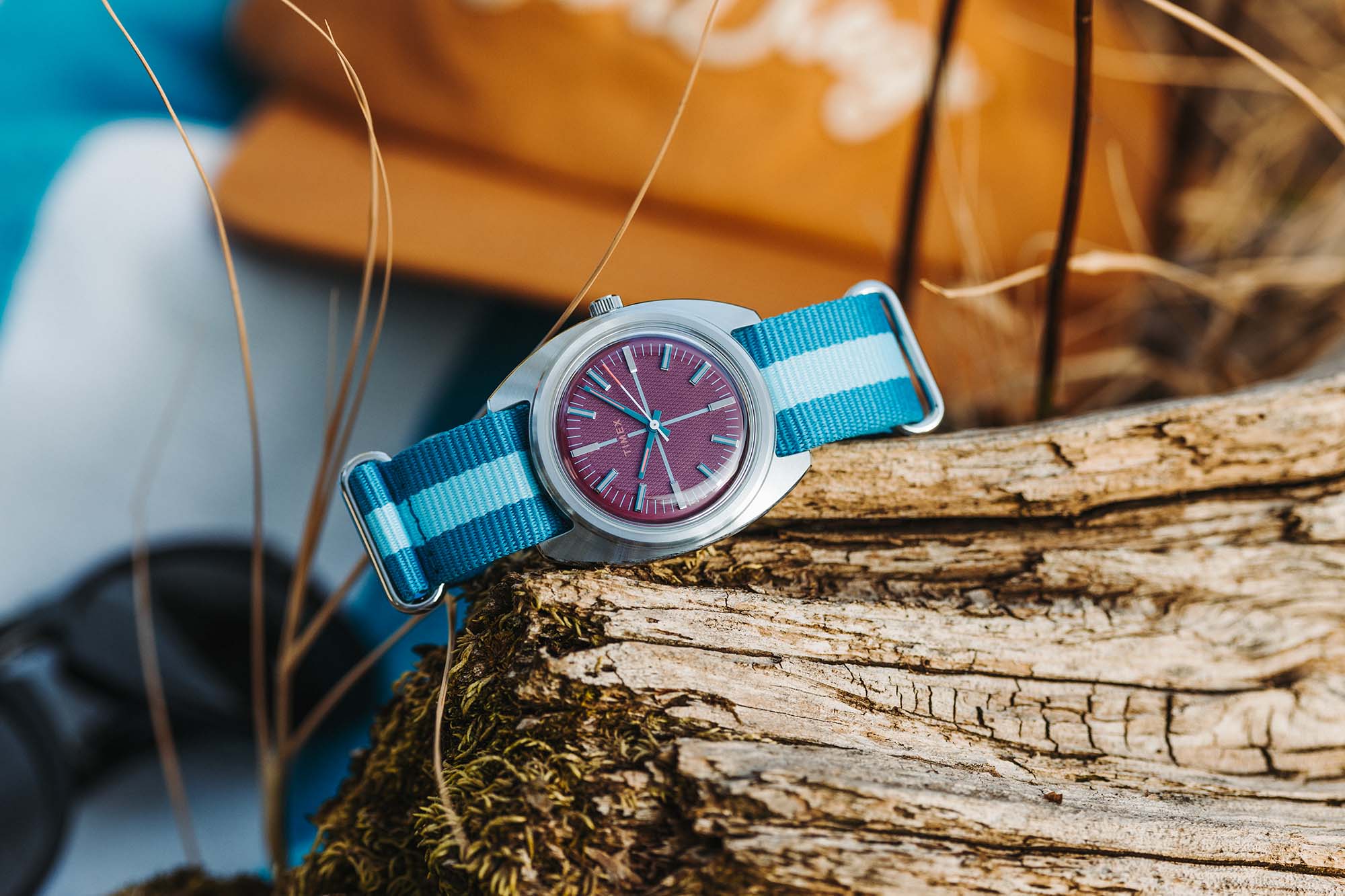 Sunflower combines sandy yellow tones with rusty orange and dark teal to evoke the late summer blooming flower. Combined with a grass green mil-strap, the desaturated tones are both natural and stylish. Sunset evokes the deep magentas seen as the sun descends across the horizon. A deep magenta dial is offset by brighter blues and flecks of pink. A striped blue and teal nylon mil-strap adds contrast an a slightly sporty attitude.