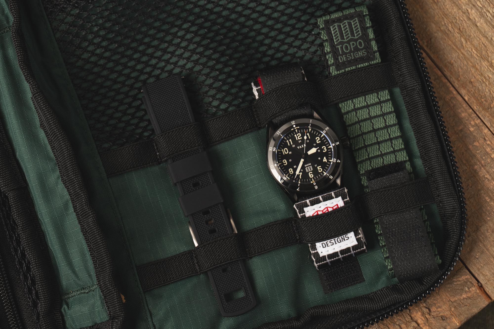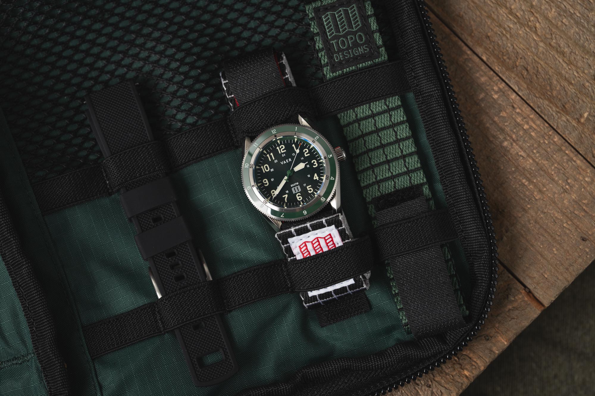 Compact, durable, and comfortable, the Solar Hiker includes multiple straps: two colorful hook-and-loop designs by Topo and a two-piece black silicone strap from Vaer. Additionally, the watches come packaged in a custom Topo EDC carrying case that features multiple pockets as well as elastic straps, making it a fantastic piece of kit to throw in your bag on an adventure.
