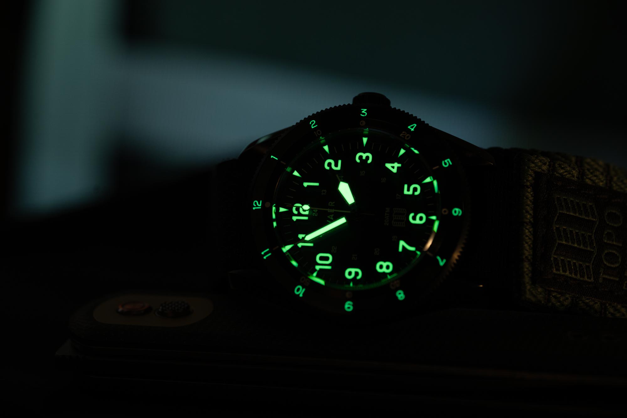 The dial features bold, raised numerals printed with 15 layers of C3 Super-LumiNova for exceptional legibility day or night. A dual-index ceramic and steel bezel adds practical versatility, allowing users to track a second time zone or elapsed minutes, with subtle solar cues marking sunrise and sunset positions.