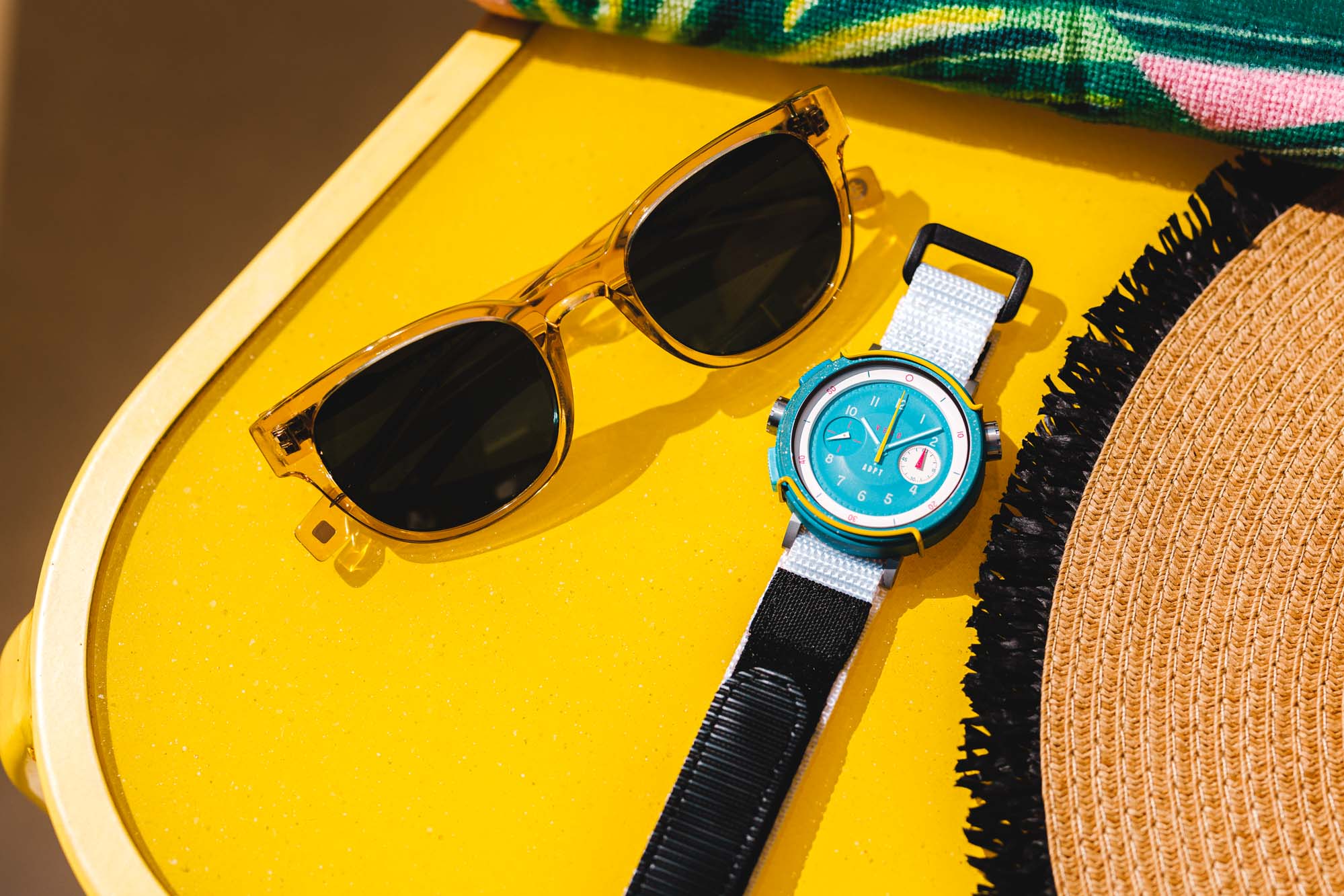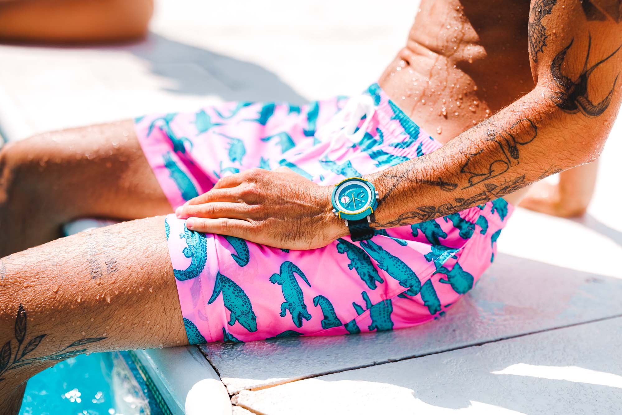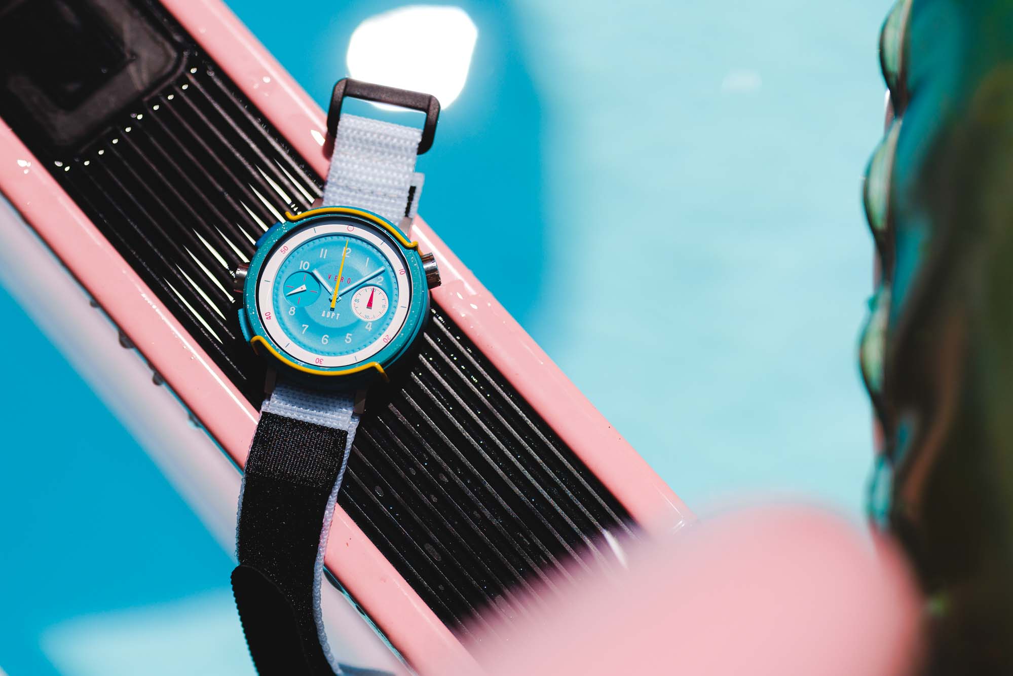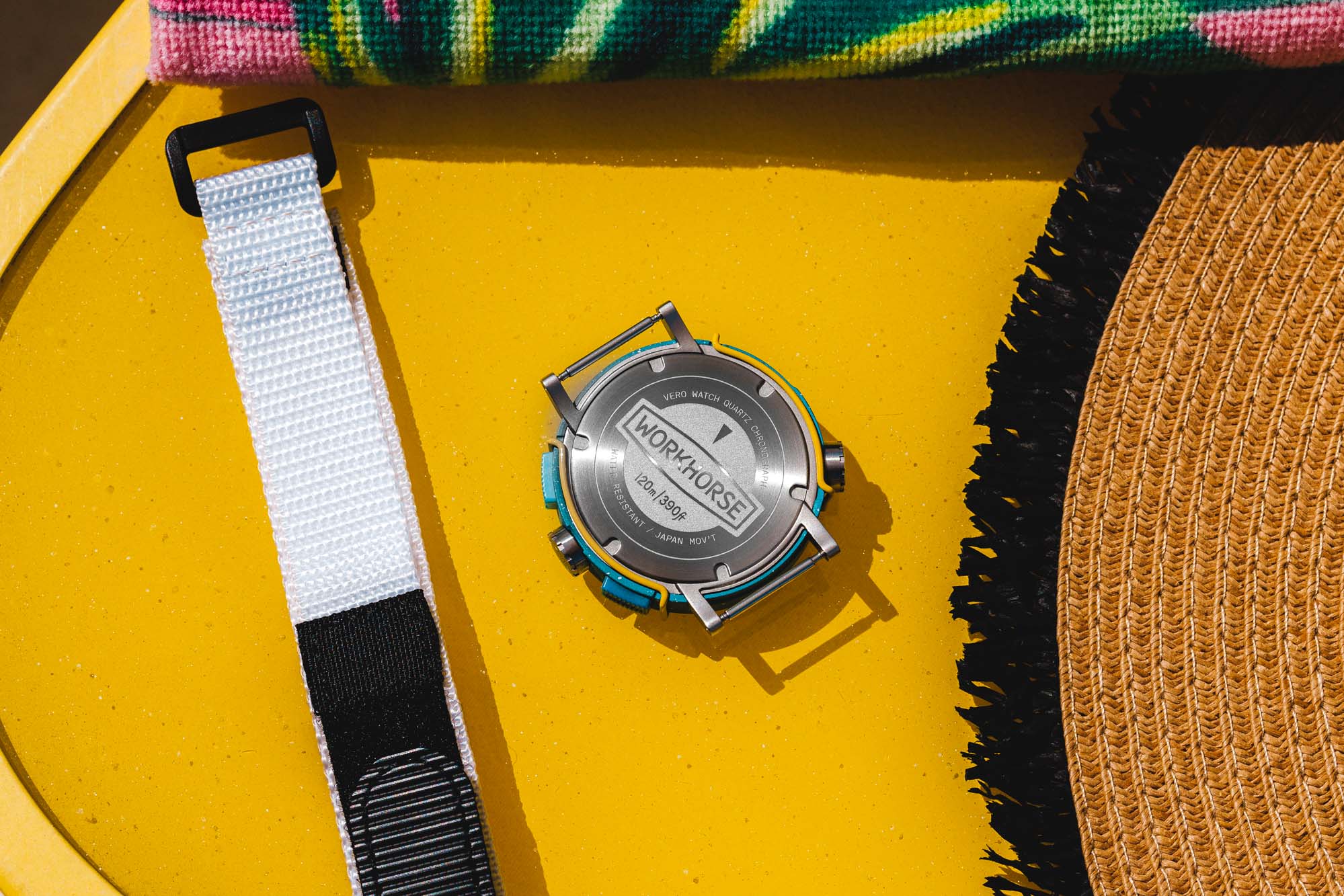 This version of the Workhorse is a limited edition collaboration between VERO and ADPT (“adapt” All Day, Purpose, and Terrain). A bright and colorful take on this modern sports watch, the collaboration utilizes the unique properties of Cerakote to create a bold aqua exterior with white flecks for a unique style. Aqua, white, fuschia, and a touch of yellow come together for a fun, summery look that still functions as a rugged tool watch.