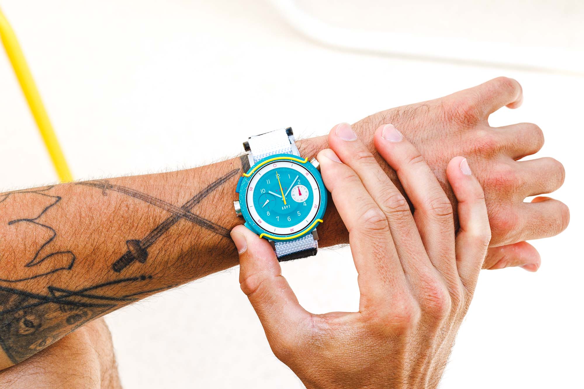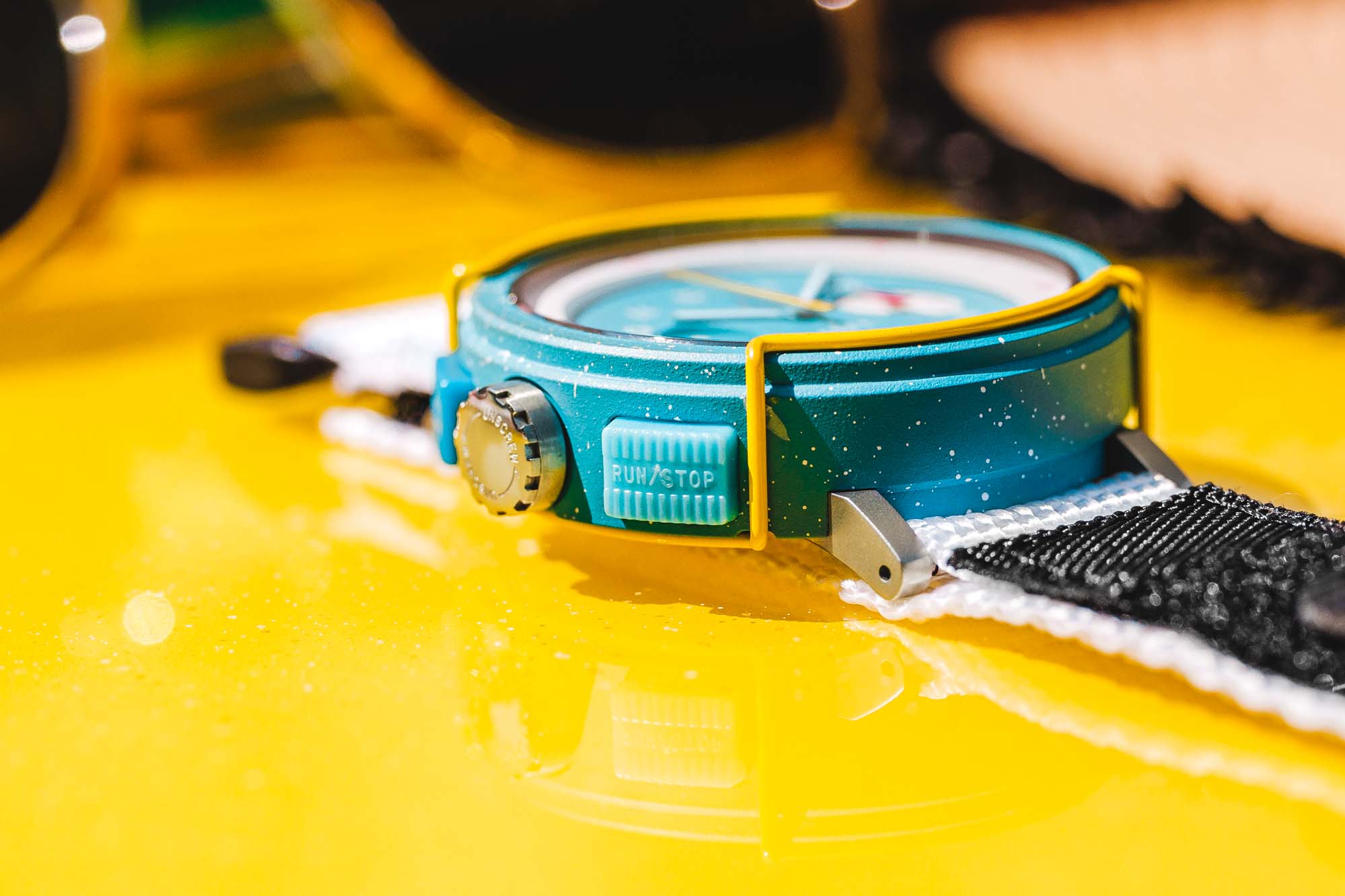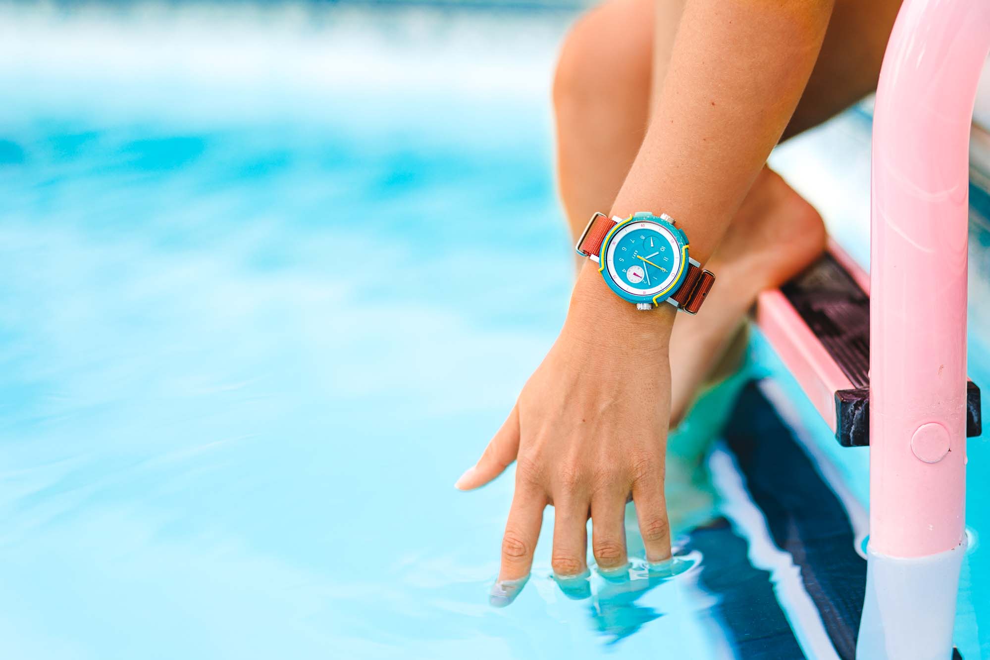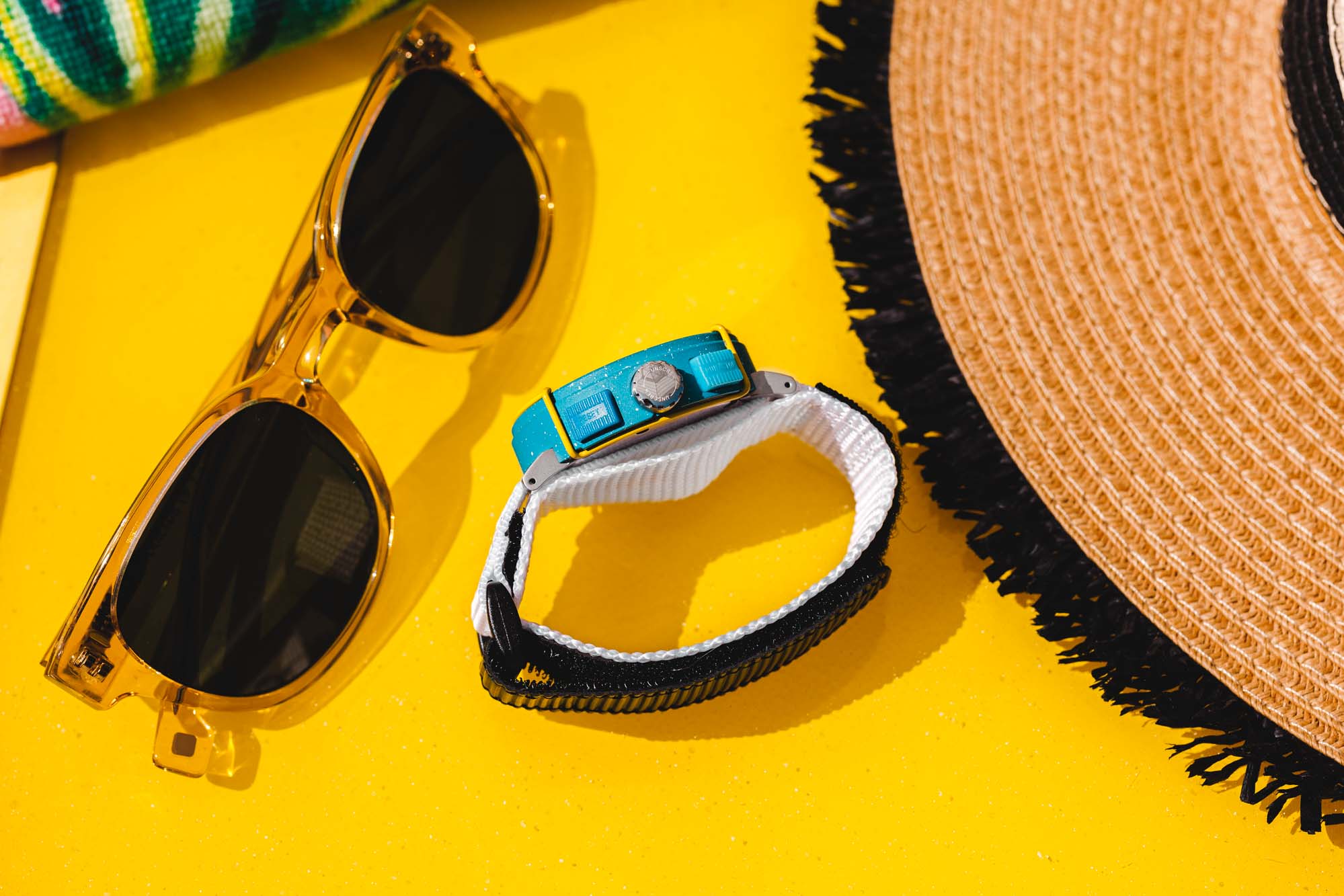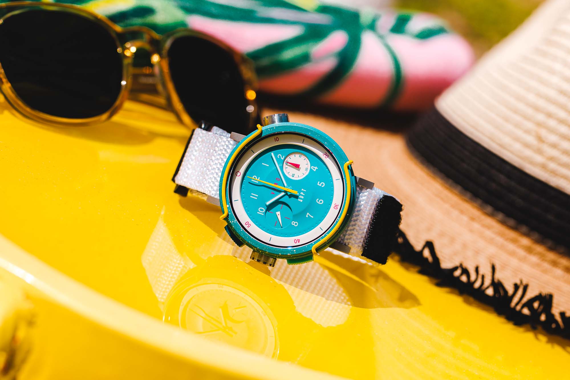 This version of the Workhorse is a limited edition collaboration between VERO and ADPT (“adapt” All Day, Purpose, and Terrain). A bright and colorful take on this modern sports watch, the collaboration utilizes the unique properties of Cerakote to create a bold aqua exterior with white flecks for a unique style. Aqua, white, fuschia, and a touch of yellow come together for a fun, summery look that still functions as a rugged tool watch.