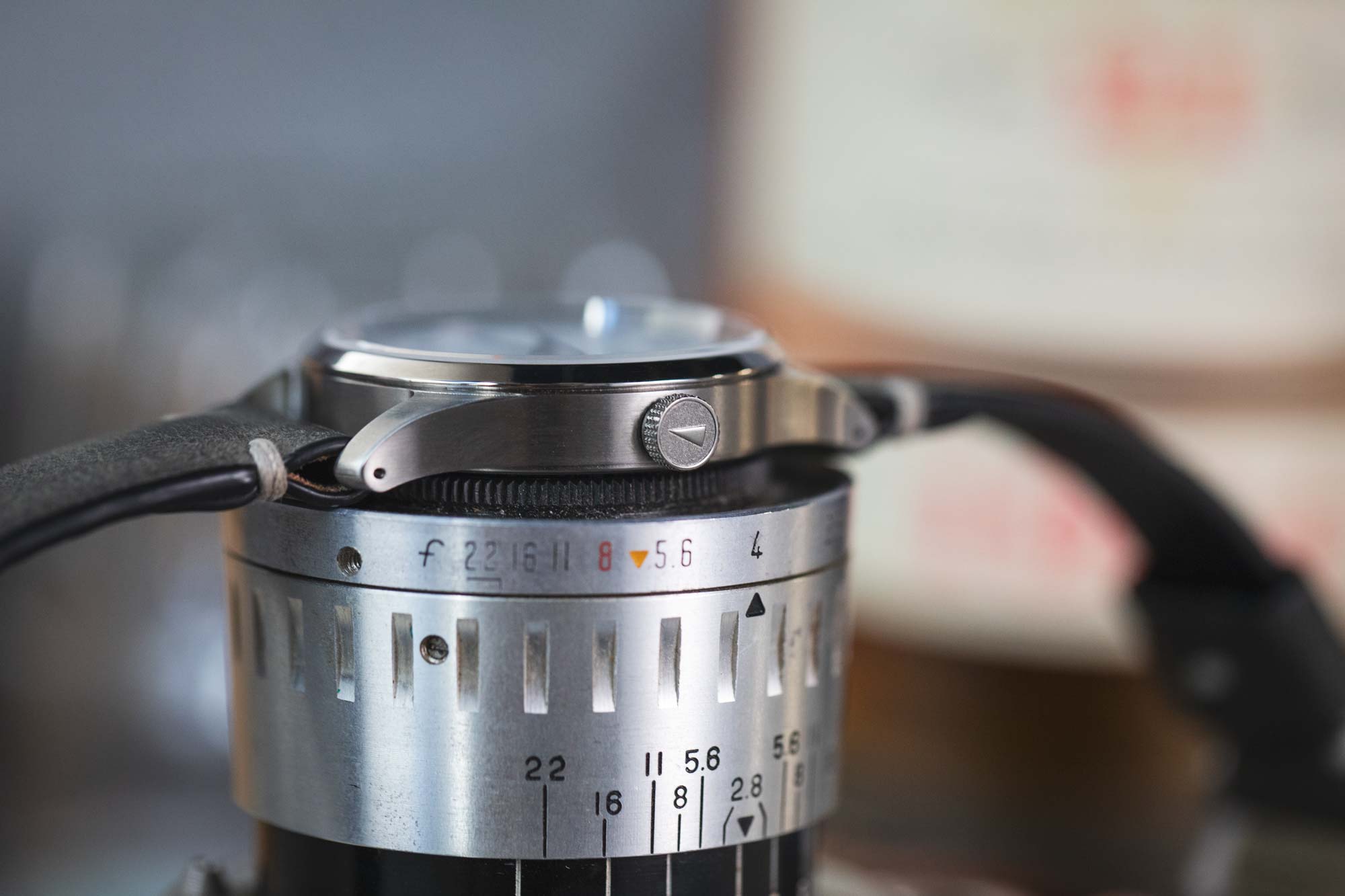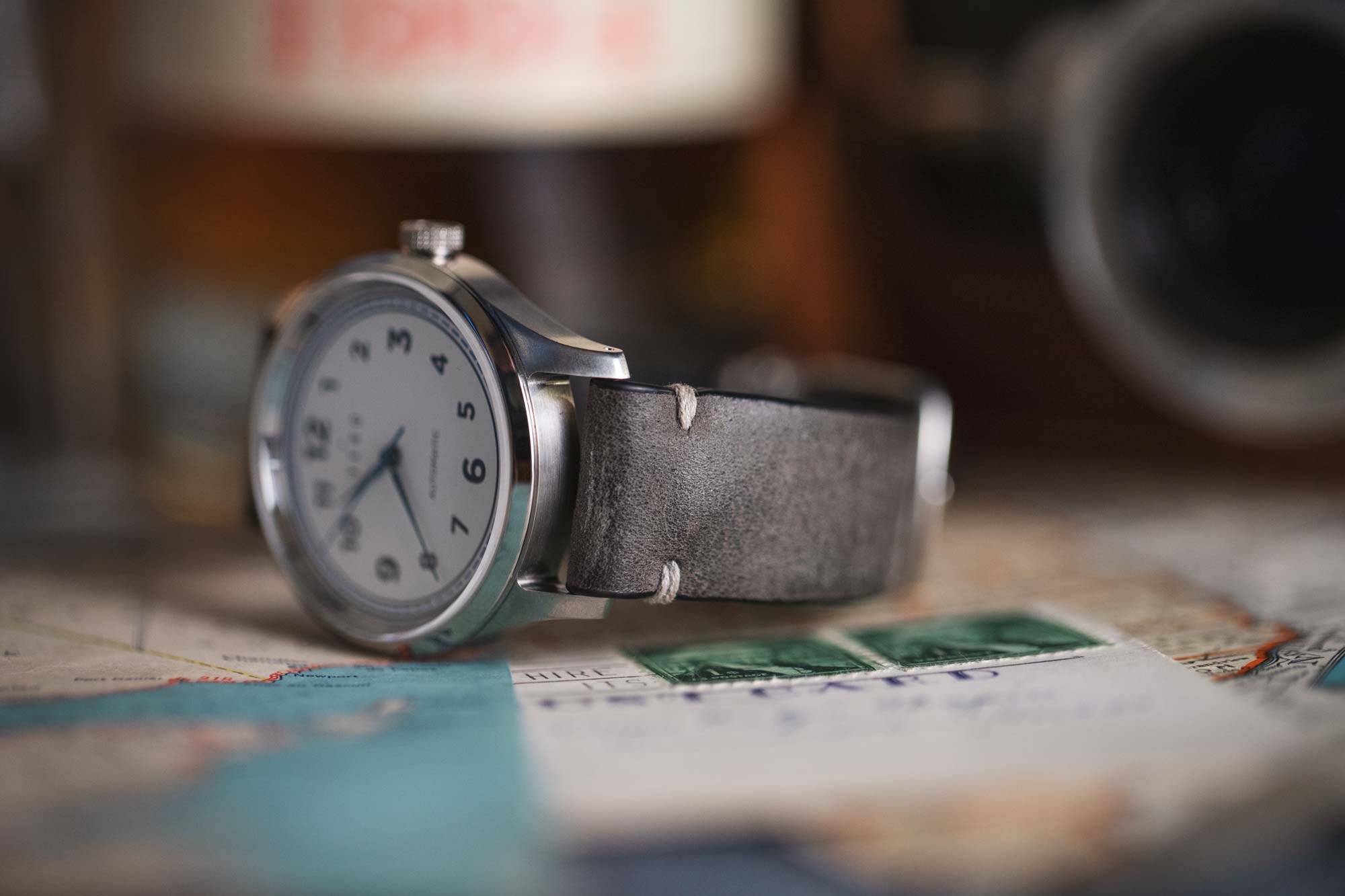 The Granite is a military/hiking-field watch, inspired by the warm earth tones it’s designed to be used in. The dial is muted gray with white numerals and ochre accents on the text and minute/second track. The case is utterly different, matte-blasted then oxidized in a chemical bath for a warm, dark, aged appearance, speaking to the "parkerization" process used on some military watches. The Granite is masculine and outdoorsy, best paired with hard wearing materials and dark tones.