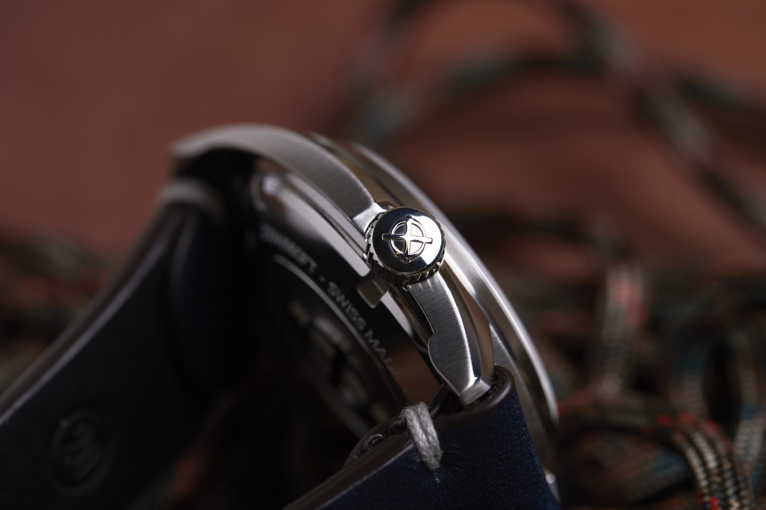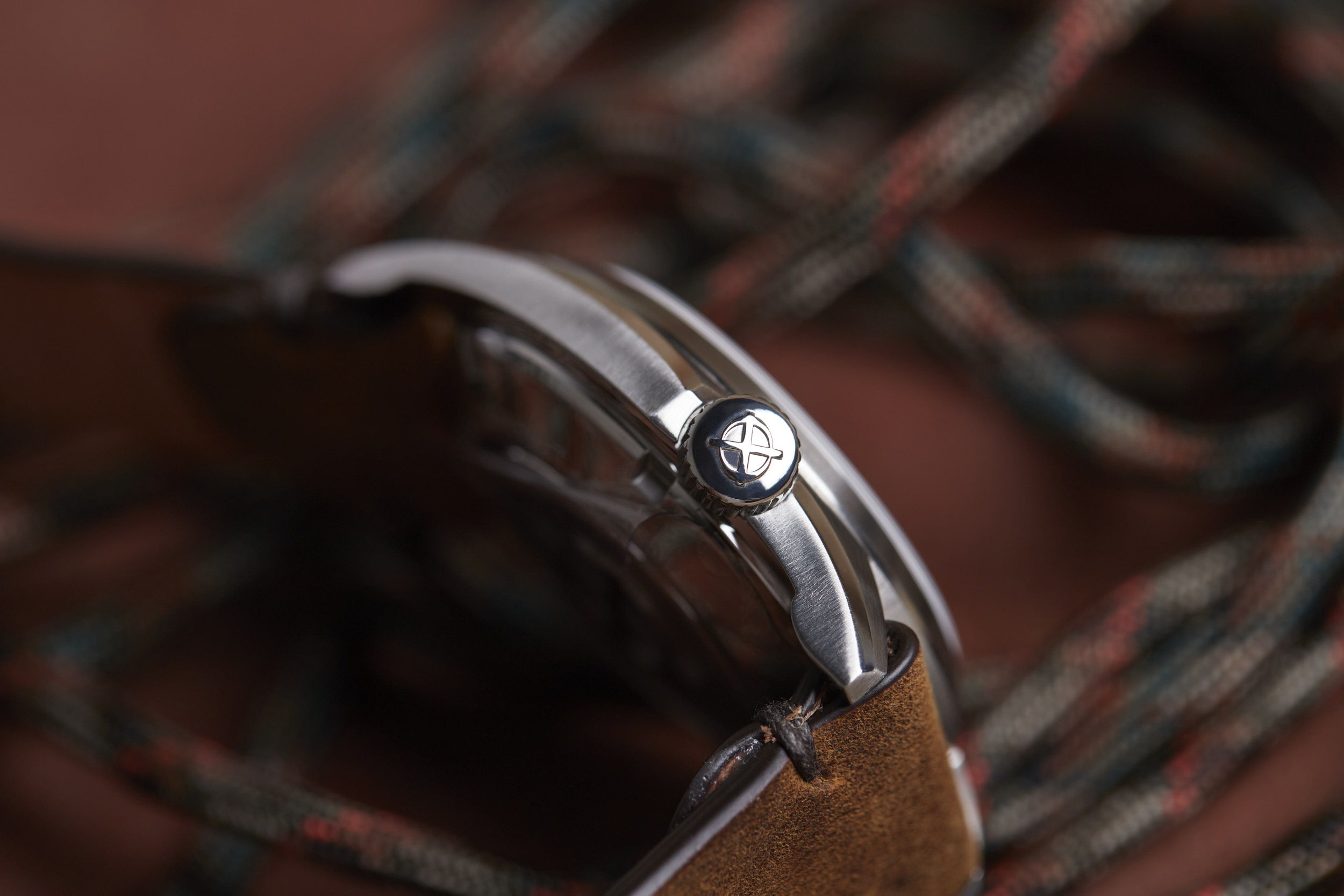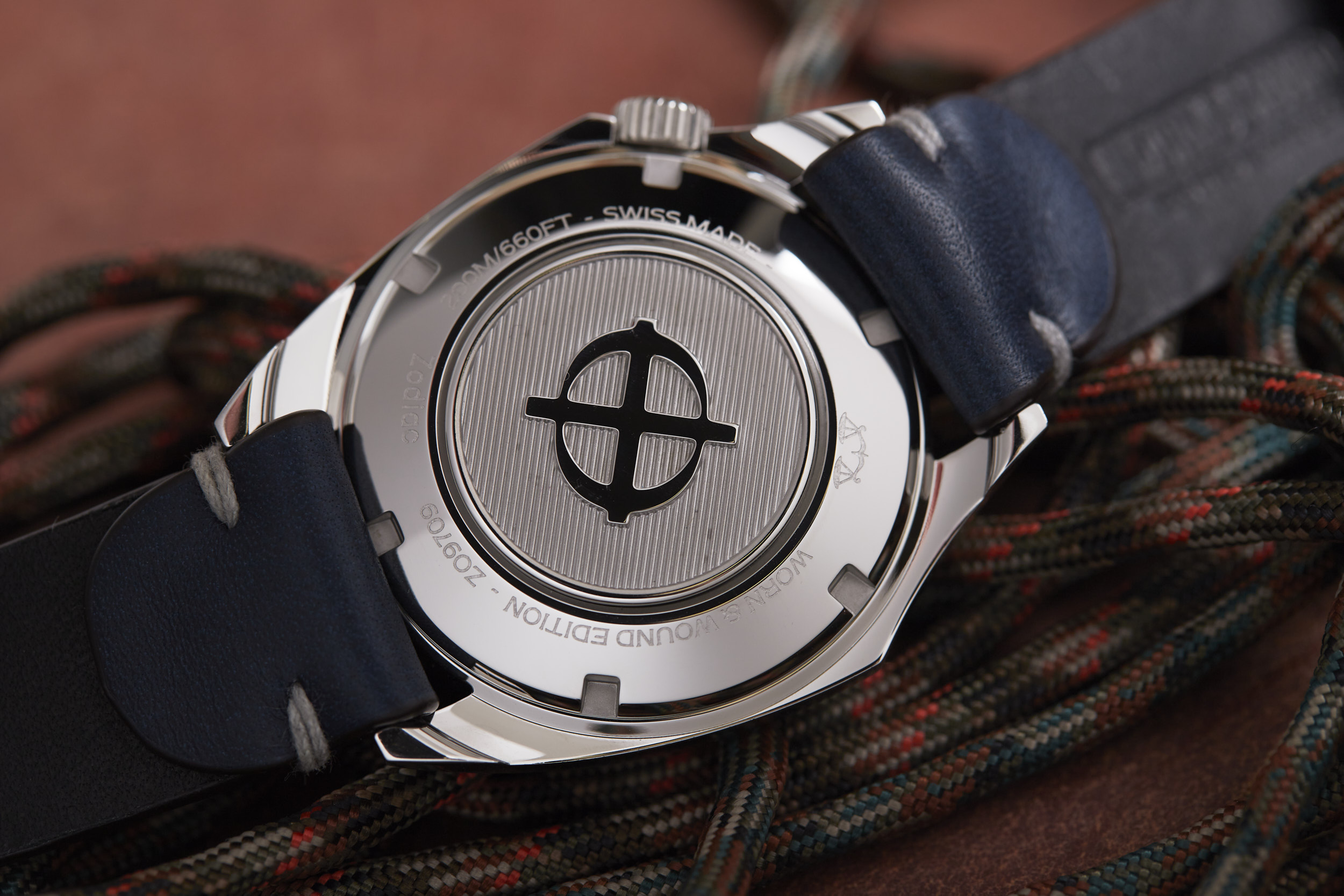 The Olympos Military Worn & Wound Edition is a beefed-up version of the design, based on a prototype created for the British Navy. Coming in at 40mm (38mm at the bezel), it retains the distinct “manta ray” shape, but with a generally more rugged build, a brushed finish, and an increased water resistance of 200m. The dial is pure classic military, with a railroad minute track around bold, lumed numerals. The hands too are a true-mil style adding to the overall legibility of the watch.