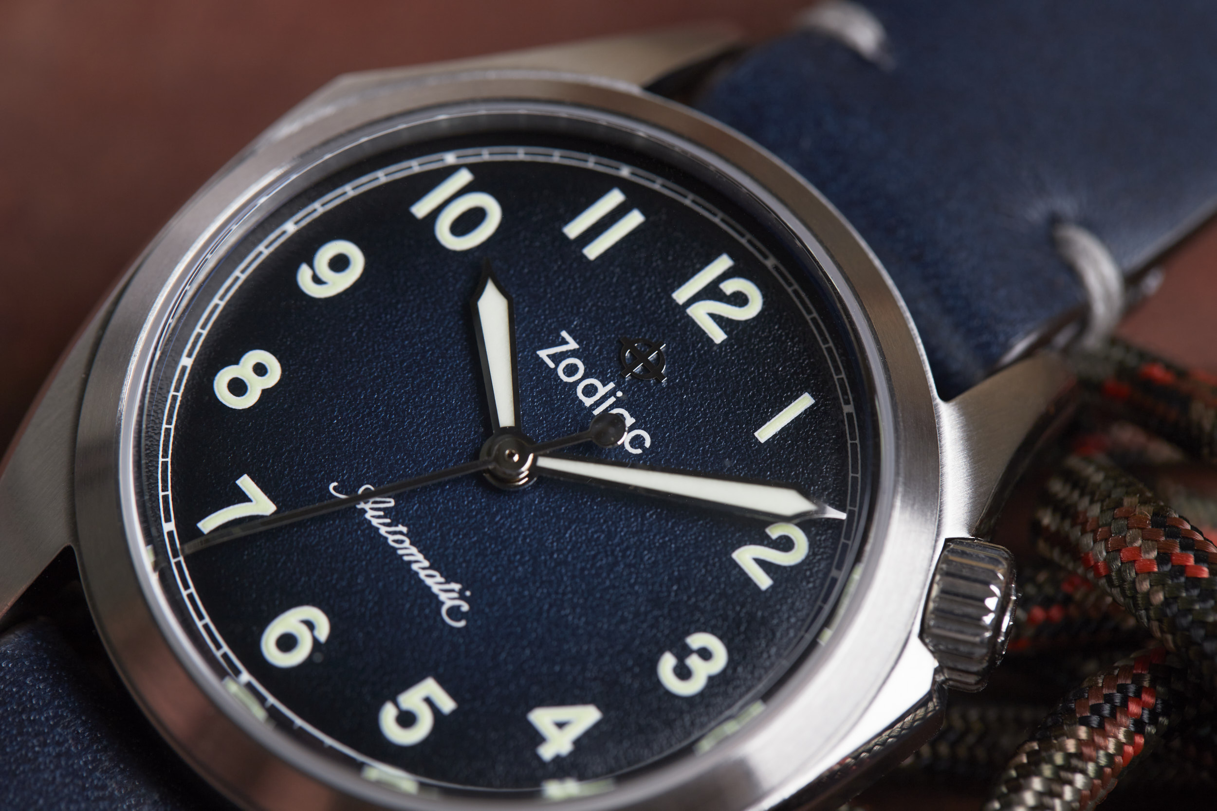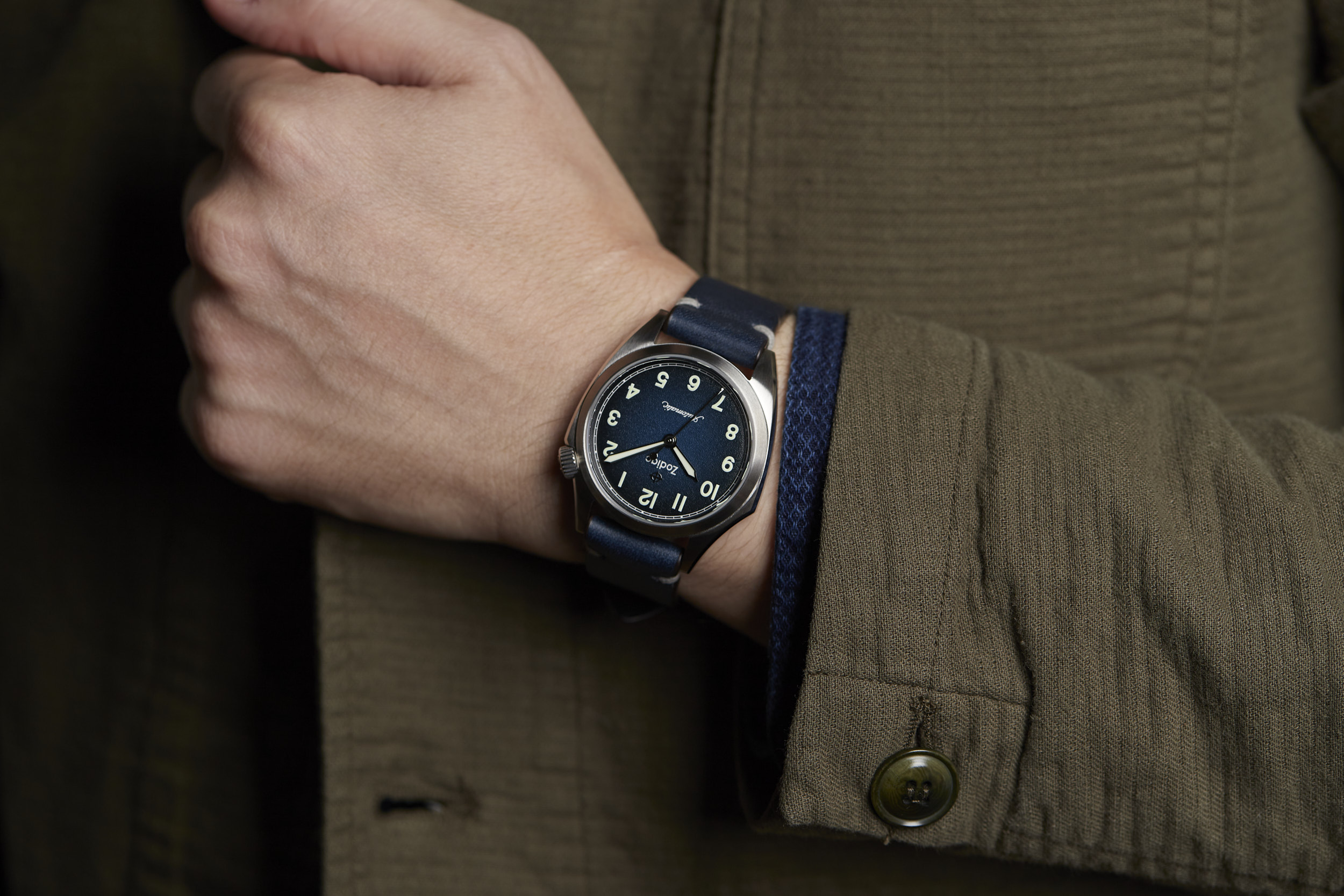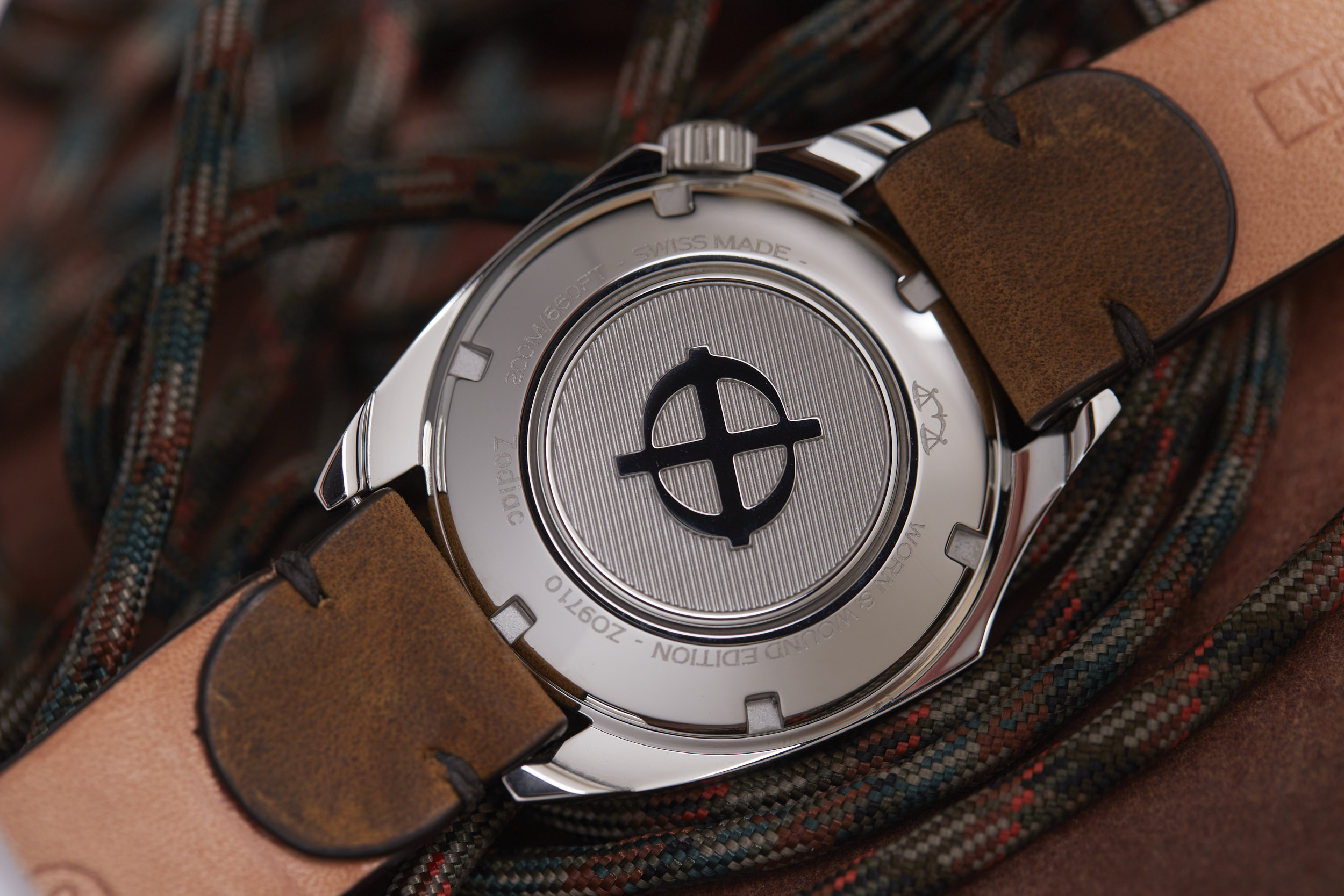 The Olympos Military Worn & Wound Edition is a beefed-up version of the design, based on a prototype created for the British Navy. Coming in at 40mm (38mm at the bezel), it retains the distinct “manta ray” shape, but with a generally more rugged build, a brushed finish, and an increased water resistance of 200m. The dial is pure classic military, with a railroad minute track around bold, lumed numerals. The hands too are a true-mil style adding to the overall legibility of the watch.