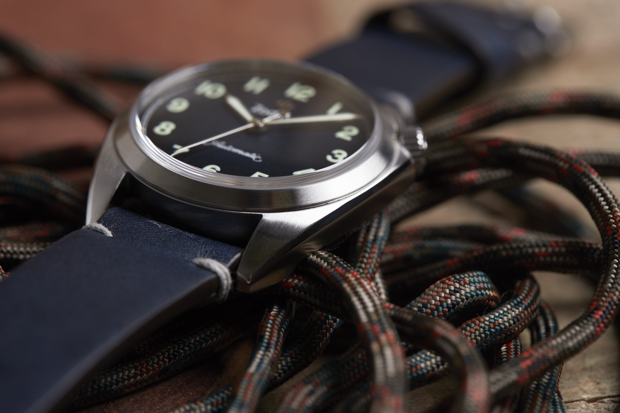 The Worn & Wound edition, exclusive to the Windup Watch Shop, is available in two dial colors, both including two original, US-Made straps. The first is a navy blue to black gradient with green lume, which is paired with a blue leather Model 2 Premium strap. It’s cool, clean, and classic.