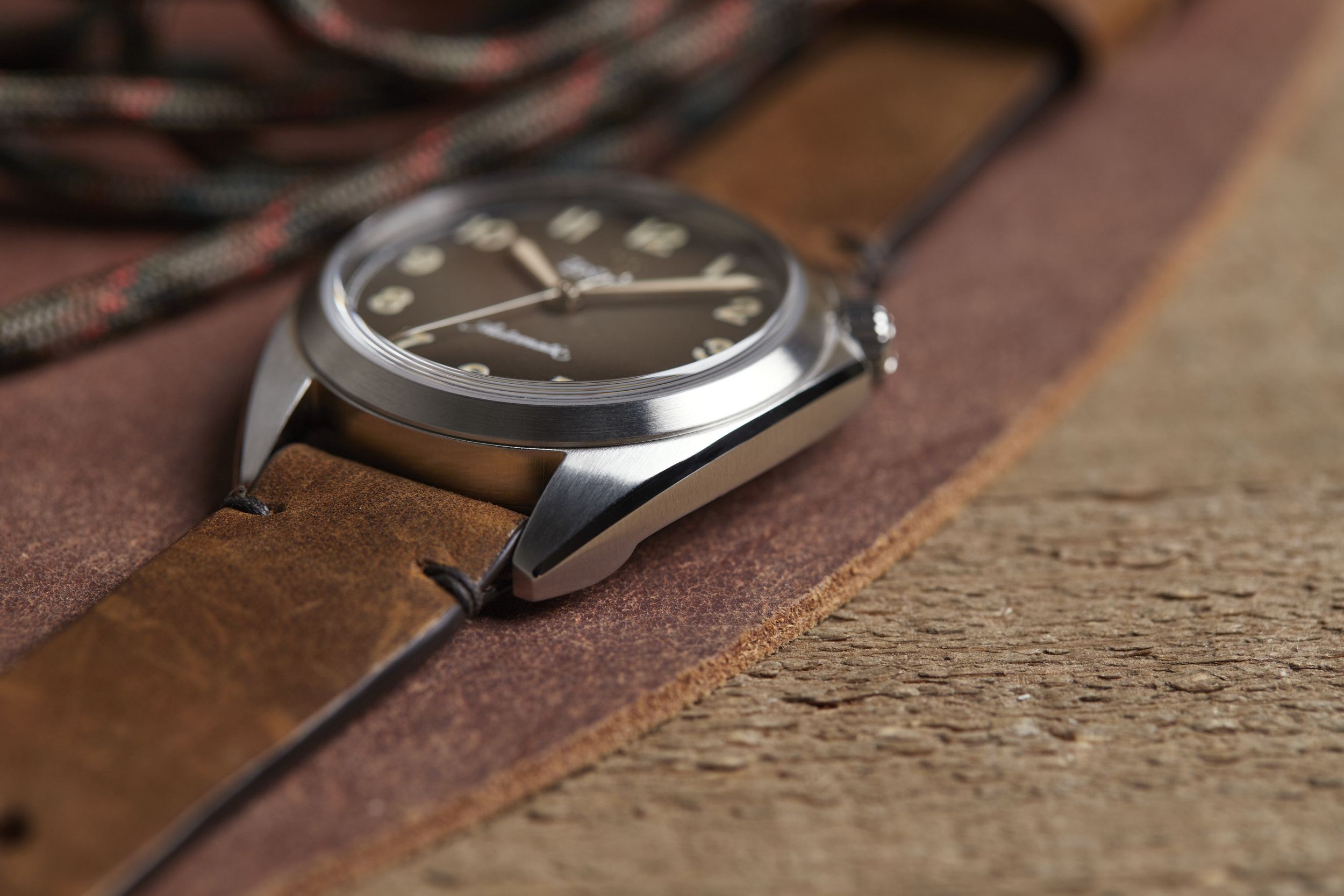 The second version features a pale brown to tobacco burst with burnt, khaki lume. This version is paired with a matter whiskey brown Model 2 Premium strap (please note the strap will differ from that in the photos). This style is more rugged and vintage in character.