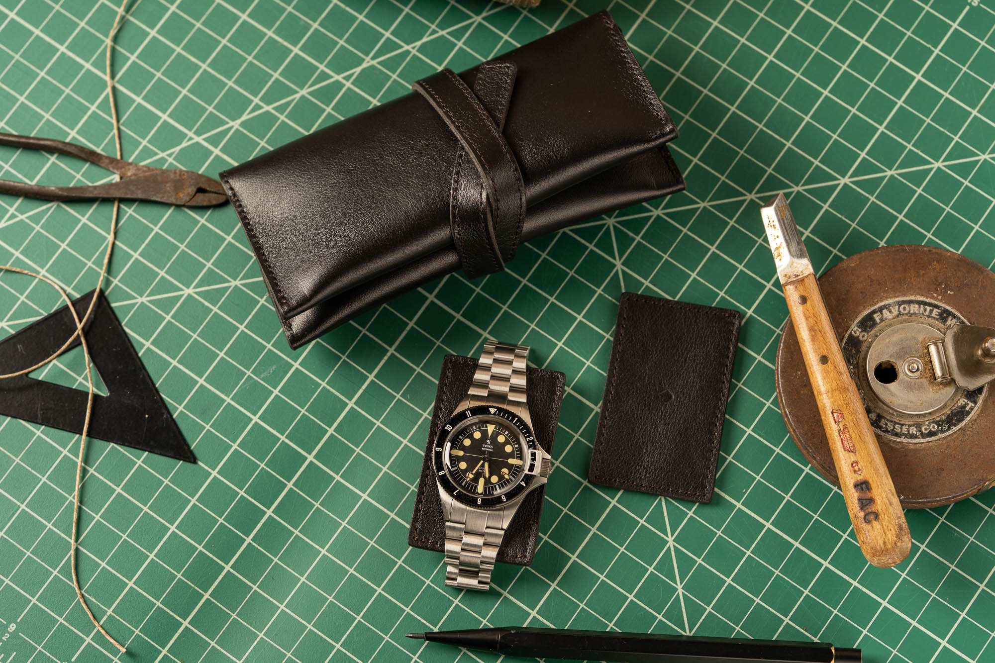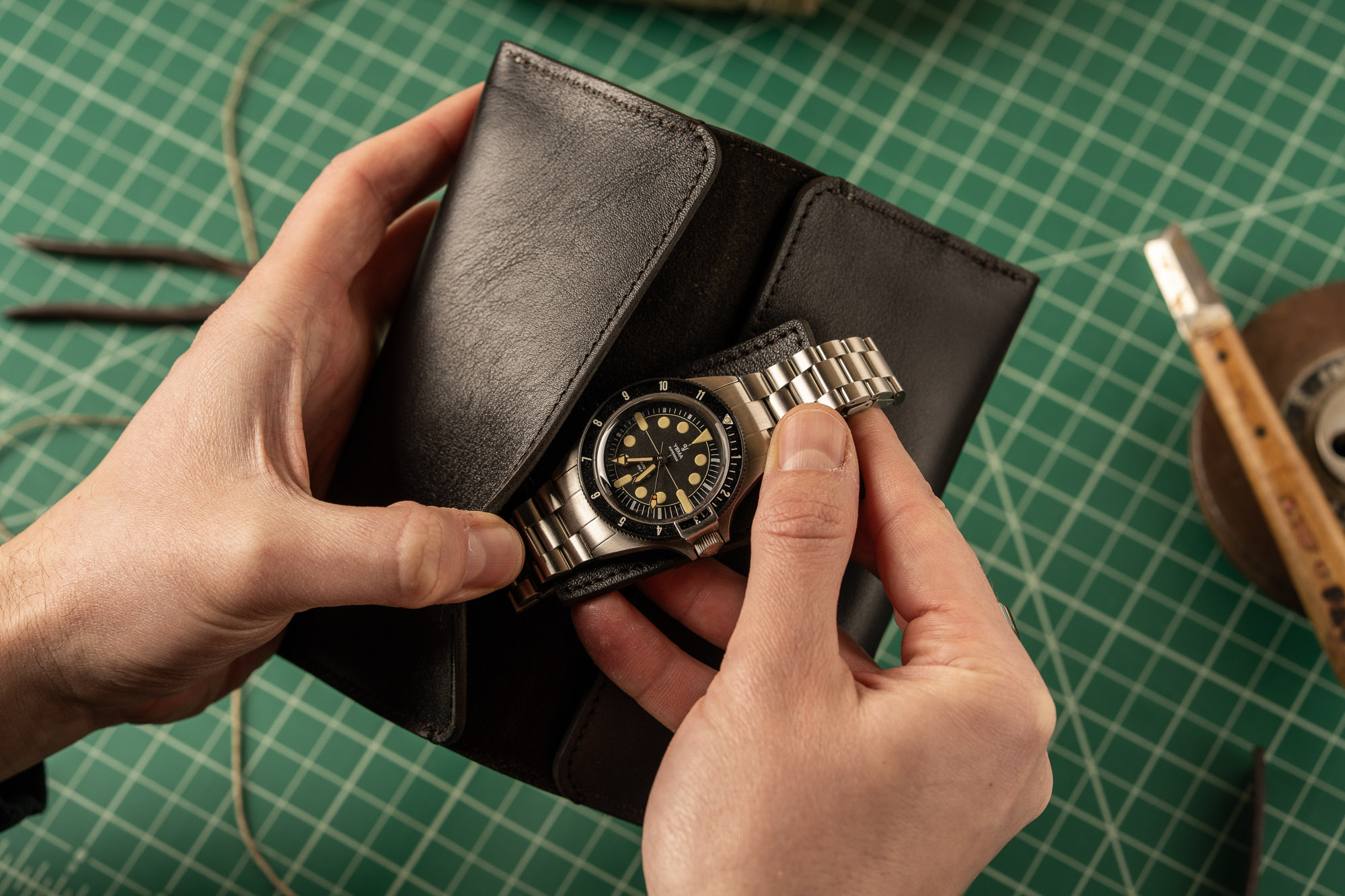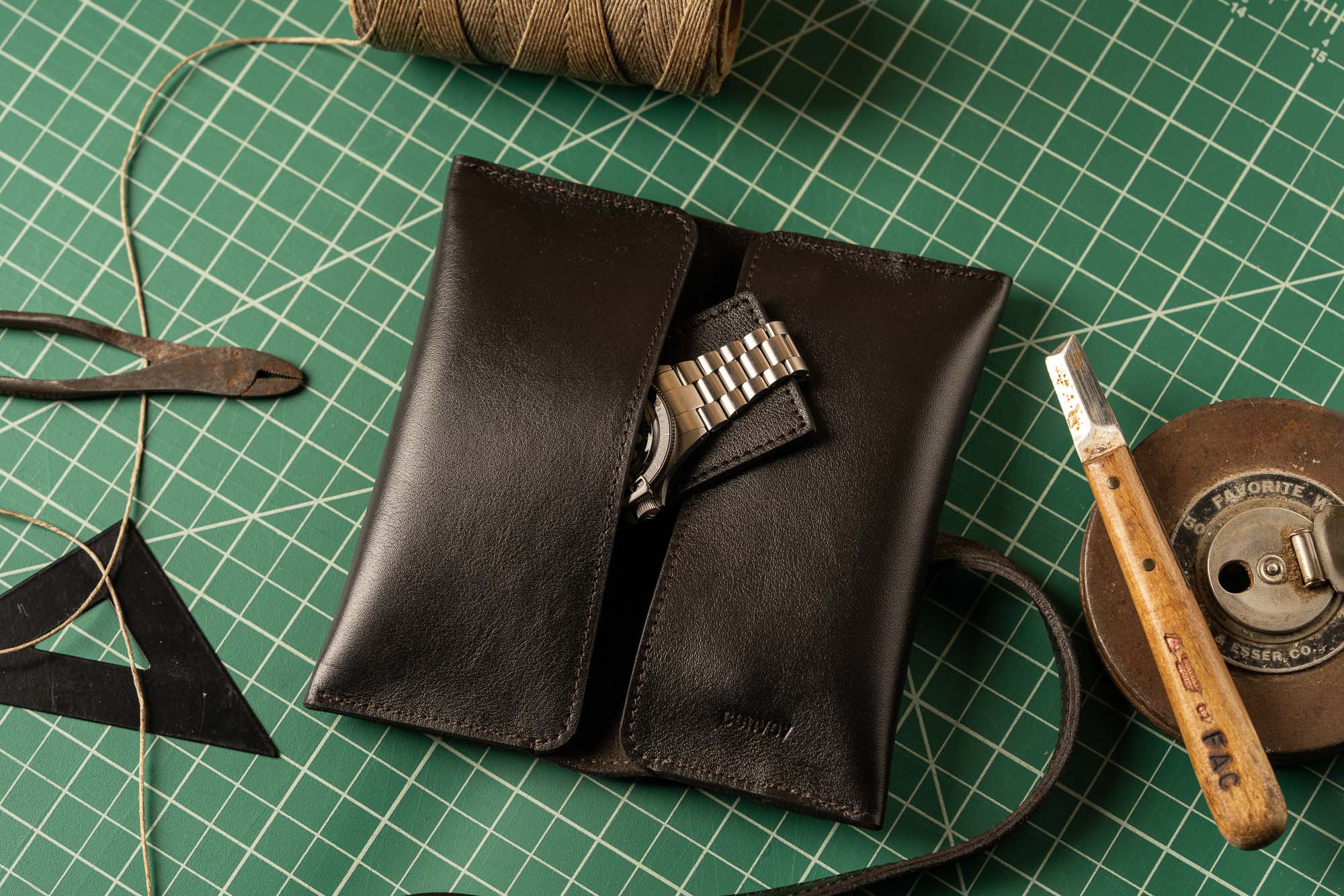 Pockets are side stitched for extra reinforcement and the roll is secured with a leather tether. Two leather watch rests lined with suede protect the casebacks of your watches.
