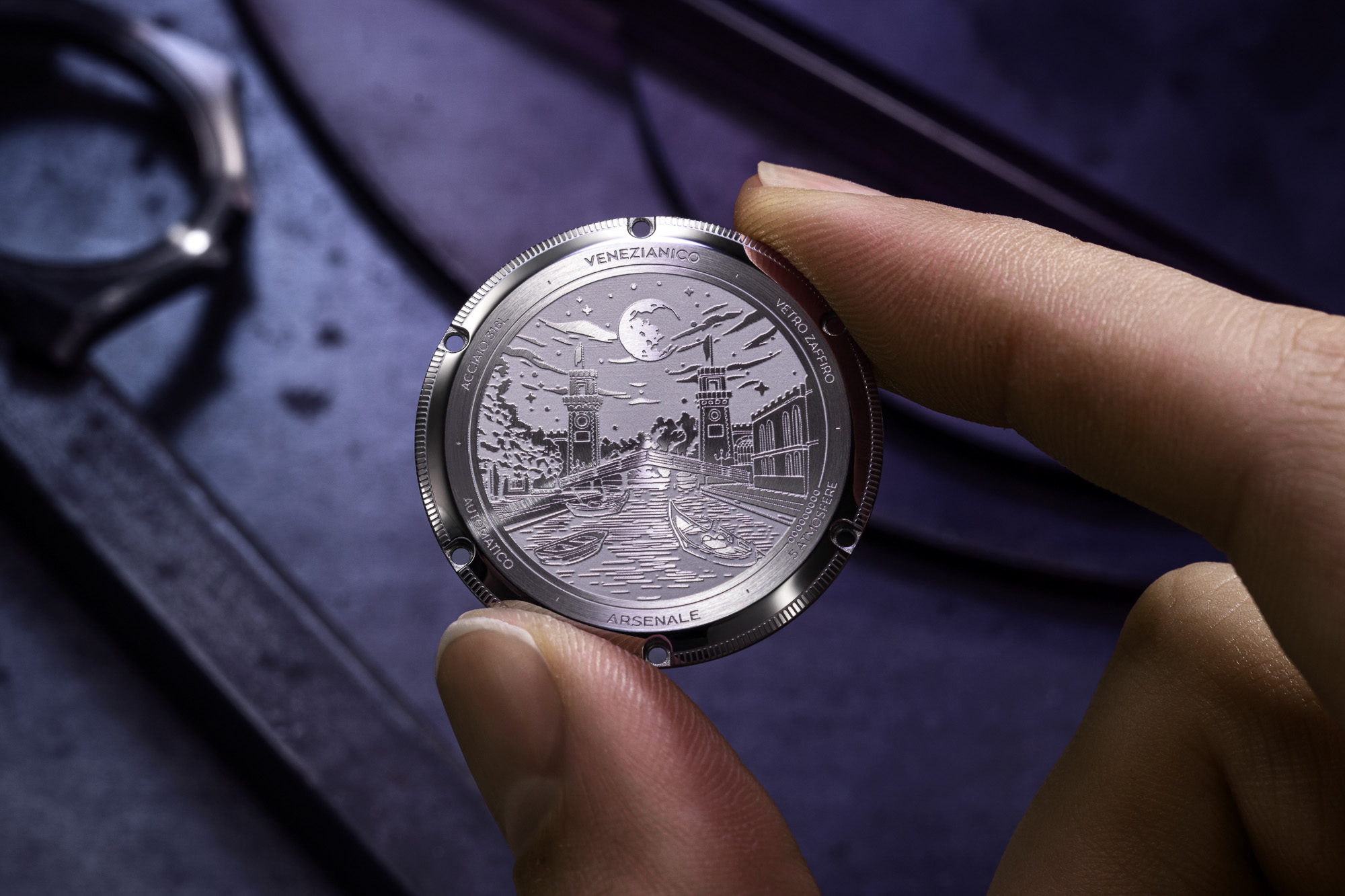 Internally, the timepiece is powered by the Miyota 9039 automatic movement, a premium high-beat caliber from the Miyota 9-series chosen specifically to achieve the watch’s slim 9mm profile. Operating at a frequency of 28,800 vibrations per hour, the no-date movement provides a smooth mechanical sweep and a 42-hour power reserve while ensuring the dial remains uncluttered. The mechanical heart is protected by a solid caseback featuring a custom relief engraving of the historic Venetian Arsenal, and the watch is sealed for 50 meters of water resistance.