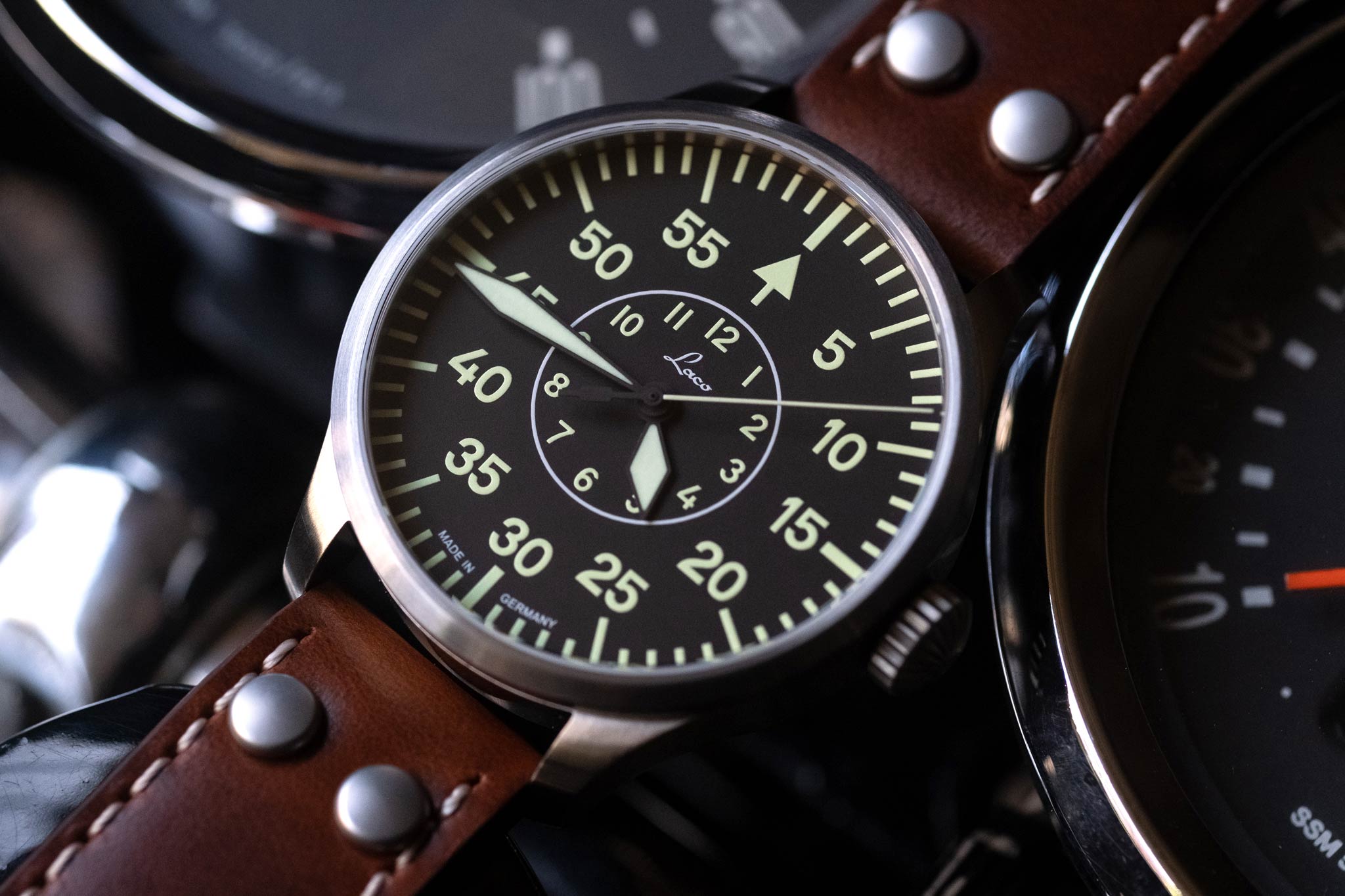 In the 1940's, only a handful of companies were selected to manufacture pilots watches for the German Airforce. Laco was one of these companies, and today they bring that heritage to their watches. You'll notice that their "original" series all feature "FL23883" engraved into the case, on the side opposite from the crown. This number indicates the watch was made to military specification for pilots.