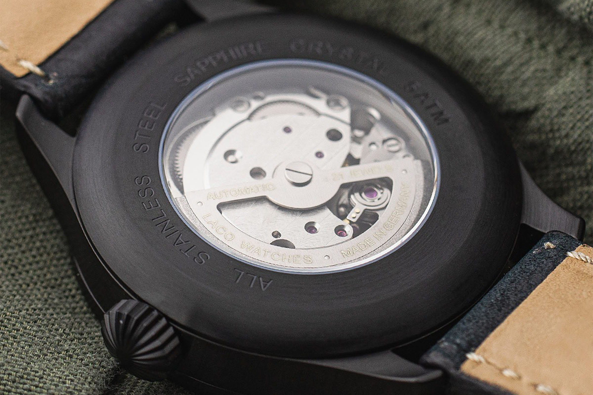 Powering these high-flying twins is the Laco 2S, a Miyota 82S0-derived caliber. A Japanese-made automatic movement, it features 21 jewels, hacking, hand winding, a frequency of 21,600 beats per hour, and a power reserve of at least 42 hours.