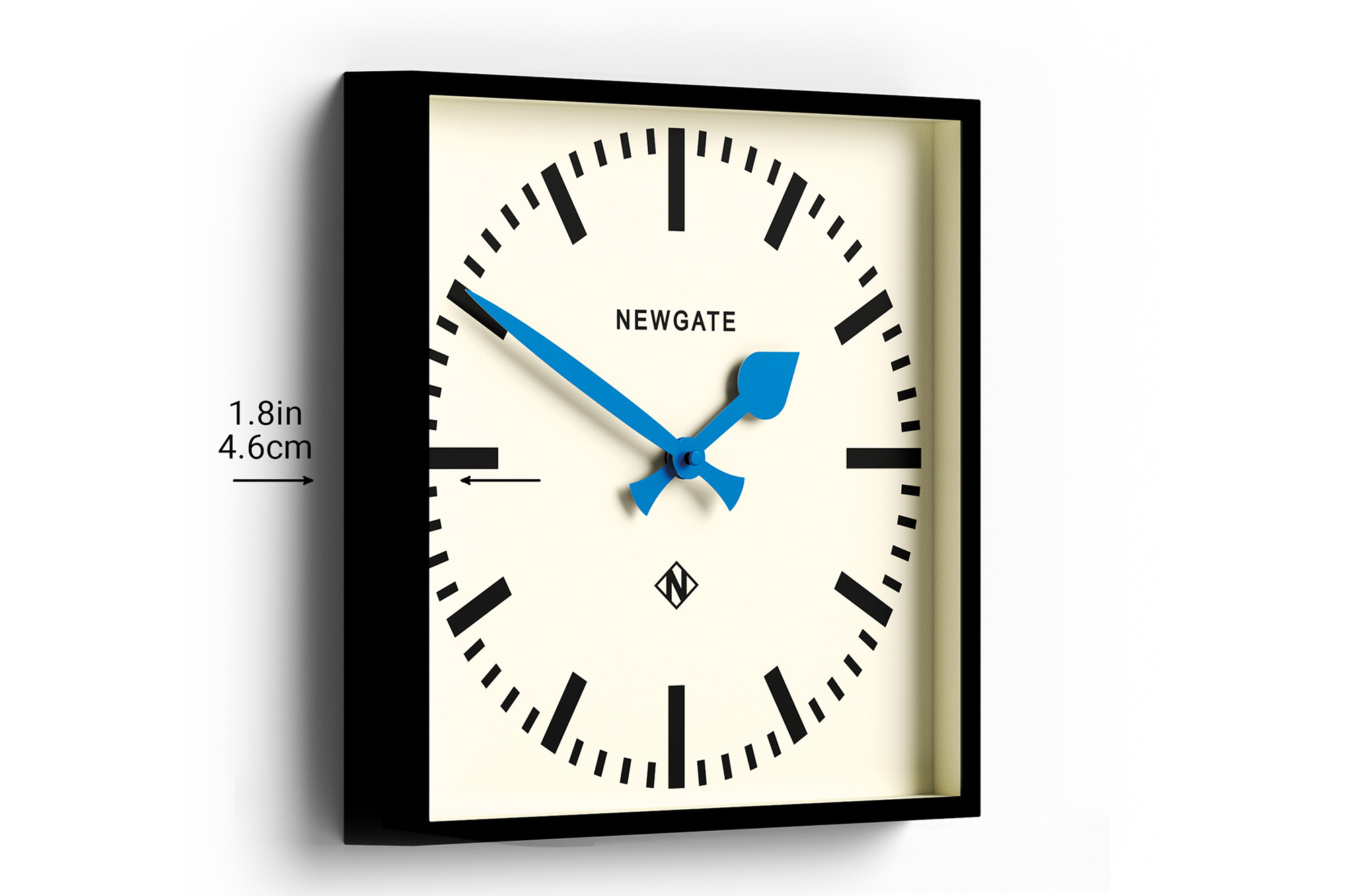 It is crafted from acrylic with a matte finish, complemented by metal hands and a glass lens. The clock comes in a matte black case, with blue hands.