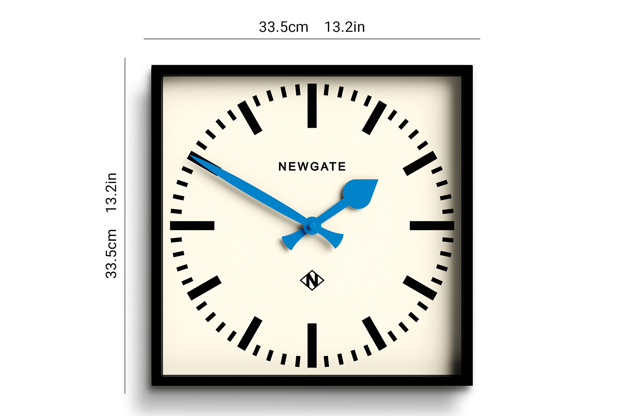 This square black station wall clock features a bold marker dial and colorful hands within a minimalist square case. The clock's vibrant design makes it an ideal addition to brighten up any room, whether it's the kitchen, living room, or office.