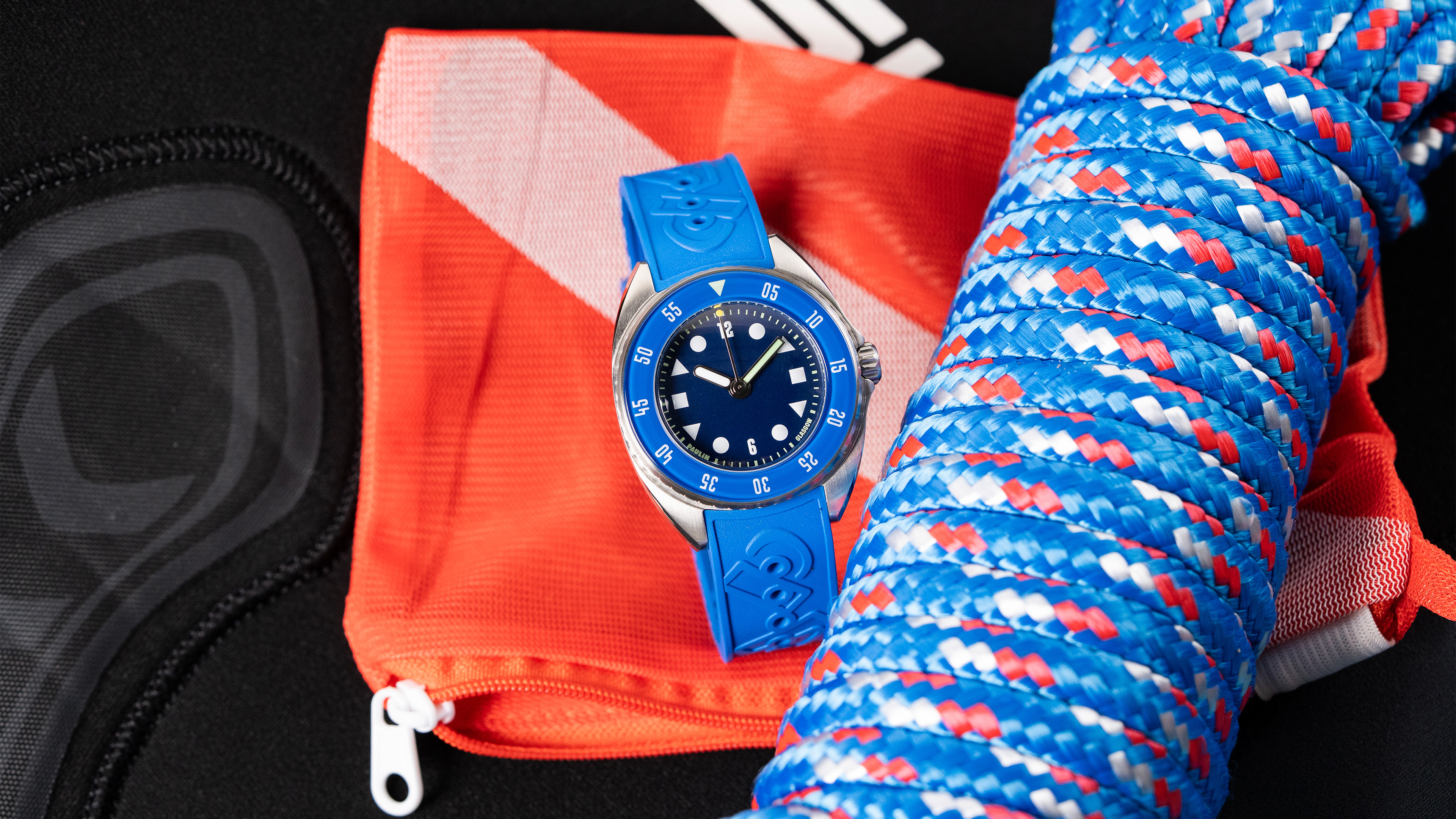 Where the Mara truly stands out is in the details. A domed sapphire bezel, printed with lume from underneath for durability, rotates with 120 precise uni-directional clicks. A double-domed sapphire crystal with triple-layer AR coating ensures clarity in all lighting conditions. Each watch ships with two straps: a form-fitting, injection-moulded HNBR rubber strap, and a recycled Tide fabric strap sewn in-house by anOrdain using Italian Alcantara lining—reflecting Paulin’s commitment to thoughtful material choices. Available in Blue or Black, the Mara redefines what a dive watch can look and feel like—without compromising on what it must do.
