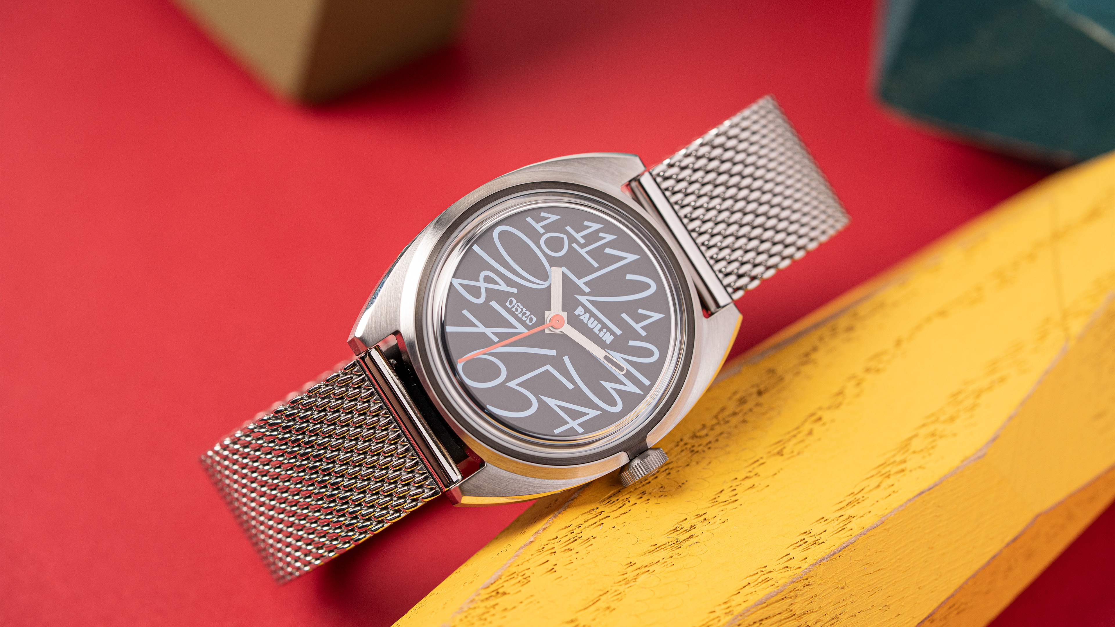 Inside beats a Paulin-modified ETA F06.105 quartz movement, delivering reliable, low-maintenance performance with flair. The watches come on a woven mesh bracelet and is the perfect match for design lovers, creatives, and anyone drawn to the intersection of typography and time.