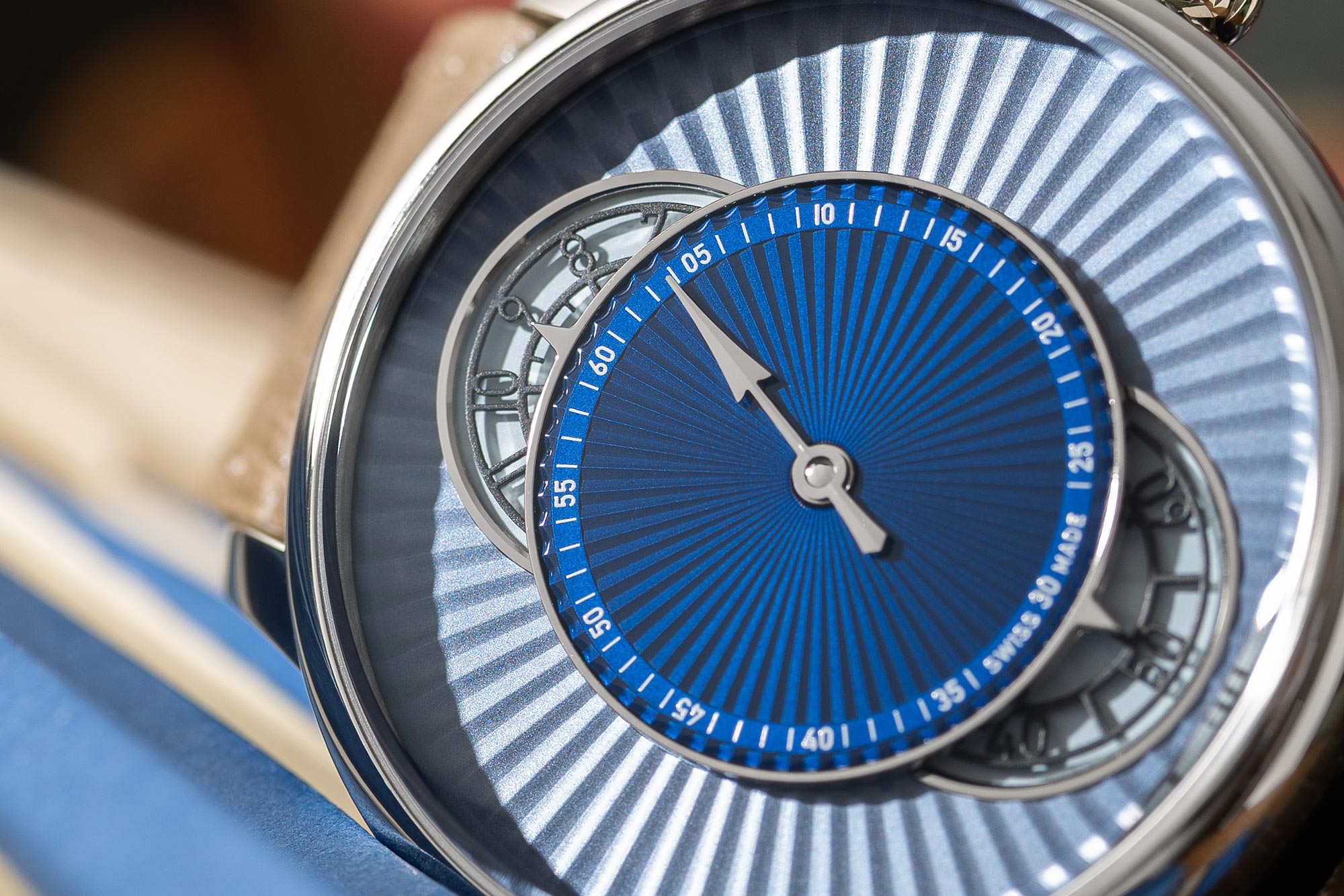 Its character centers on a layered regulator display that blends clarity with visual dynamism. Fully skeletonized hour and seconds discs rotate beneath an elevated cobalt-blue minute dial, giving the impression of floating typography. Crisp white minute markings provide focus, while a polished arrow-shaped minute hand, echoing Louis Erard’s fir-tree language, anchors the readout. The result is expressive yet legible, merging classical references with contemporary precision.