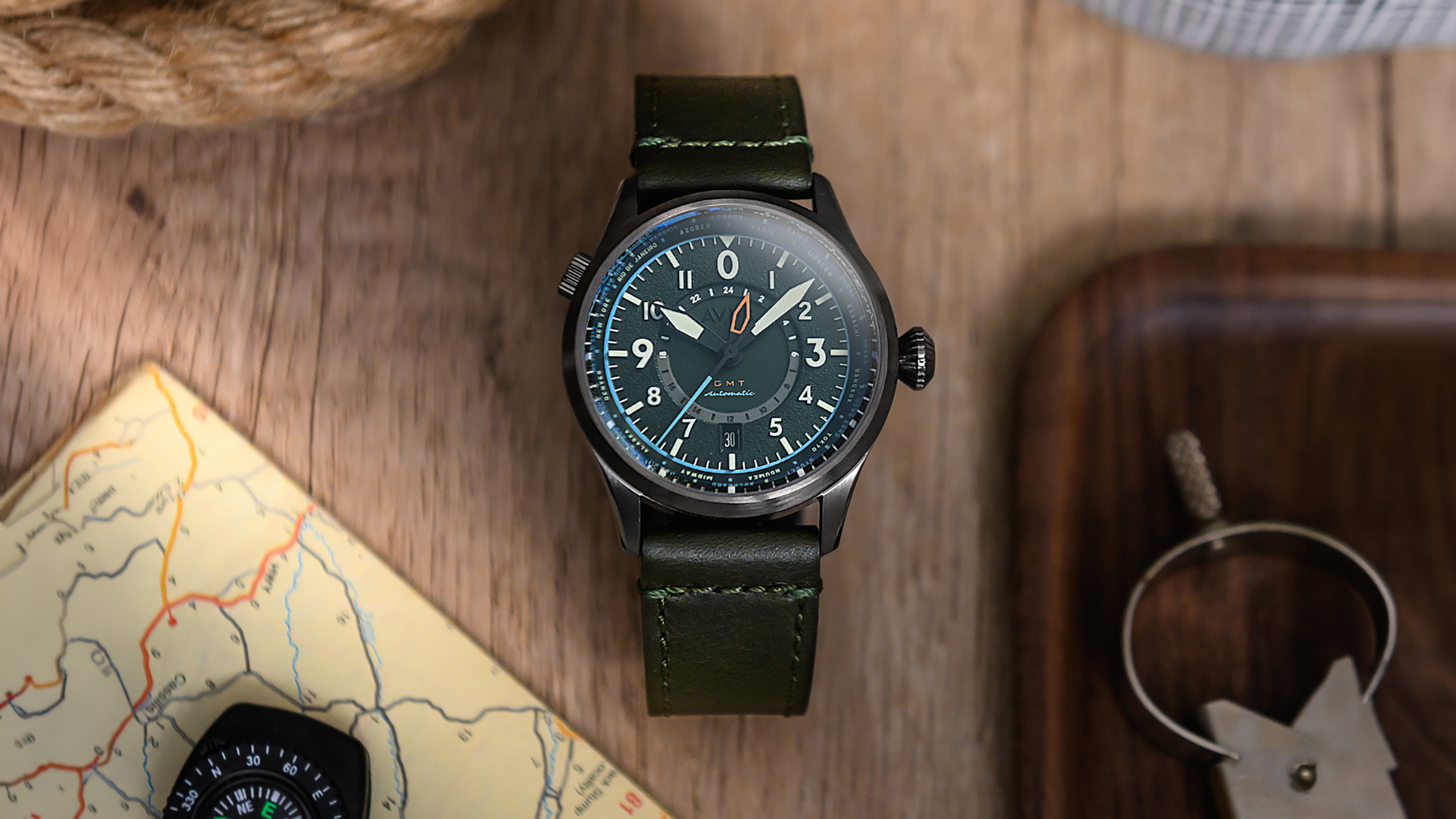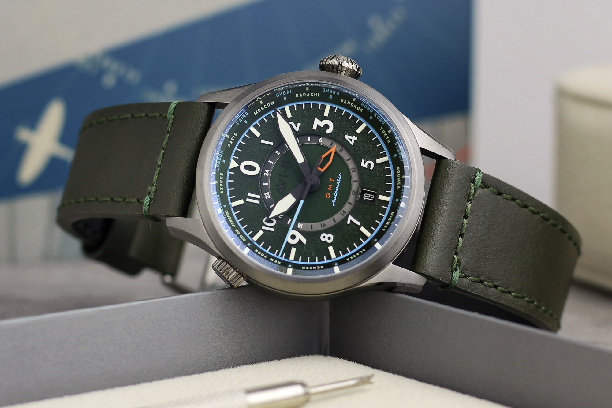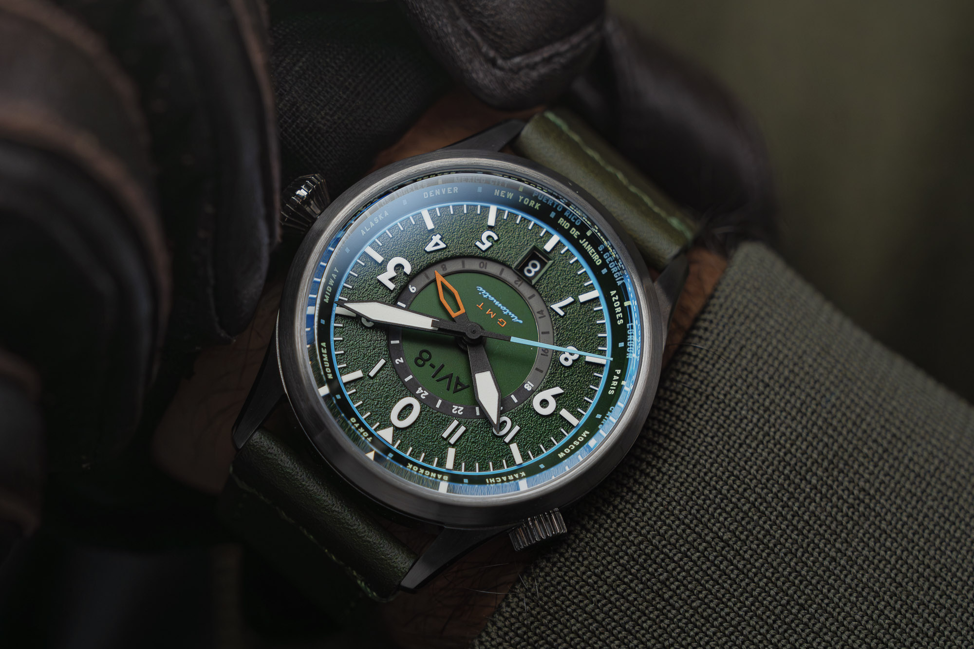 The AVI-8 Flyboy Wingman Worldtimer GMT Automatic (AV-4120-05) is a technical tribute to the mid-century pilot's watches used for long-haul navigation. This "Jungle Green" edition features a multi-layered textured dial that captures the rugged spirit of vintage cockpit instruments while integrating complex travel complications. The dial is accented with applied Arabic indices and a 24-timezone chapter ring, allowing the wearer to track global time across 24 major cities with a single glance.