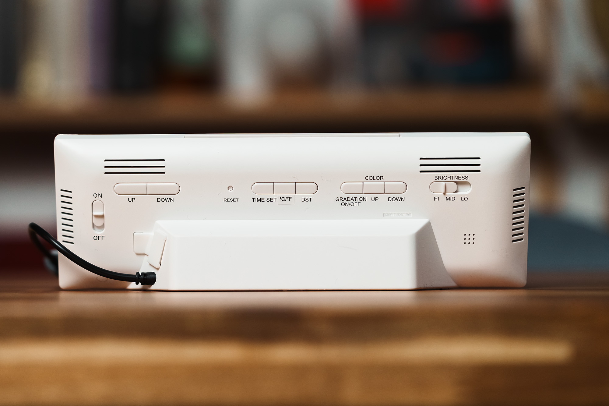 The 70 Colors Changing Everything Electric Alarm Clock comes in two colors, black and white. It measures in at 1.5" deep, 8.6" long and 3"high, barely taking any room. It displays the time, day, date, temperature and humidity. There is also an alarm feature with a slim snooze button at the top. As for power, the clock uses a 7.5V charger and a CR 2032 battery as a backup when it is being moved from room to room.