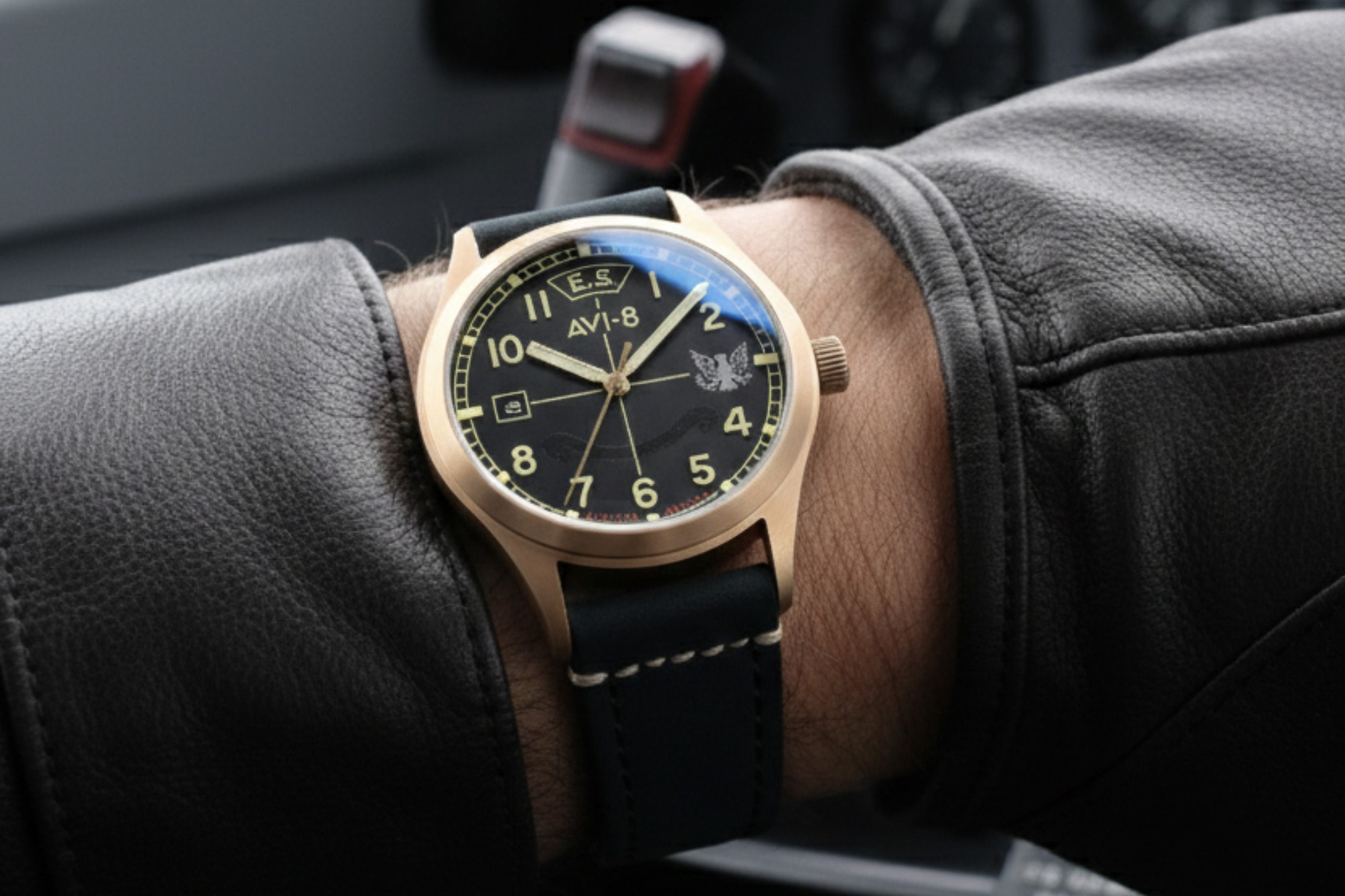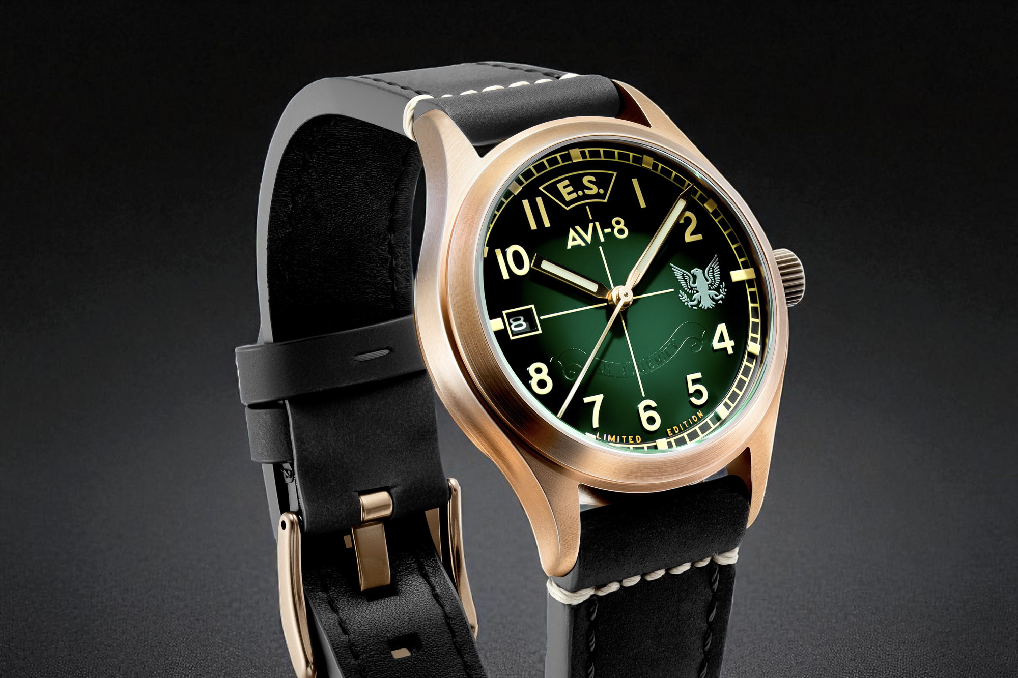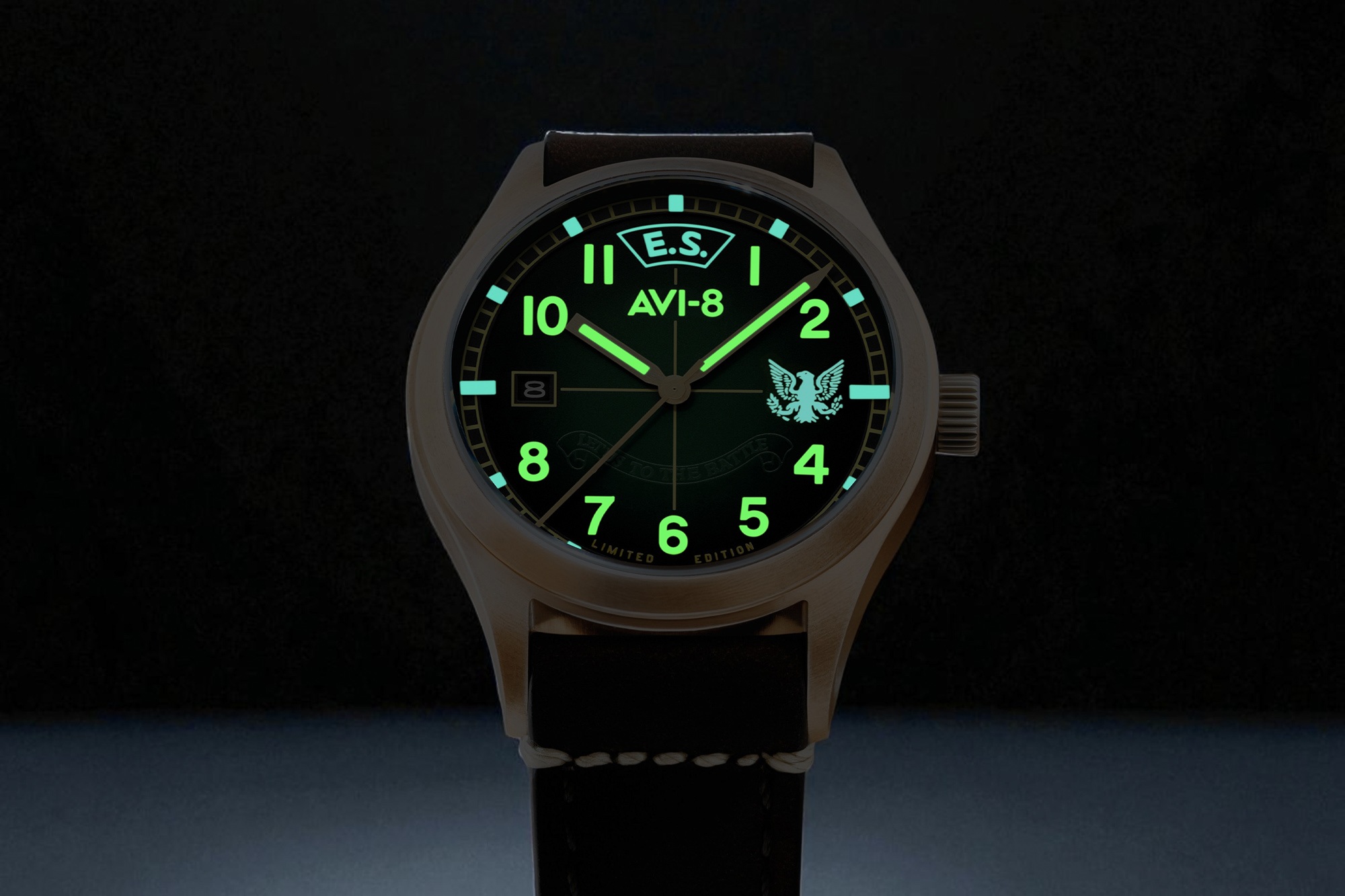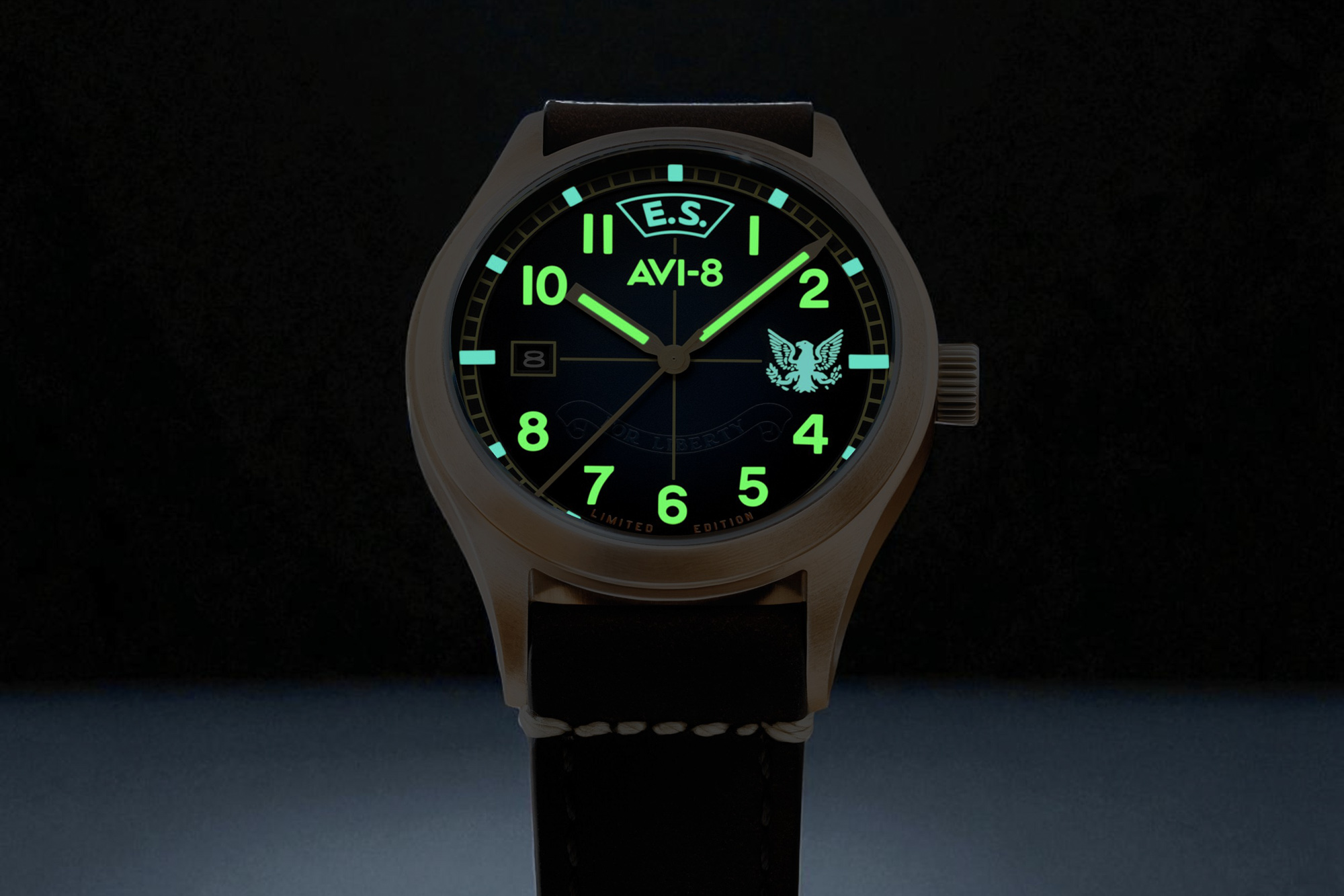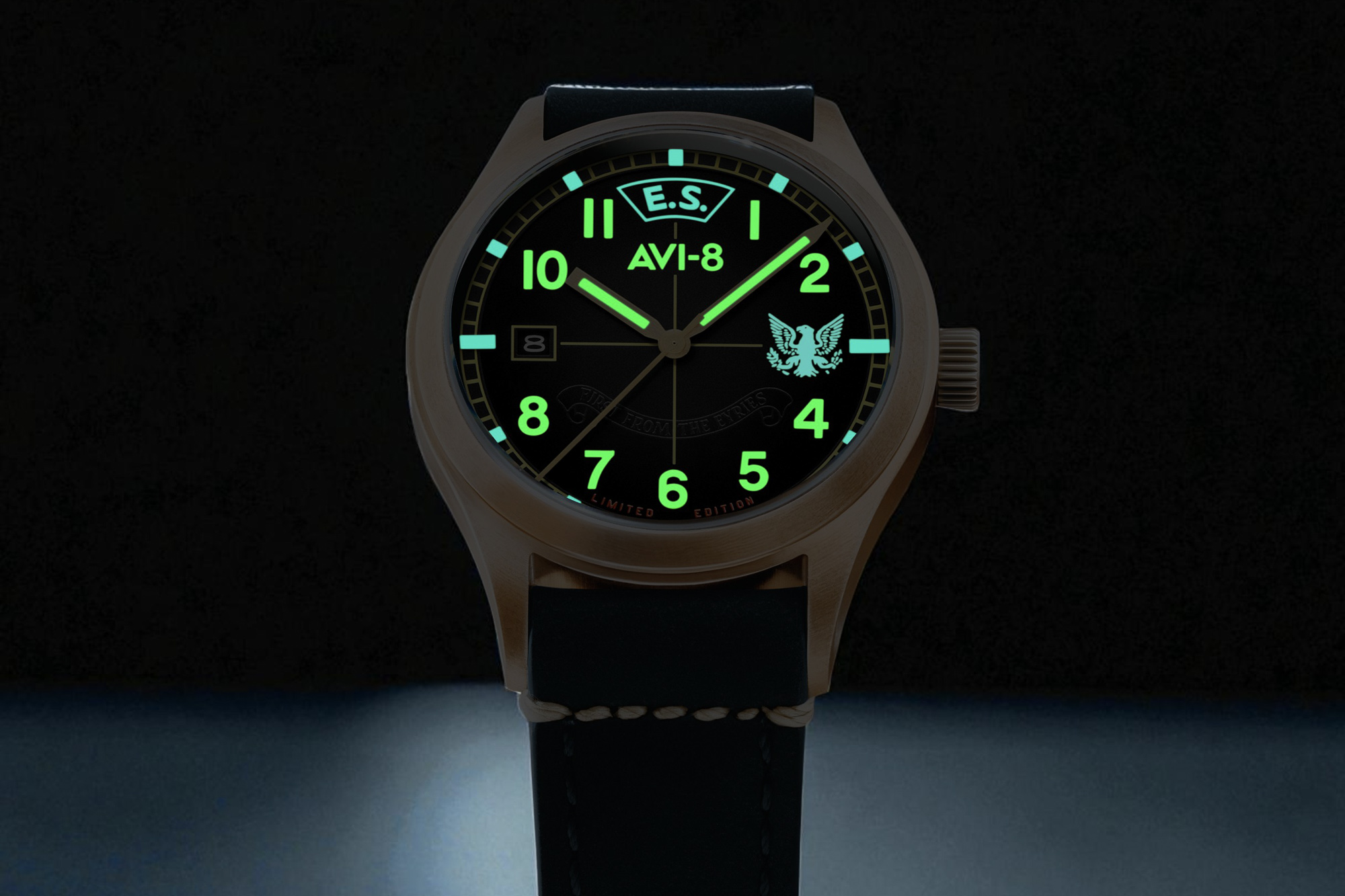 The AVI-8 Flyboy Eagle Squadron Automatic Bronze 85th Limited Edition commemorates the 85th anniversary of the Eagle Squadrons—American volunteer pilots who flew for the RAF before the US joined WWII. The collection includes three distinct variants, each representing a historic squadron and location: Gravesend (AV-4145-01), Southend (AV-4145-02), and Coltishall (AV-4145-03). These watches feature a genuine bronze case designed to develop a unique patina over time and a "hidden courage" dial that reveals a secret inscription under UV light: "First from the eyries / For liberty / Let us to the battle".
