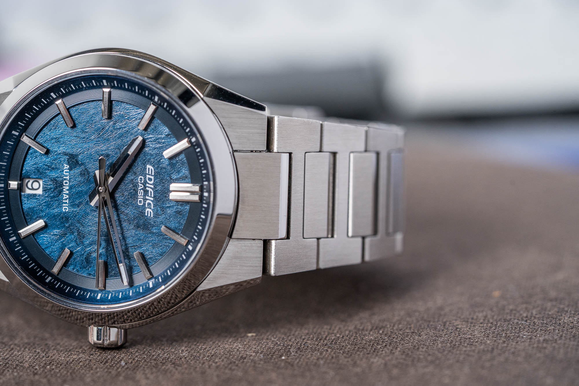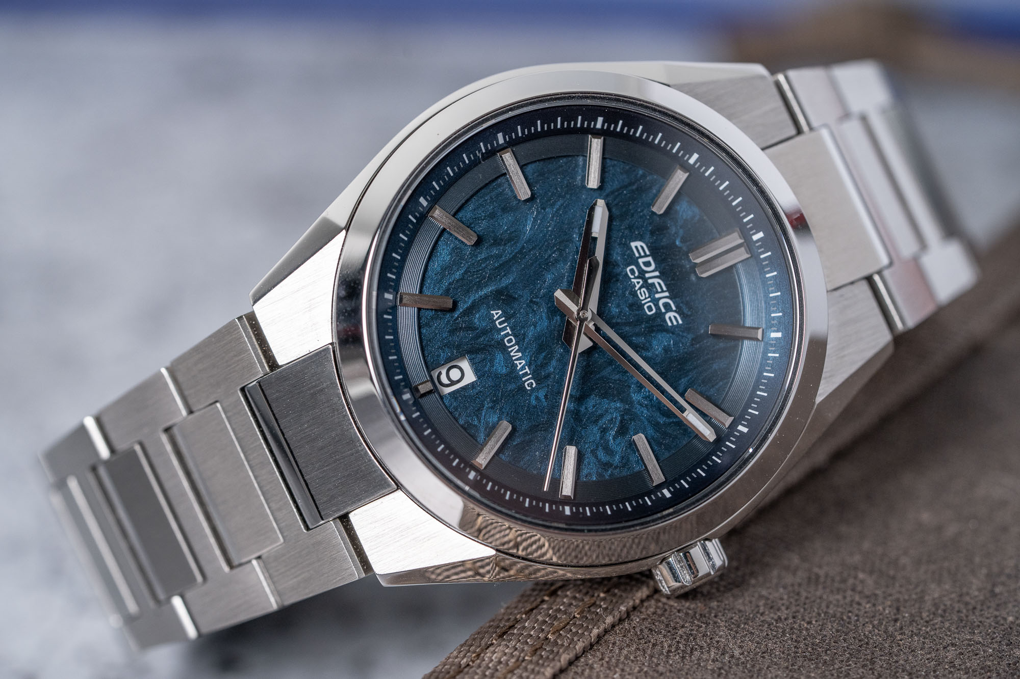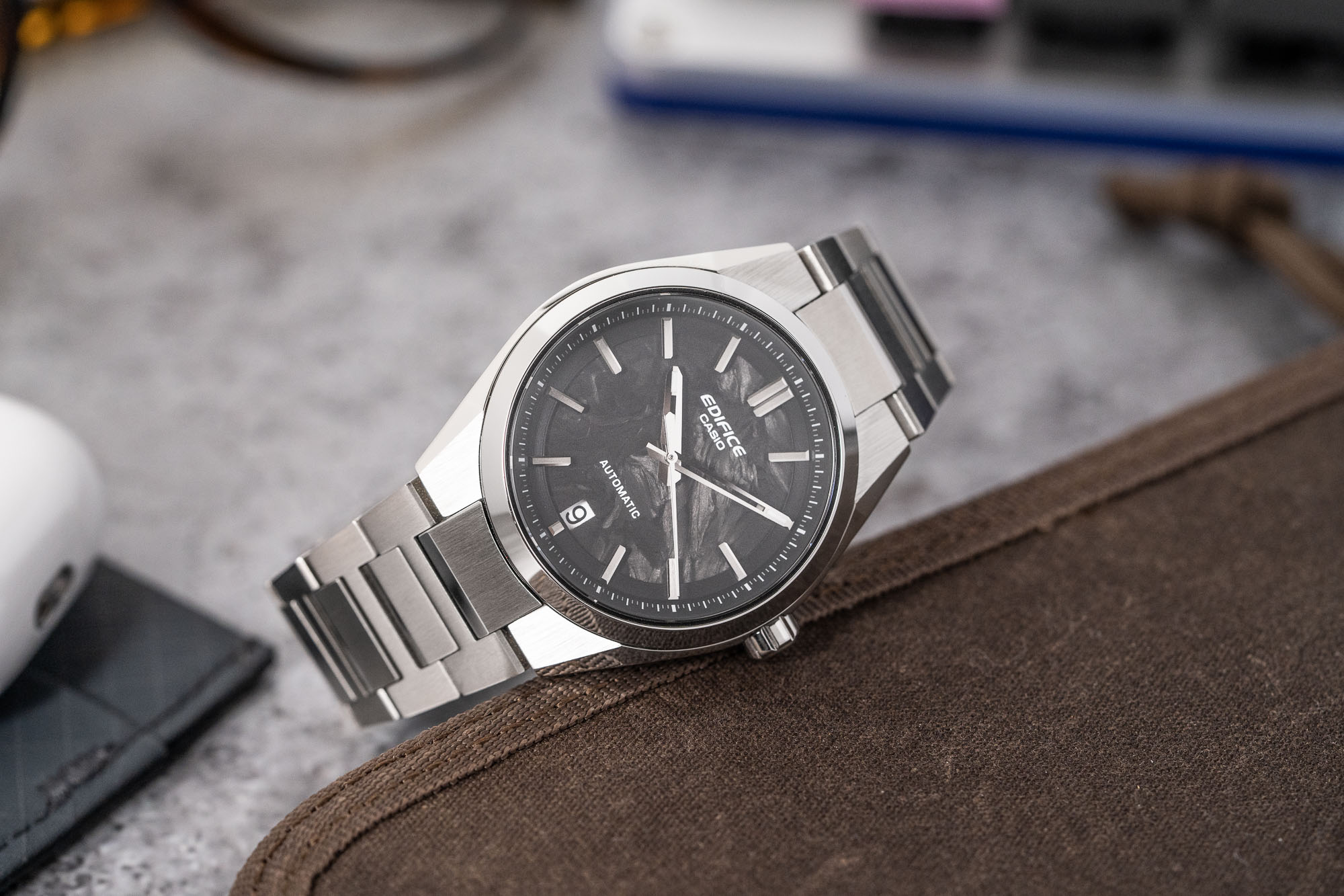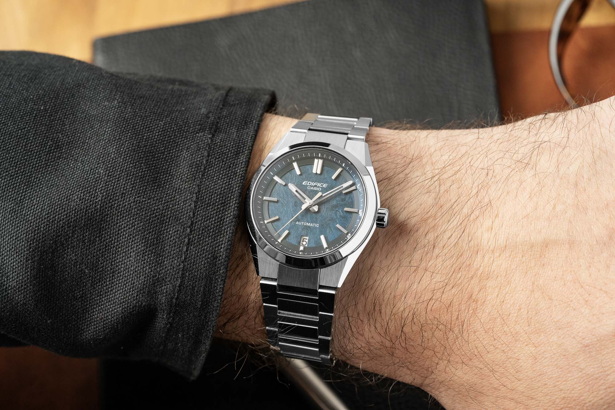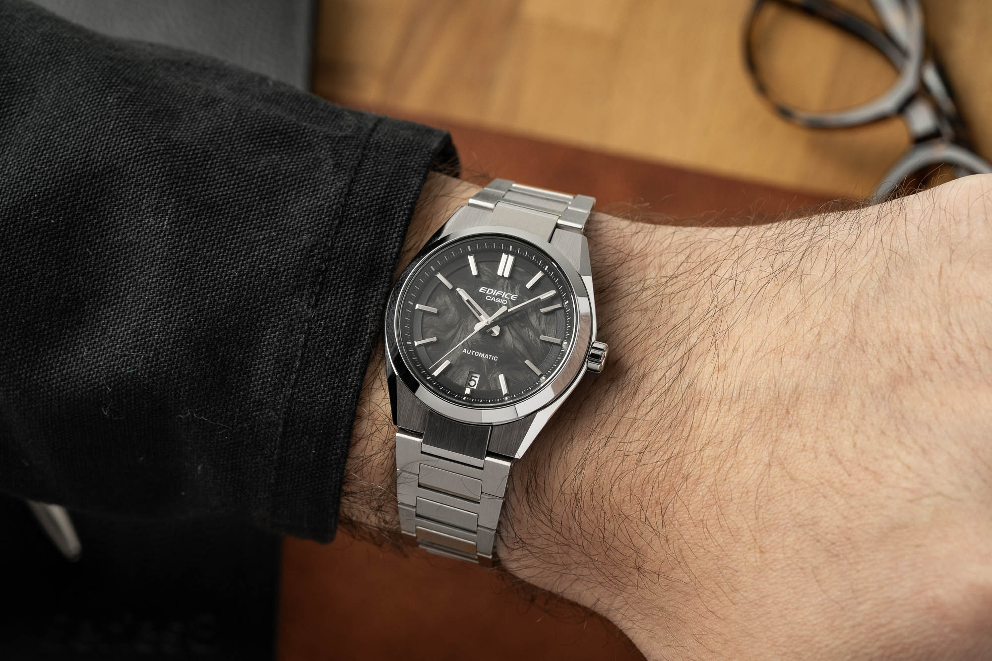 Available in three dial variants — the EFK-100CD-1A with a carbon-pattern black dial, the EFK-100D-7A with a brushed silver dial, and the EFK-100D-2A with a bold sunburst blue dial — each features applied indices, luminous sword-style hands, and a framed date window at 3 o’clock. The case measures a compact 39mm wide, with a 43.5mm lug-to-lug and 12.5mm thickness, hitting the sweet spot for all-day comfort and versatility.