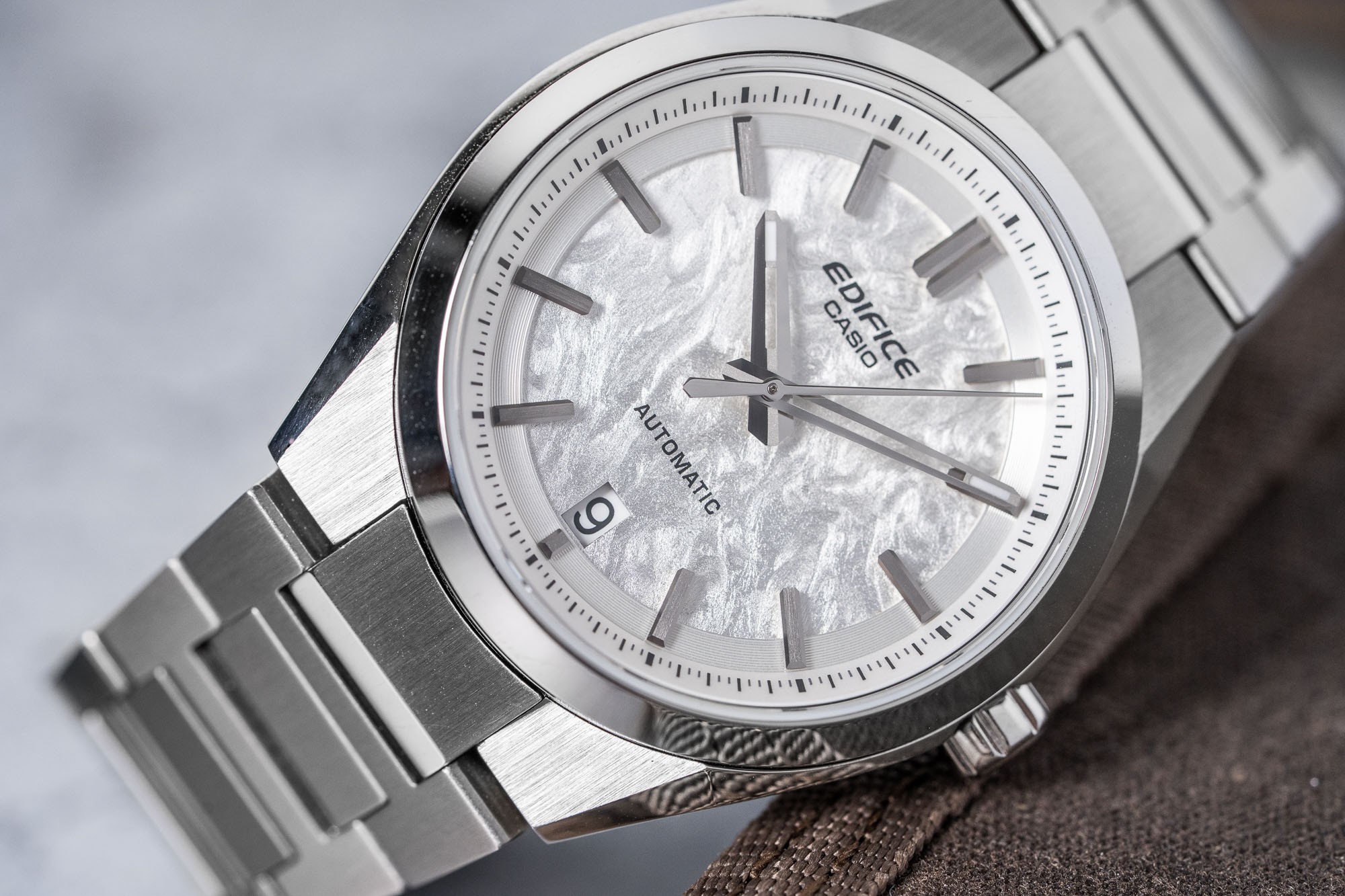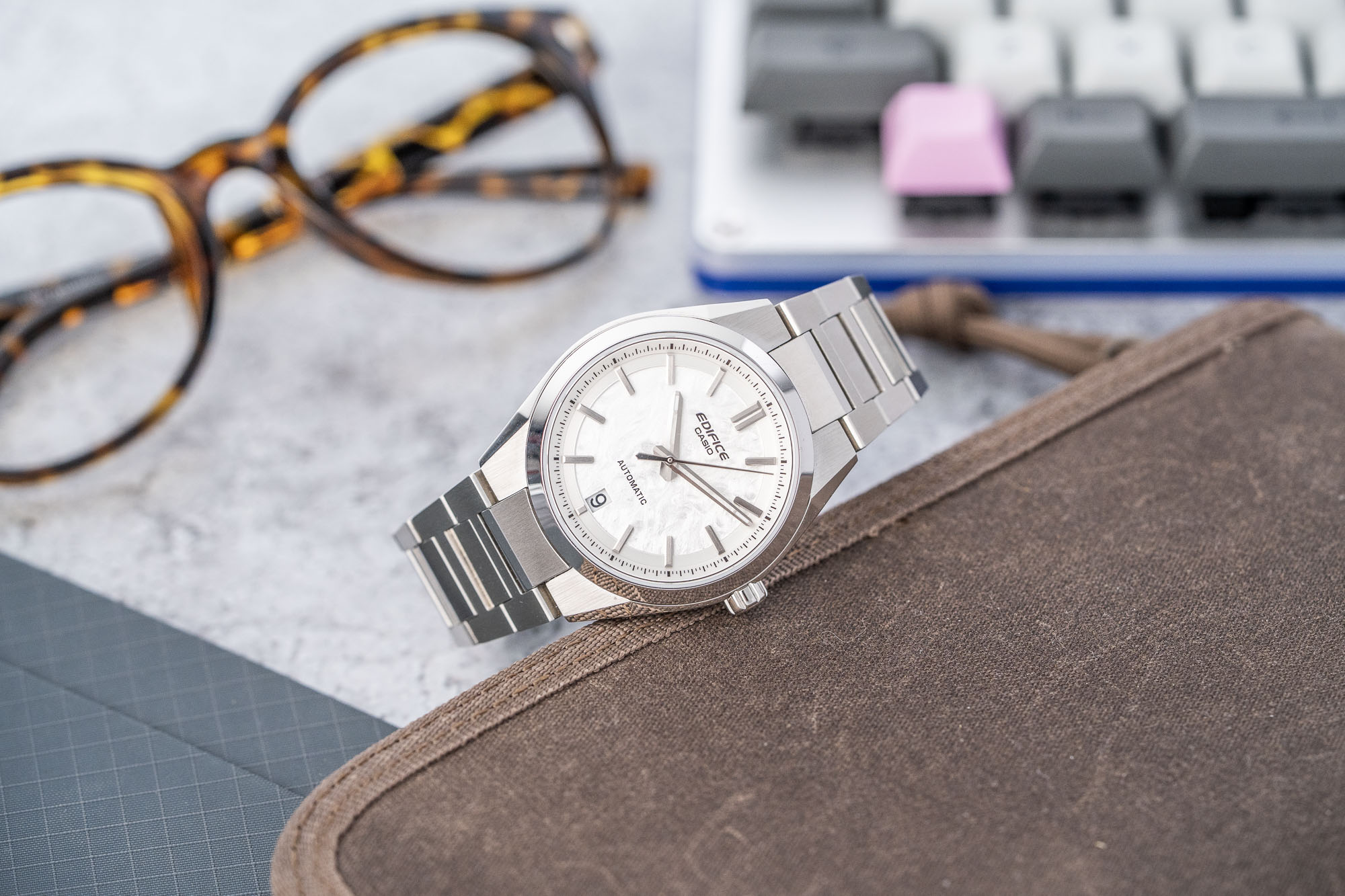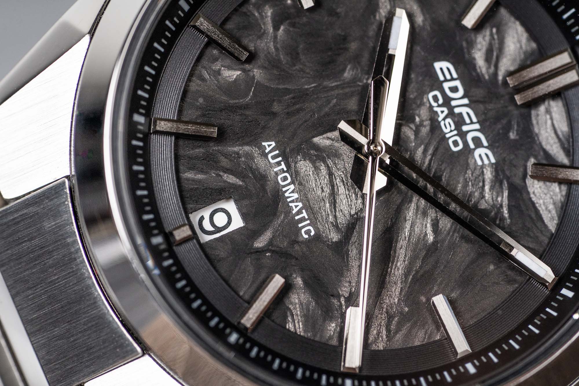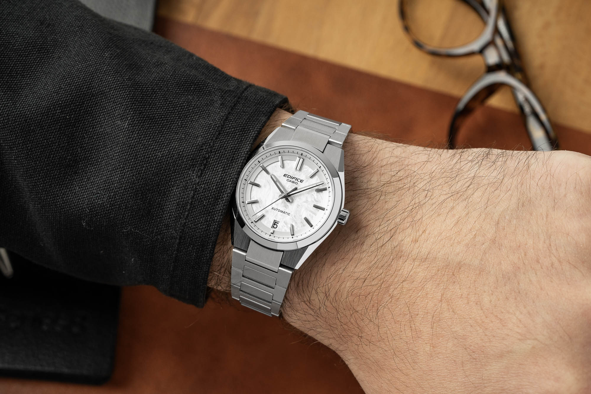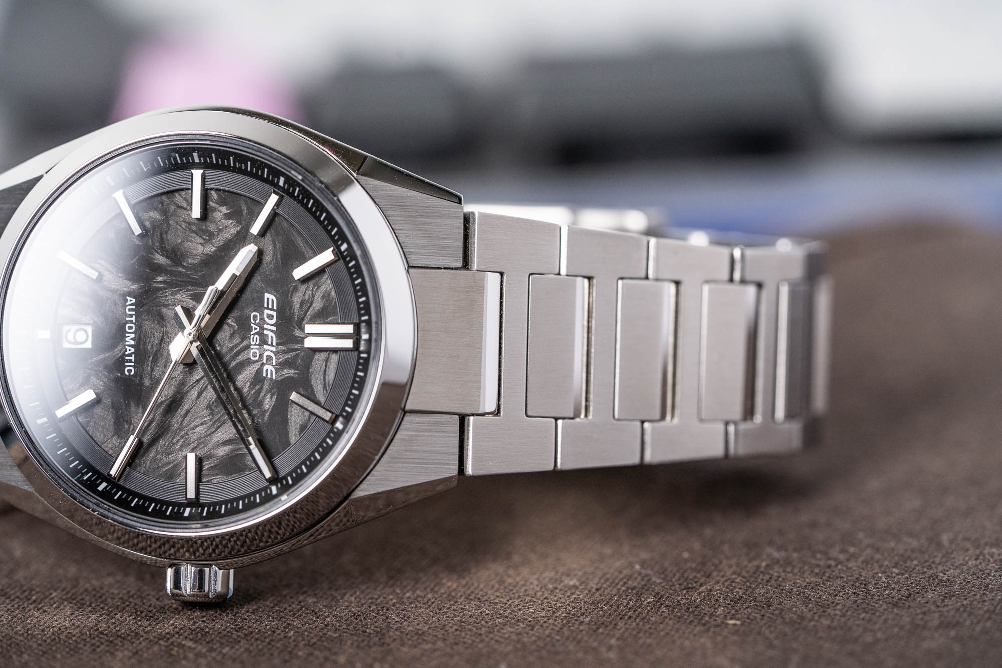 Available in three dial variants — the EFK-100CD-1A with a carbon-pattern black dial, the EFK-100D-7A with a brushed silver dial, and the EFK-100D-2A with a bold sunburst blue dial — each features applied indices, luminous sword-style hands, and a framed date window at 3 o’clock. The case measures a compact 39mm wide, with a 43.5mm lug-to-lug and 12.5mm thickness, hitting the sweet spot for all-day comfort and versatility.