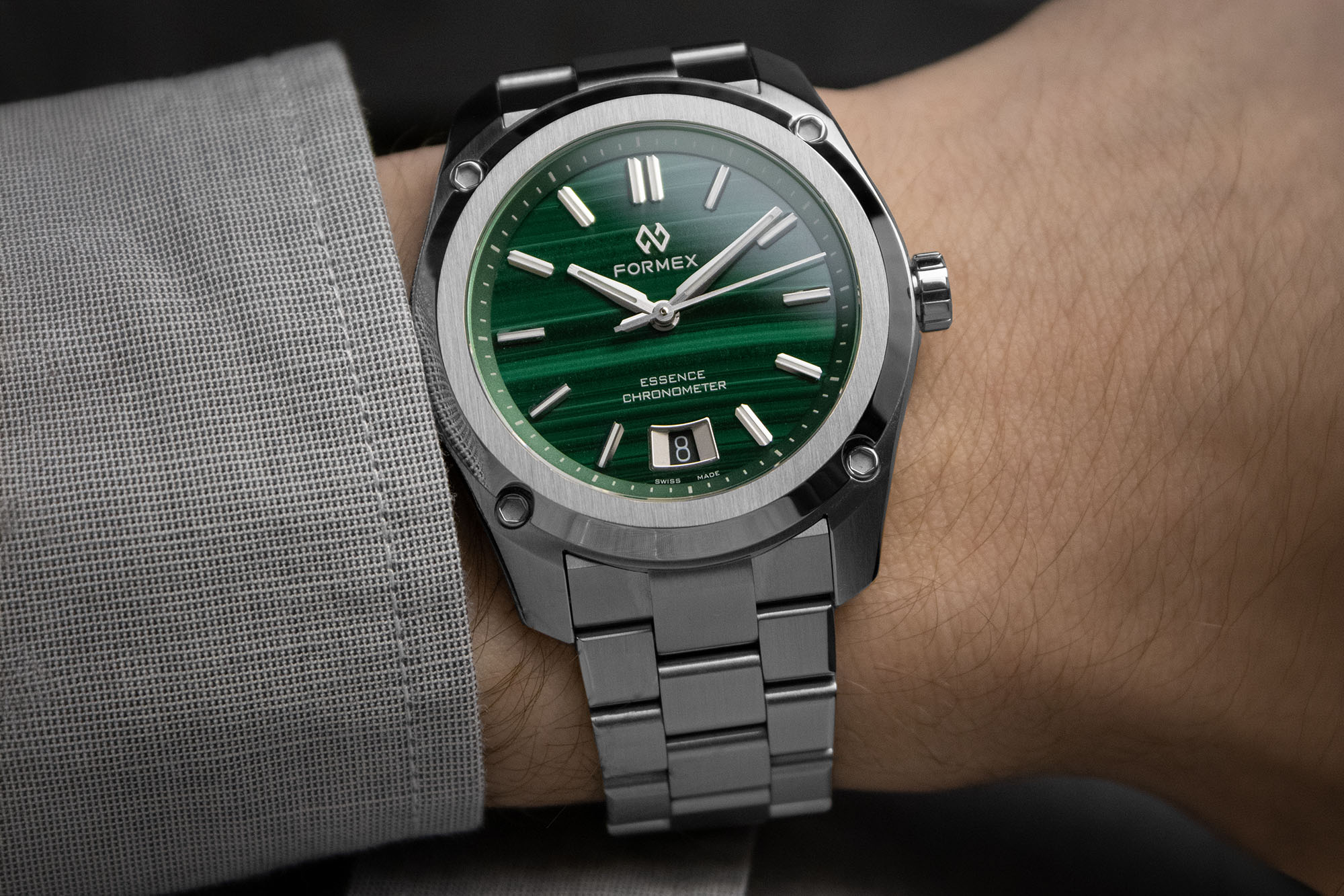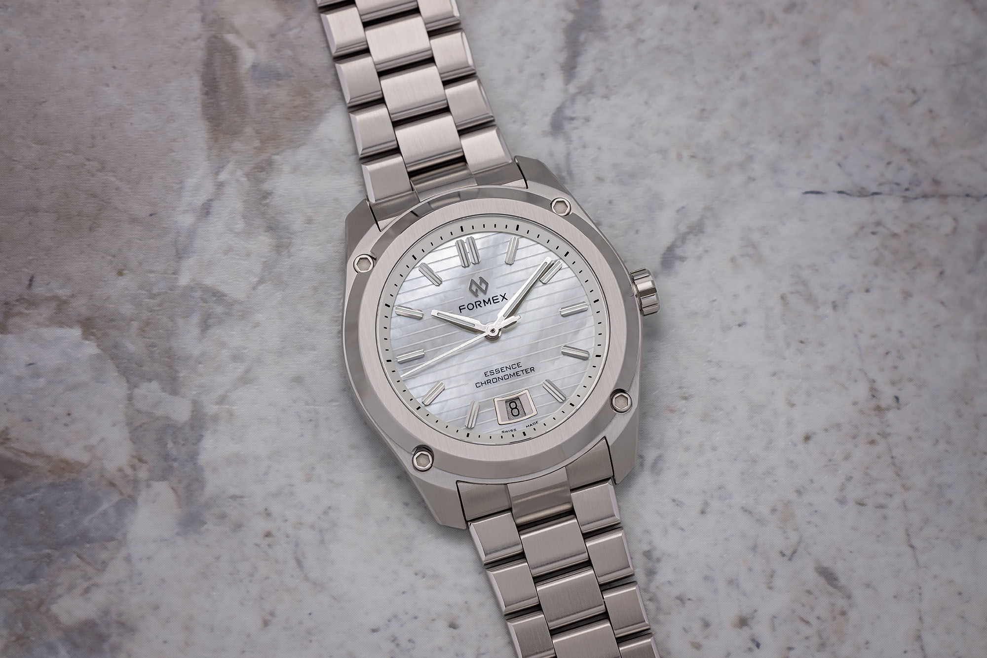 The Formex Essence ThirtyNine Automatic Chronometer Stone Dial Series represents a sophisticated fusion of high-precision Swiss engineering and natural artistry. This collection elevates the versatile 39mm Essence silhouette with dials crafted from rare, natural materials—ensuring that every individual timepiece possesses a unique visual signature. Despite their elegant appearance, these watches remain true to Formex’s tool-watch heritage, featuring the brand's patented Case Suspension System to provide superior shock protection and a adaptive, comfortable fit on the wrist.