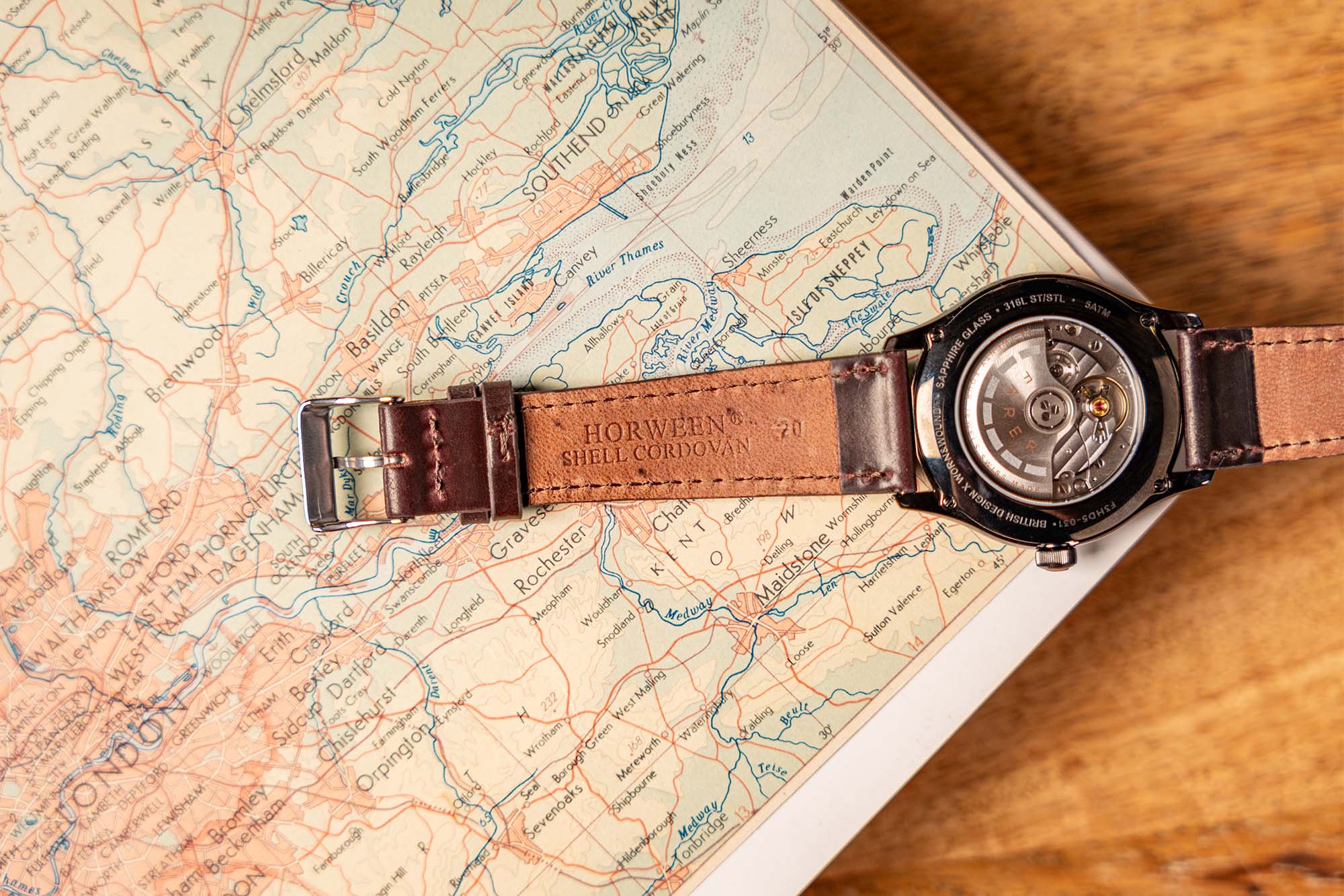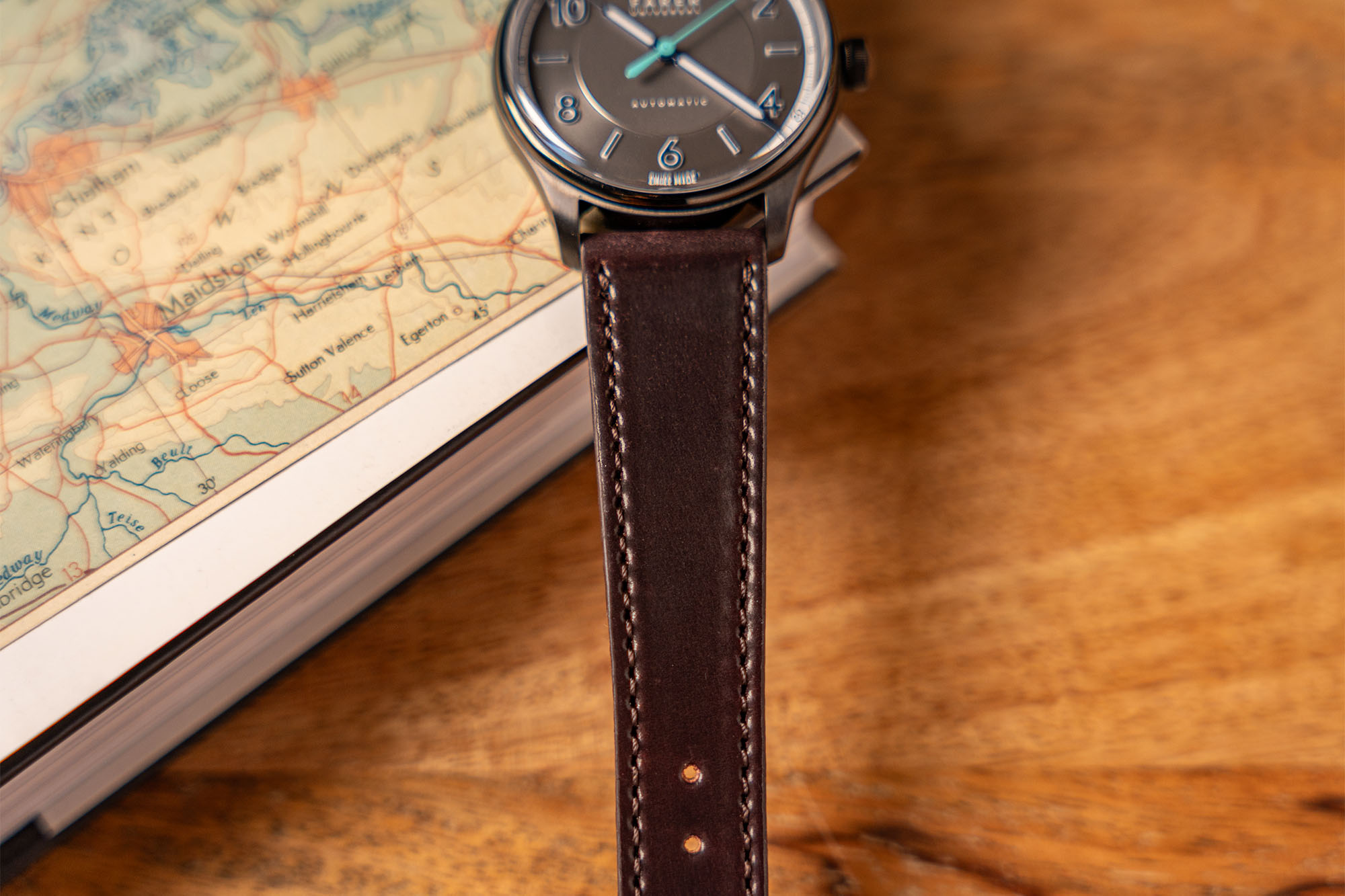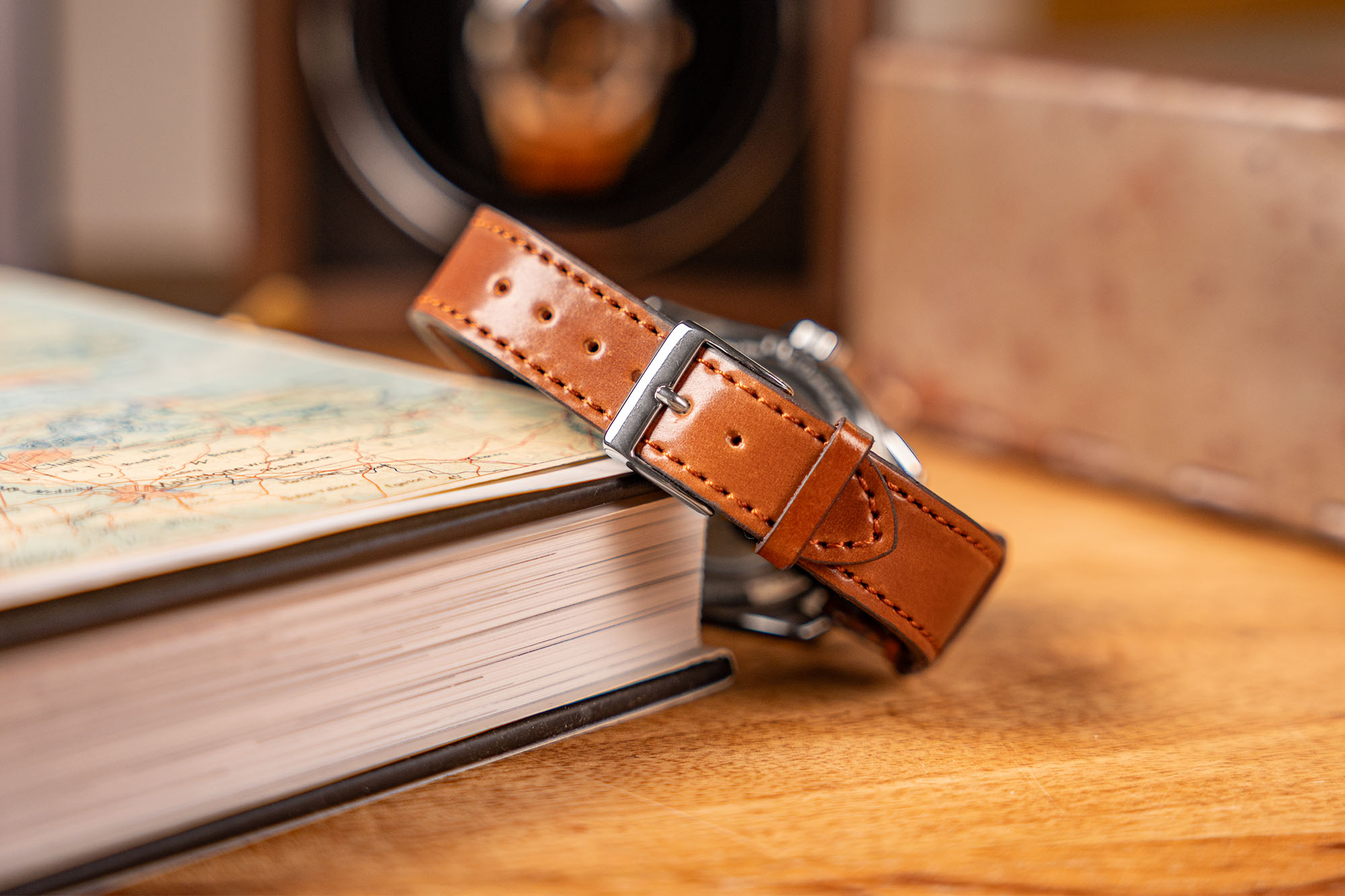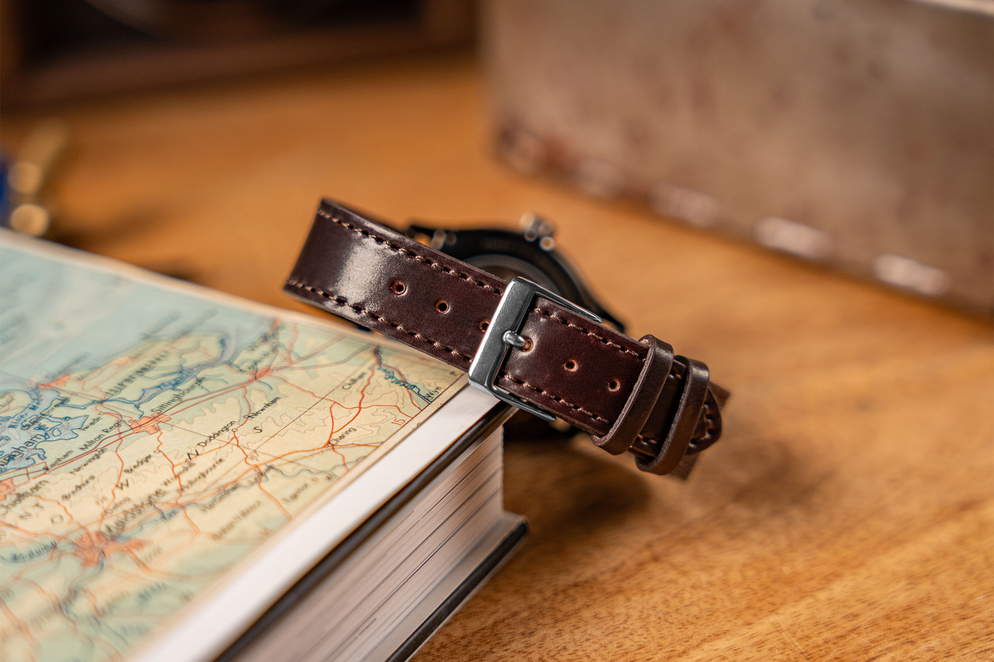 Shell cordovan is one of the rarest and most desirable leathers in the world. Produced from a layer of material located just over a horse’s hip, the result is a strong yet supple leather that does not crease. After a six-month tanning process, it develops a unique, rugged, rippling patina unlike anything else. Due to its strength, the straps can be made thin — these are just 2mm thick. Combined with color-matched stitching, the result is a robust and elegant strap, tapering down to a refined 16mm at the buckle to ensure comfort during wear on everything from a vintage dress watch to a scratched-up tool watch.