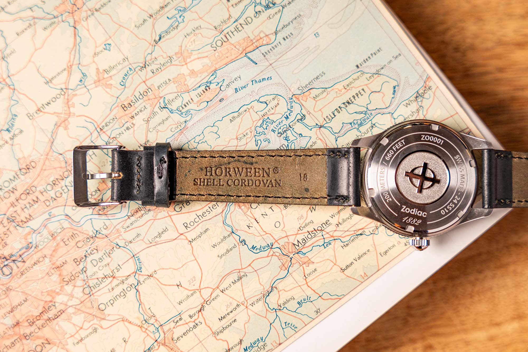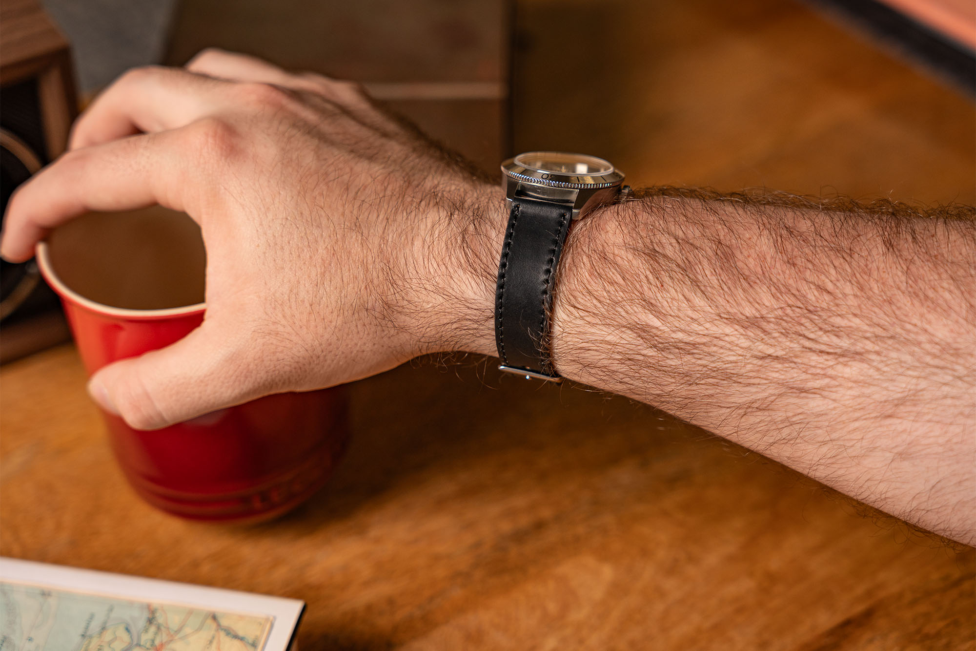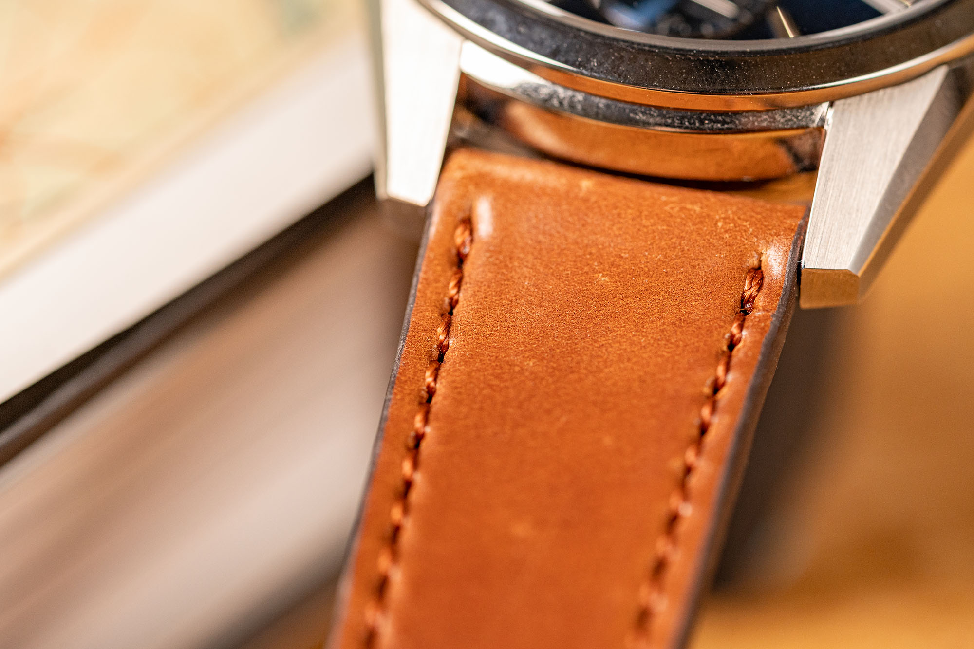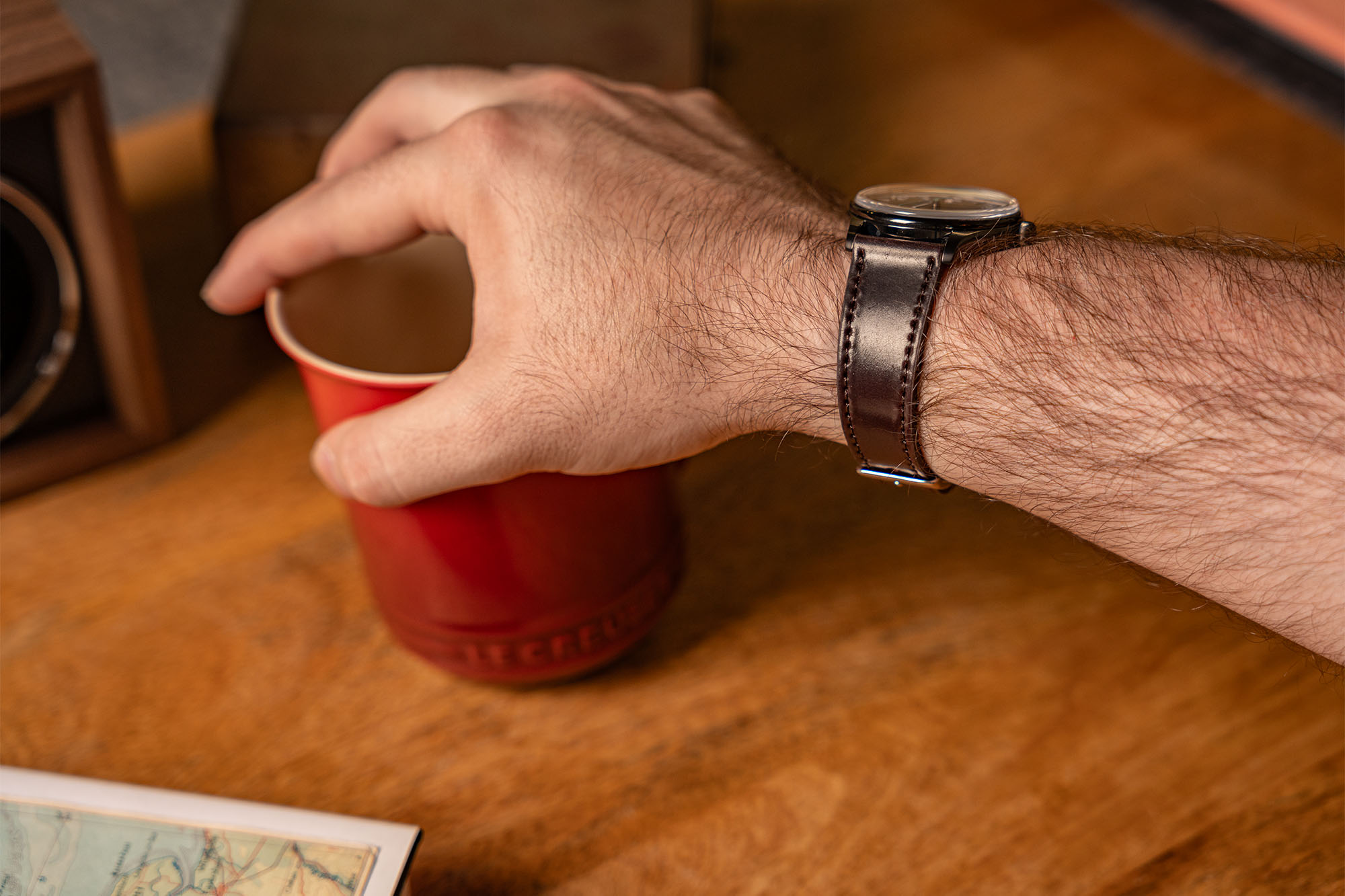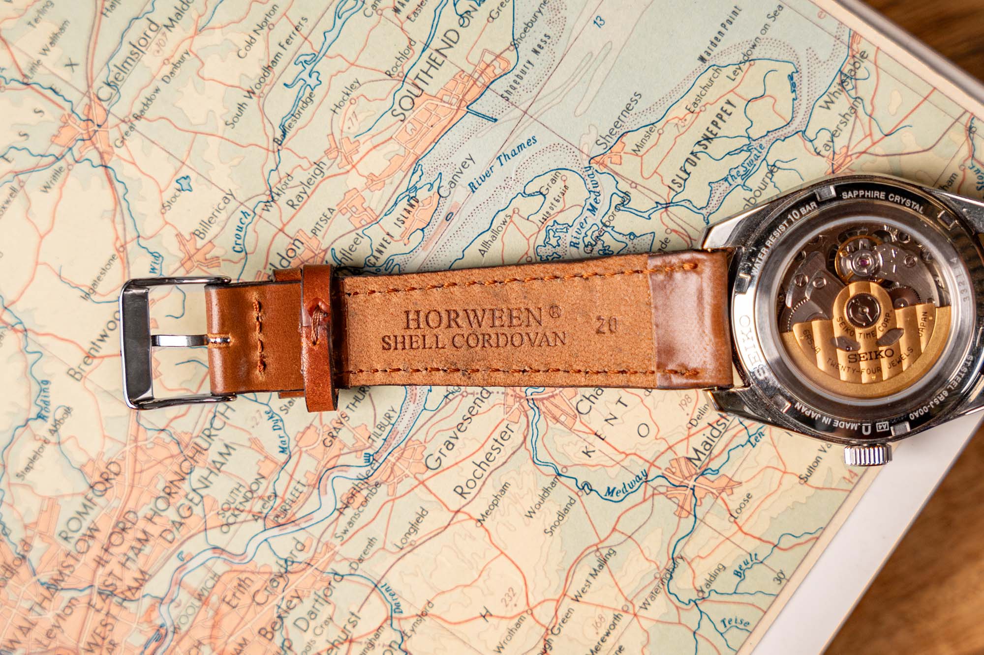 Shell cordovan is one of the rarest and most desirable leathers in the world. Produced from a layer of material located just over a horse’s hip, the result is a strong yet supple leather that does not crease. After a six-month tanning process, it develops a unique, rugged, rippling patina unlike anything else. Due to its strength, the straps can be made thin — these are just 2mm thick. Combined with color-matched stitching, the result is a robust and elegant strap, tapering down to a refined 16mm at the buckle to ensure comfort during wear on everything from a vintage dress watch to a scratched-up tool watch.