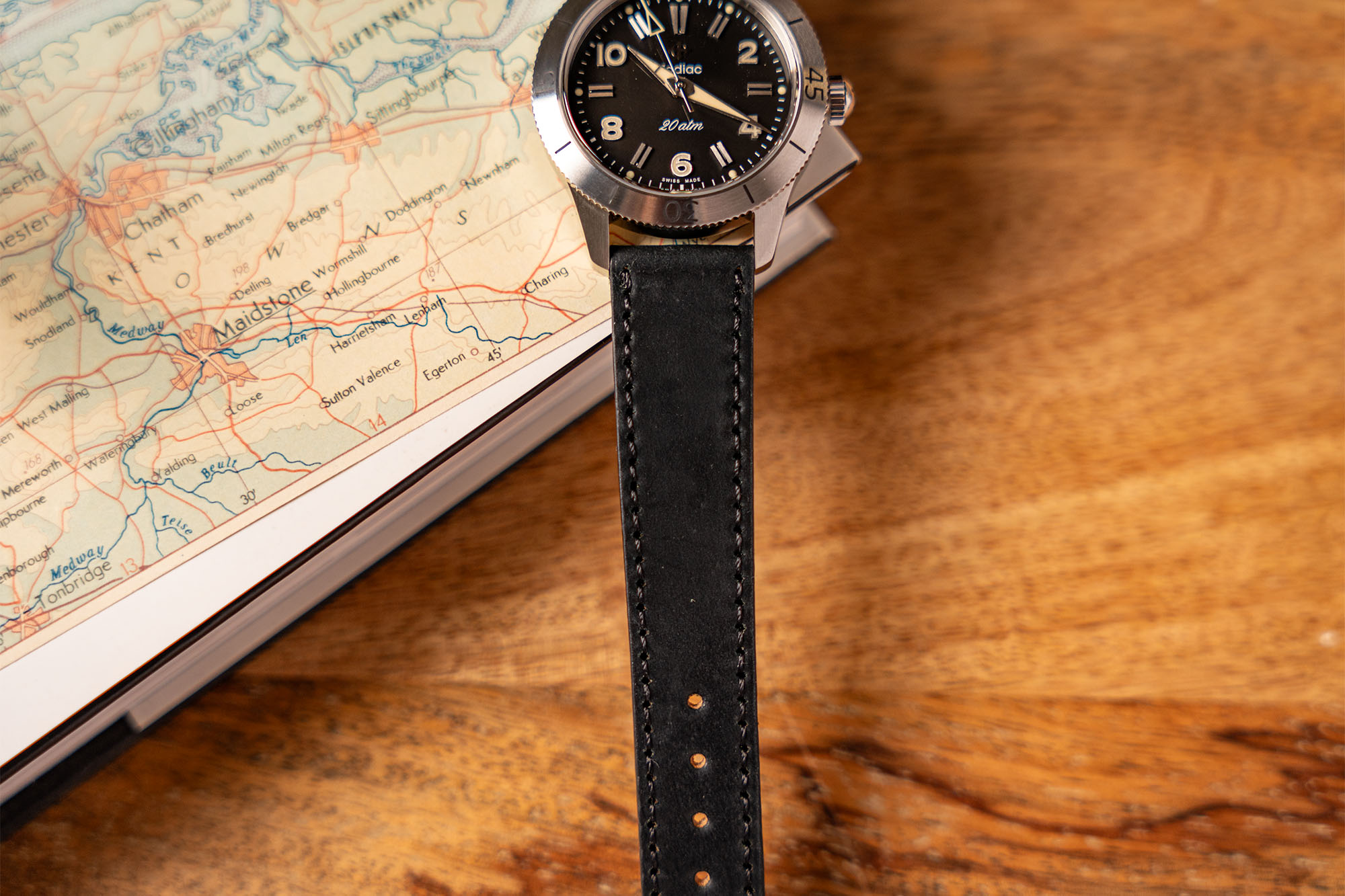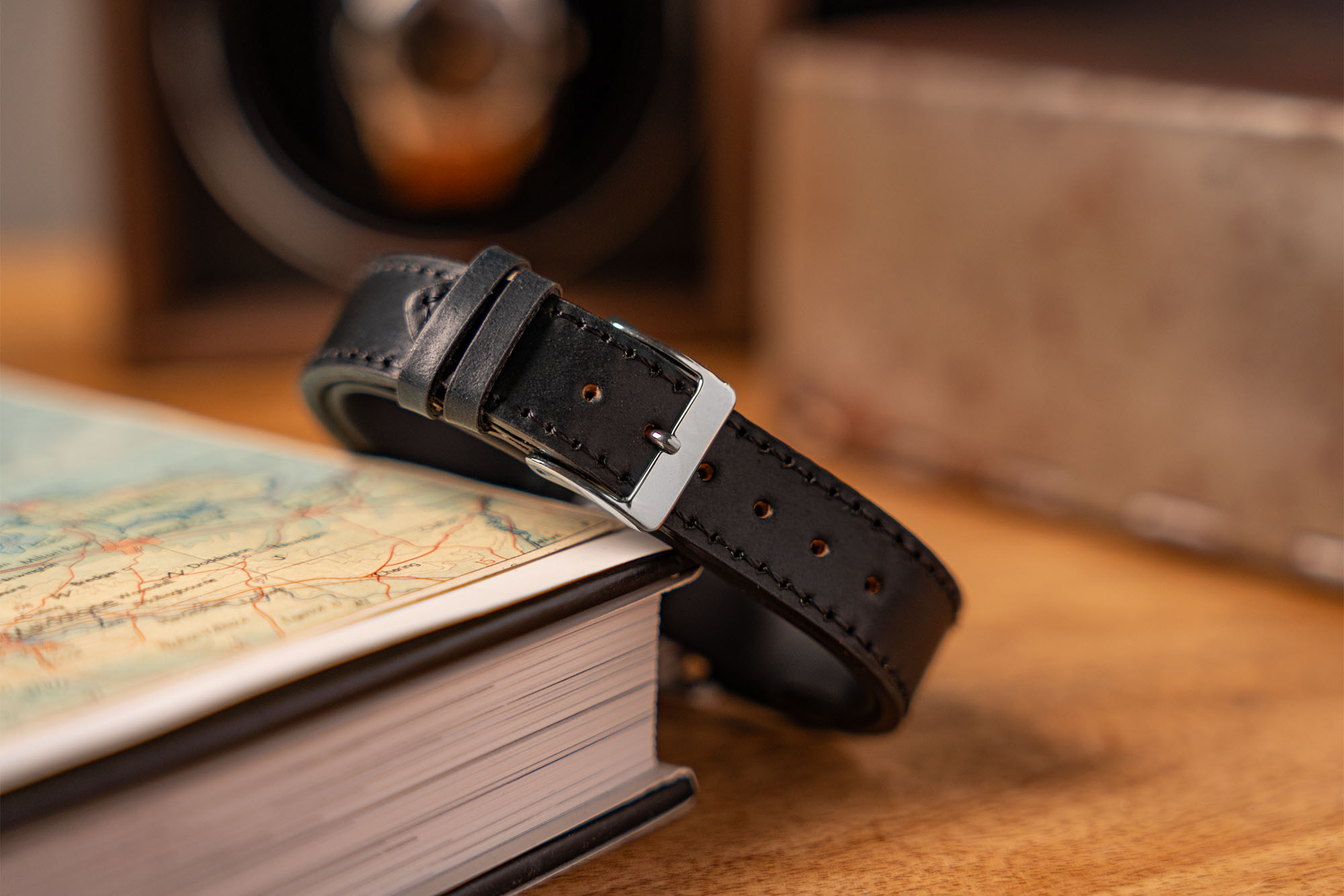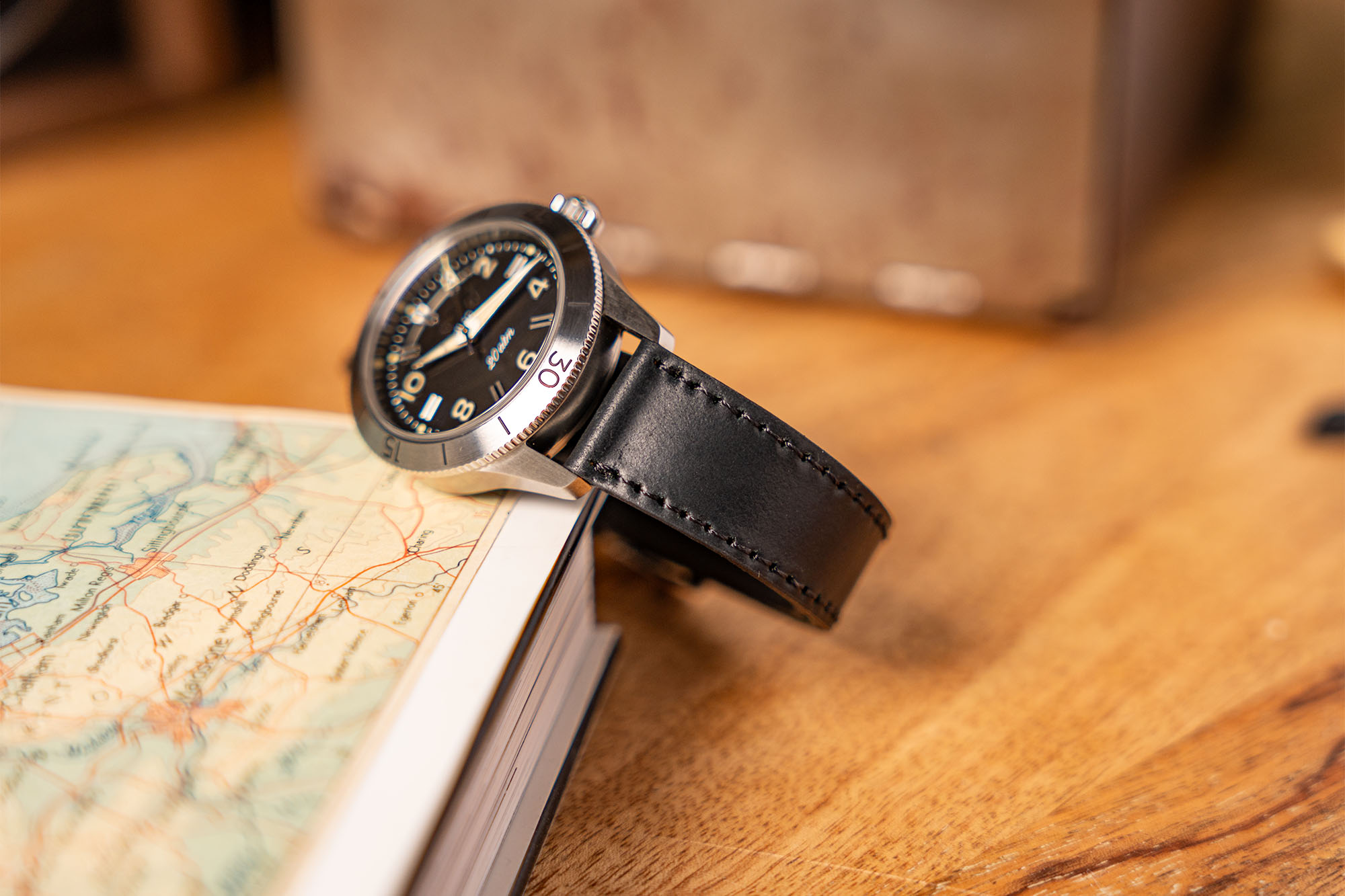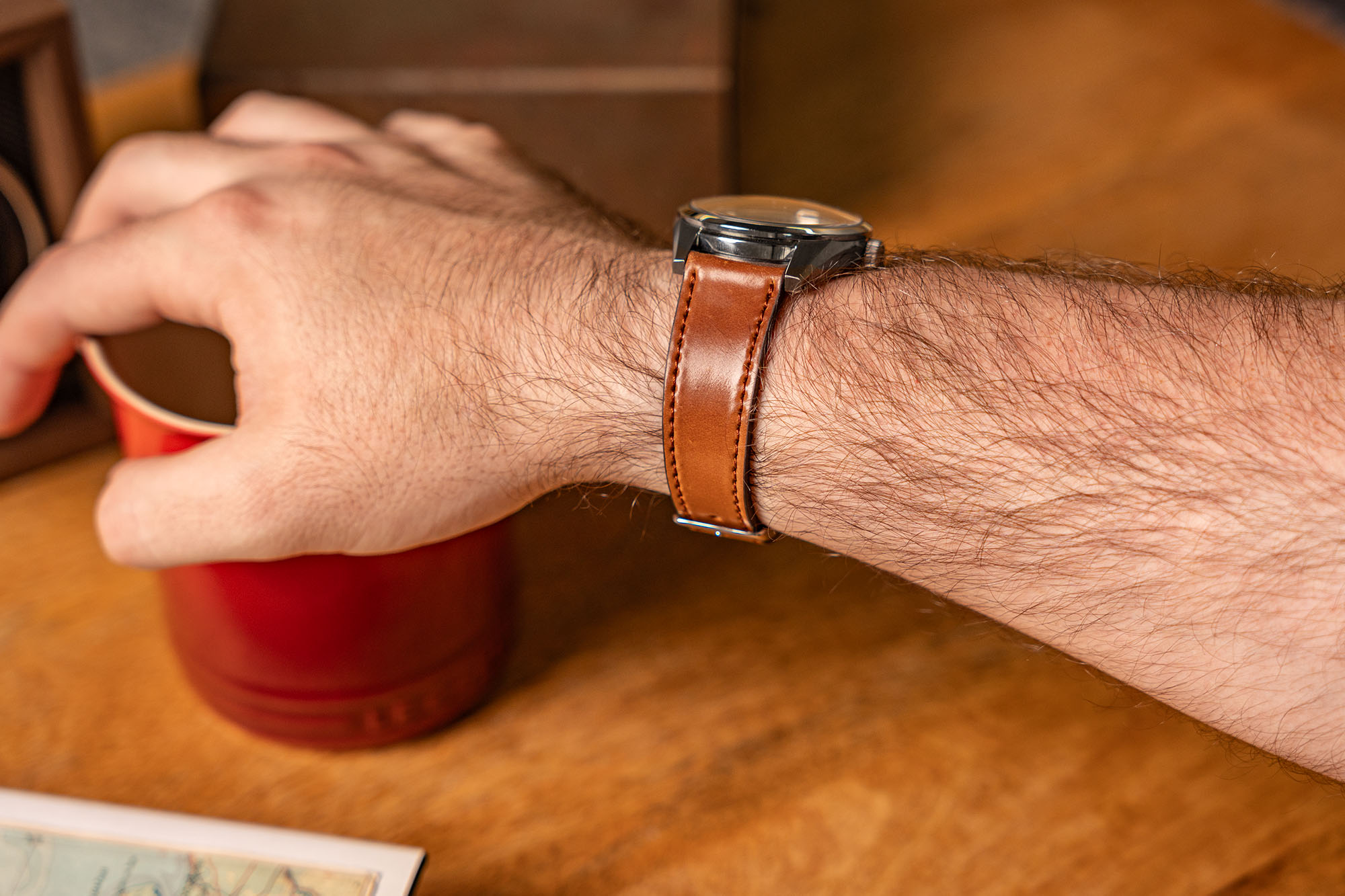 Shell cordovan is one of the rarest and most desirable leathers in the world. Produced from a layer of material located just over a horse’s hip, the result is a strong yet supple leather that does not crease. After a six-month tanning process, it develops a unique, rugged, rippling patina unlike anything else. Due to its strength, the straps can be made thin — these are just 2mm thick. Combined with color-matched stitching, the result is a robust and elegant strap, tapering down to a refined 16mm at the buckle to ensure comfort during wear on everything from a vintage dress watch to a scratched-up tool watch.