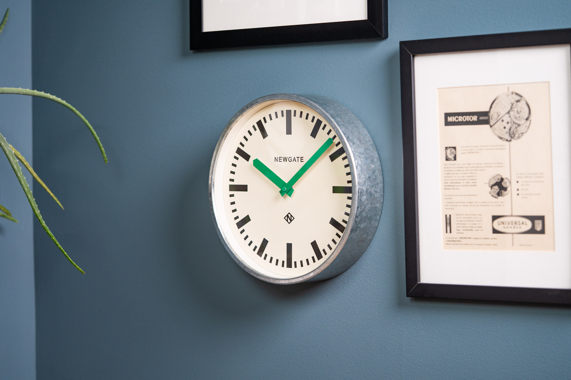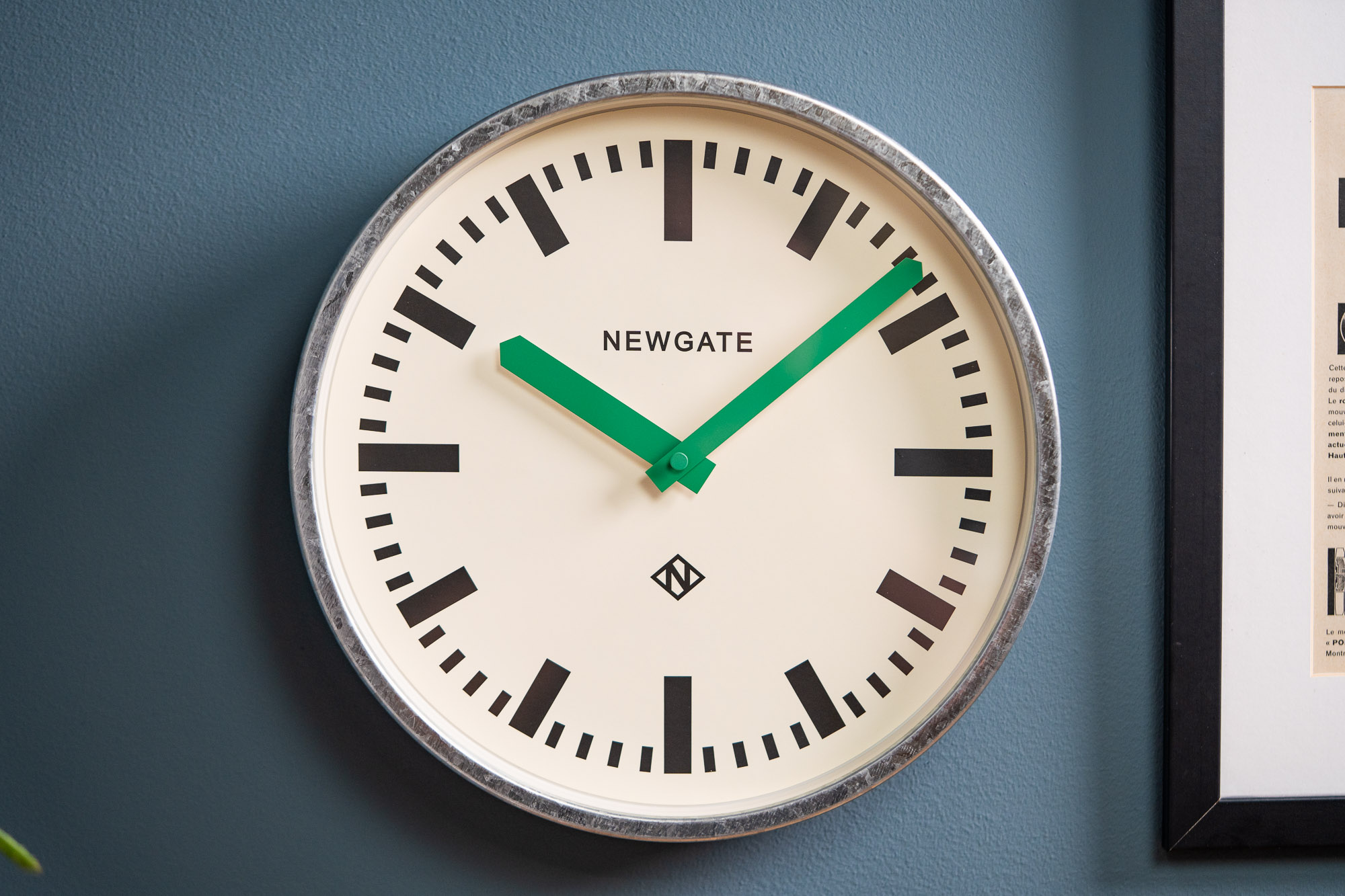 A modern take on a mid-century classic, the Newgate Luggage 12" Wall Clock channels the charm of vintage railway station clocks with a bold, industrial edge. Featuring a galvanized metal frame, contemporary green hands, and a clean marker dial, this timepiece blends effortlessly into industrial, retro, or minimalist interiors.
