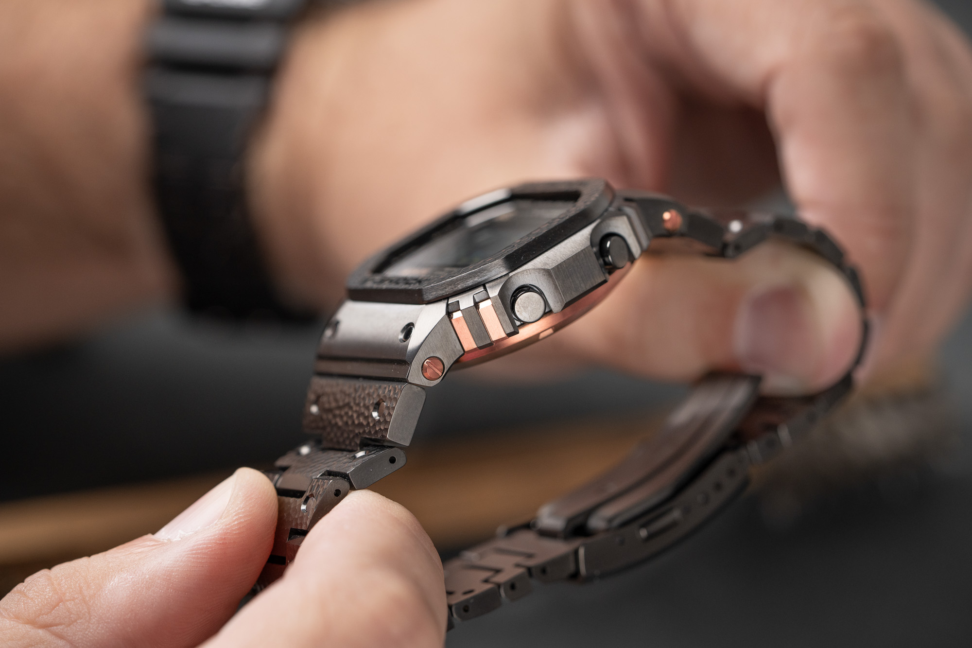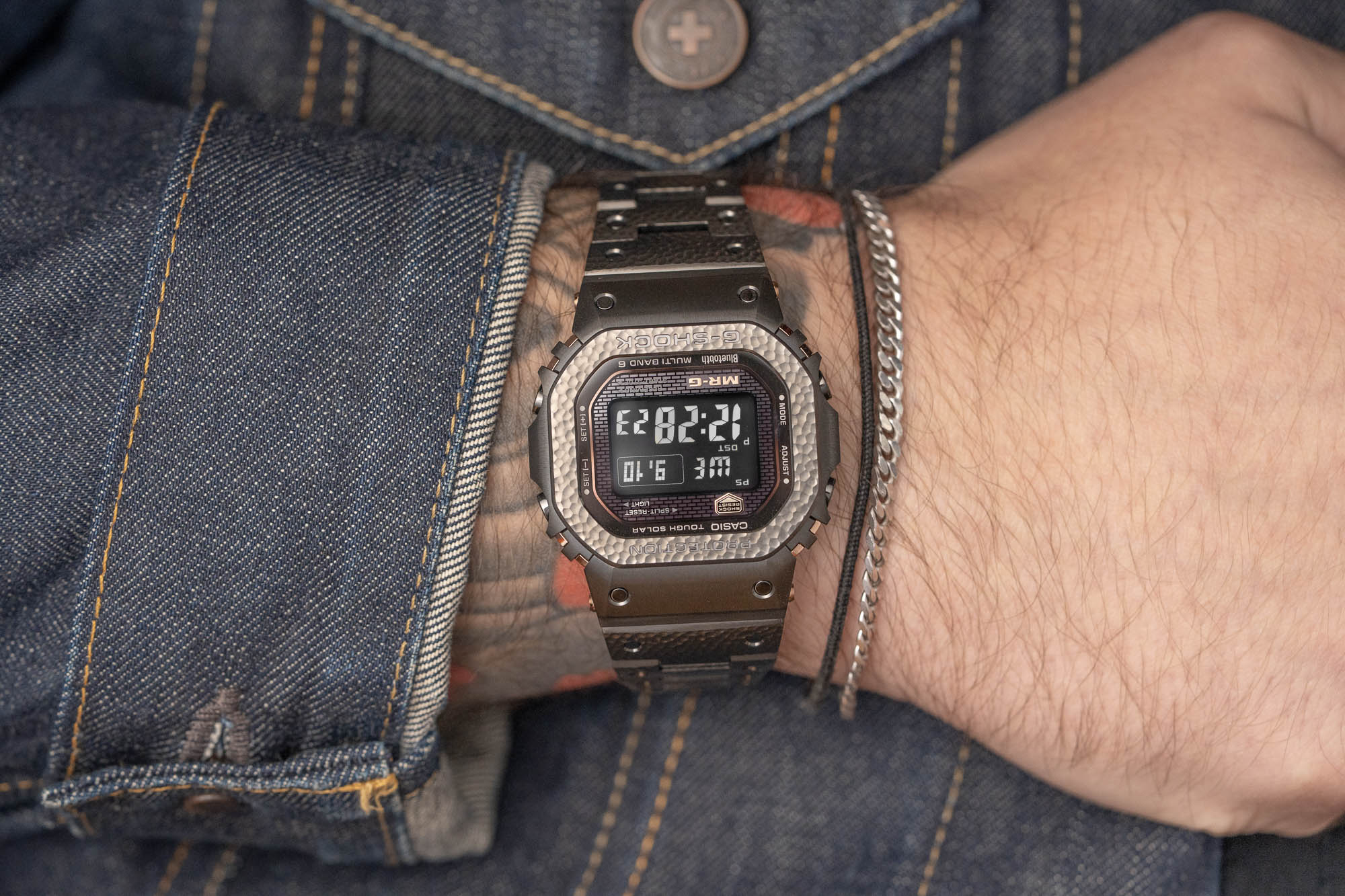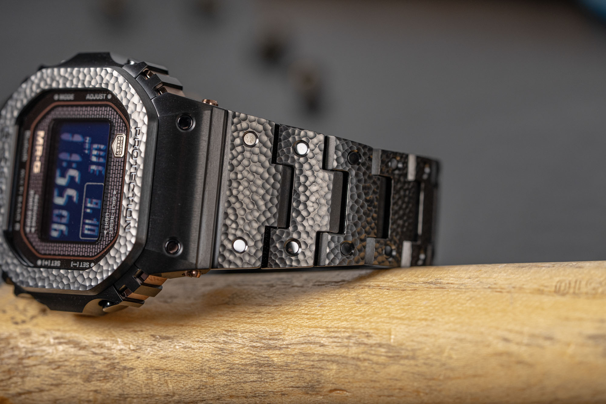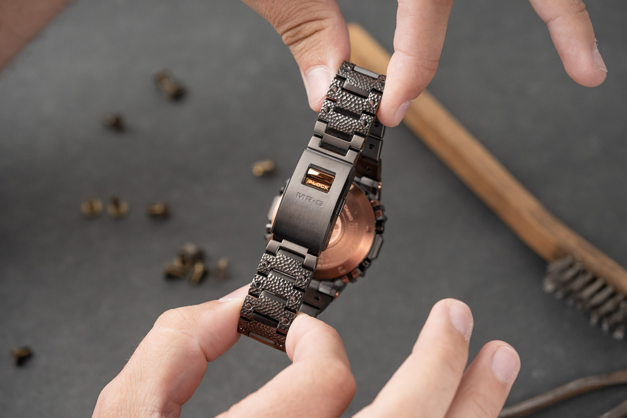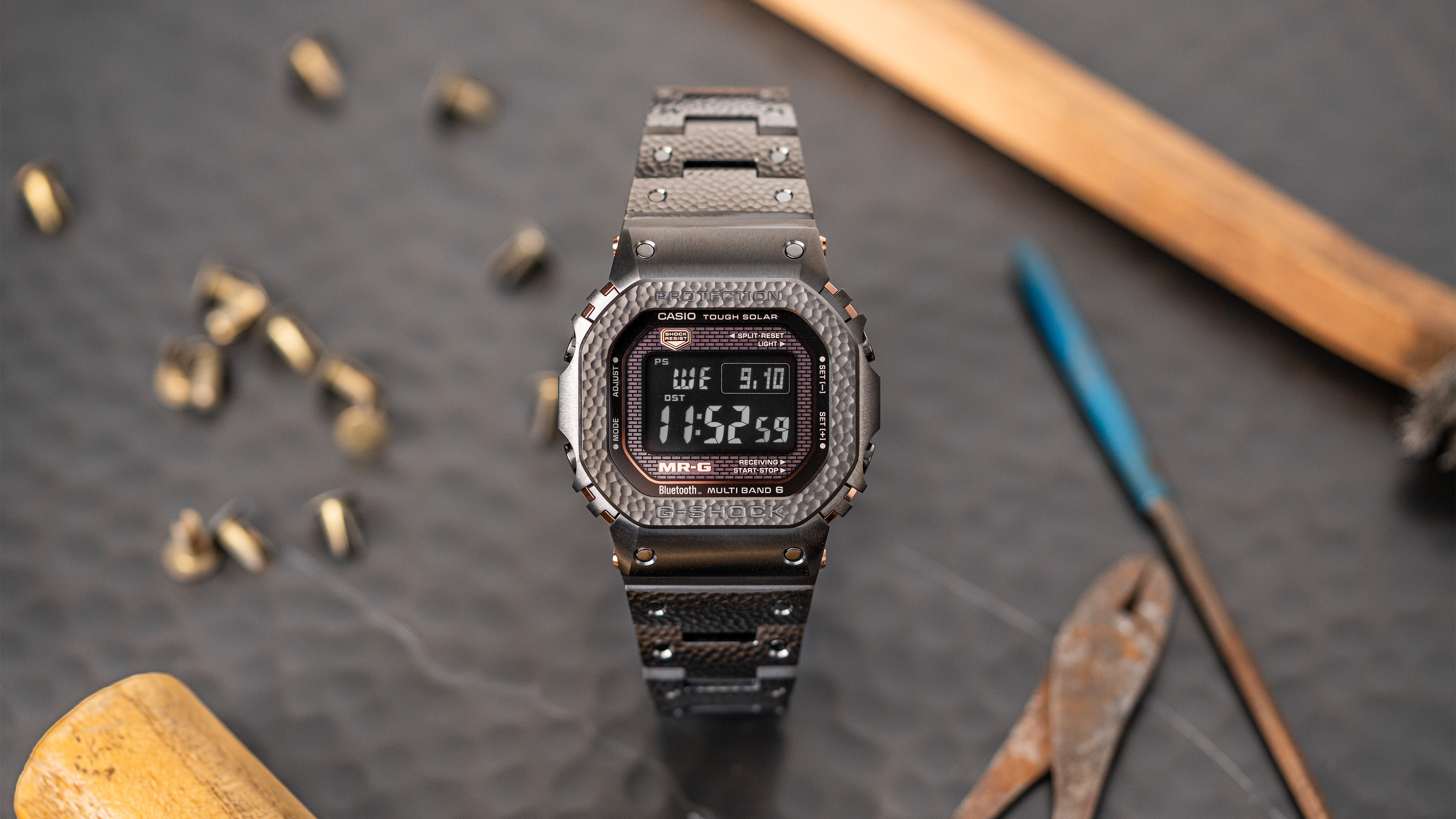 The iconic square profile of the original 1983 G‑SHOCK reaches its pinnacle with the MRG‑B5000HT‑1, a timepiece that merges traditional Japanese metalwork with next-generation engineering. Built at Casio’s Premium Production Line in Japan, this limited-edition MR‑G is finished with a hand-hammered “tsuiki” bezel and bracelet—each one individually crafted by master metalsmith Kazuya Watanabe. The process ensures that every watch features a one-of-a-kind “yuragi” pattern, connecting wearer to maker in an intimate and tactile way.