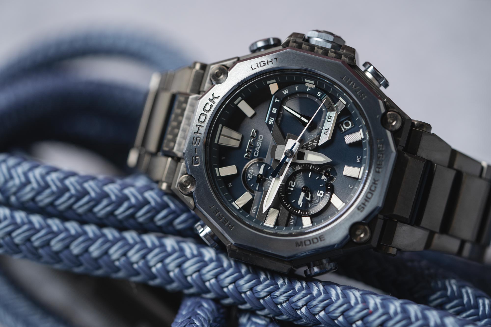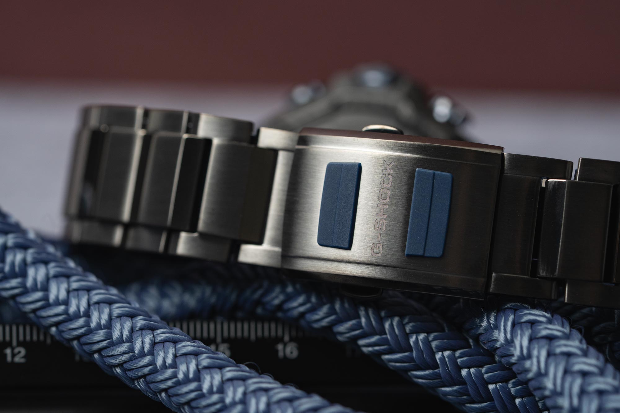 Measuring 49.8mm across, 55.1mm lug-to-lug, and 15.9mm thick, the case is sculpted for wrist presence and durability. The stainless steel bezel is finished in blue-gray ion-plating, and frames a multi-layered analog dial. Sub-dials track a secondary time, day/date, 24hr time and chronograph functions, all protected under a sapphire crystal with anti-reflective coating.